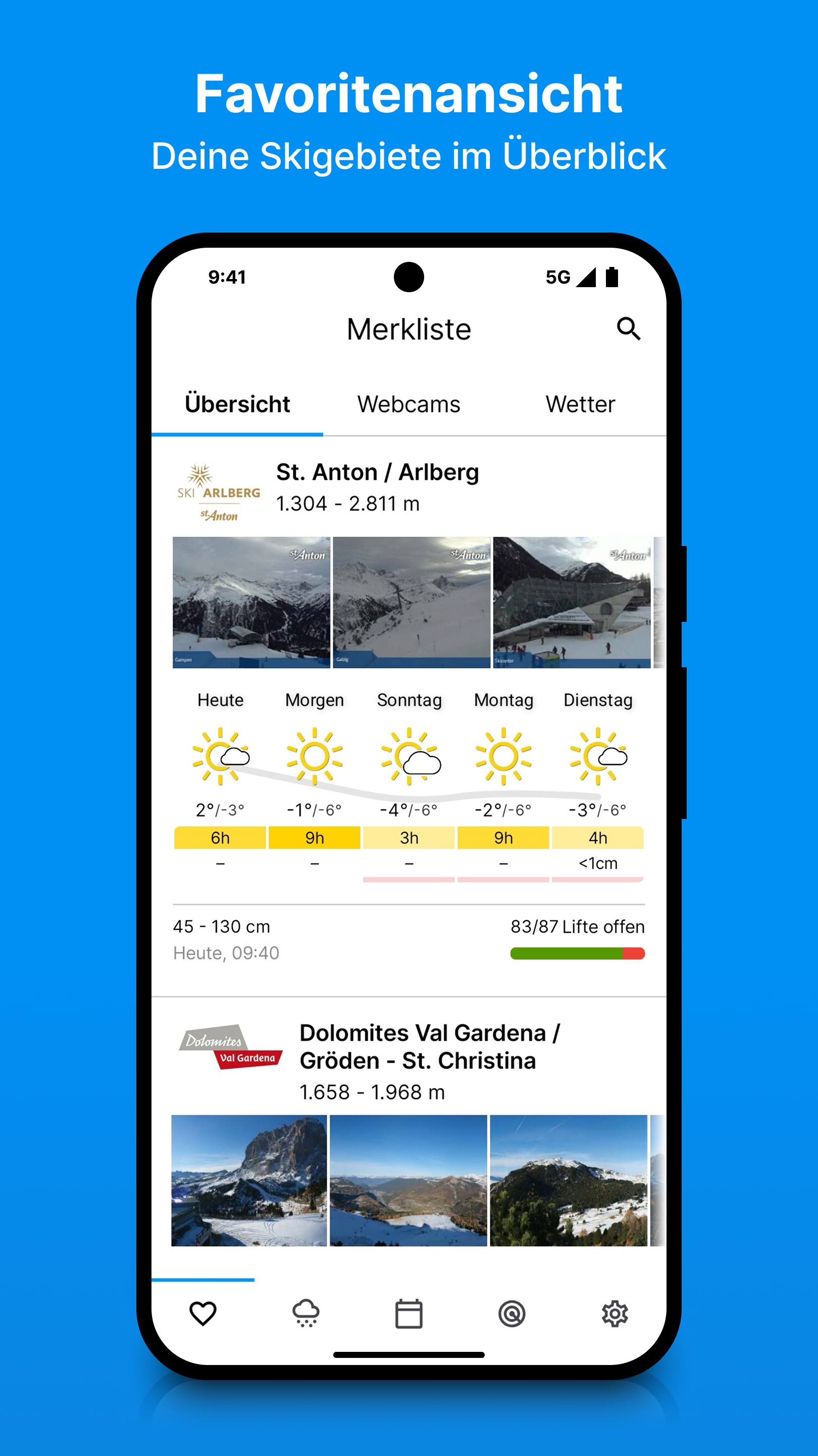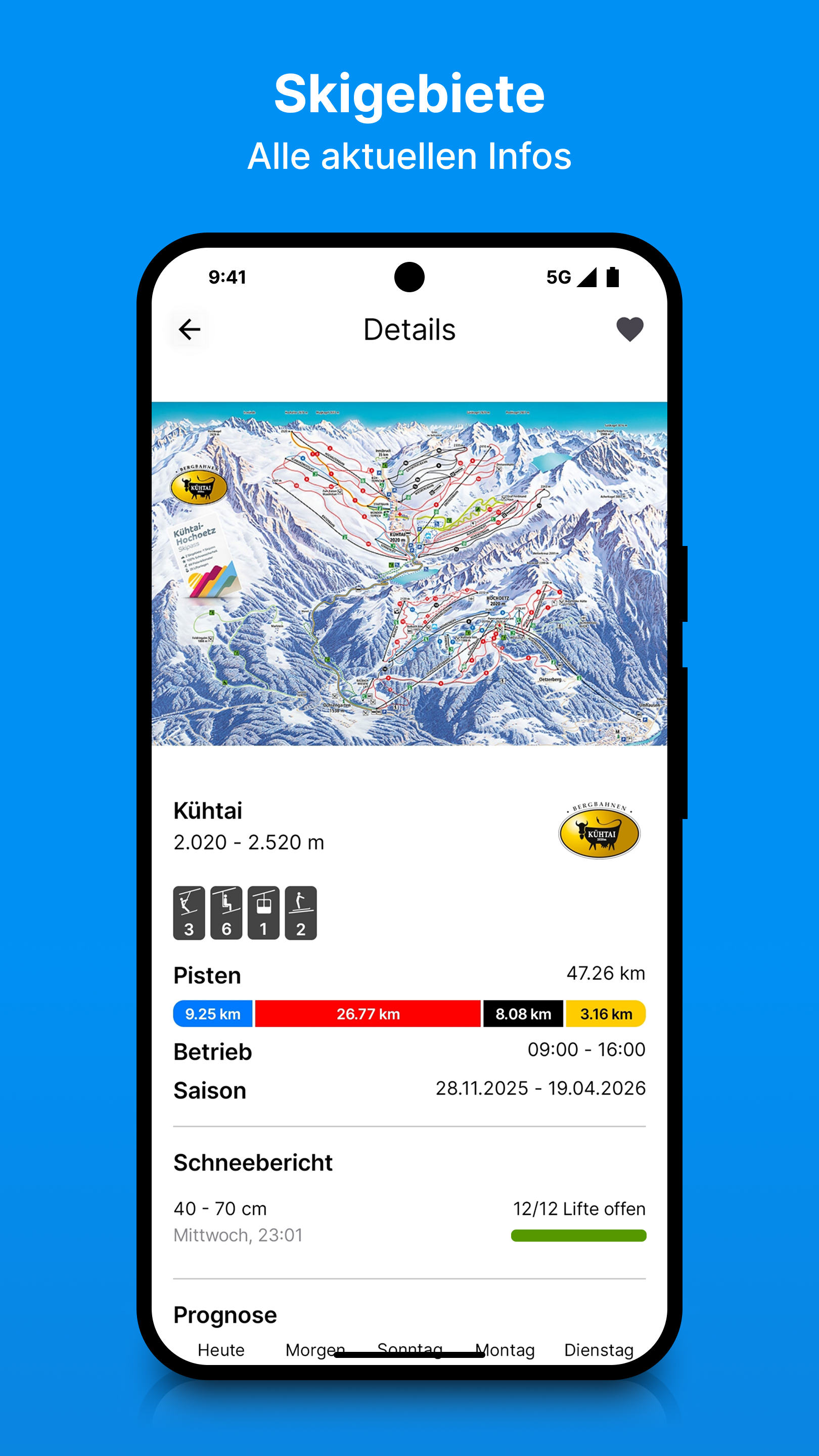 bergfex: Ski, Schnee & Wetter - Die ultimative Wintersport-App Die bergfex: Ski, Schnee & Wetter App liefert dir detaillierte Informationen zu allen Skigebieten in Österreich, Schweiz, Deutschland, Italien, Frankreich, Slowenien, Polen, Tschechien, Slowakei und Kroatien. Informiere dich über Schneehöhen, Wetter, Webcams, Pistenpläne, Unterkünfte, uvm. • Favoritenübersicht - alle Lieblingsskigebiete auf einen Blick • Schneehöhen und Schneeberichte der Skigebiete (täglich aktualisiert) • Informationen zu offenen und geschlossenen Liftanlagen und Pisten • 9 Tages Wettervorhersage in 3 Stunden Abstufung inkl. Schneevorhersage • Kurzzeitprognose der nächsten 6 Stunden, alle 30 Minuten aktualisiert (Alpenraum) • Wetter Vorhersagekarte für die nächsten Stunden (Niederschlag/Temperatur) • Pistenpläne in hoher Auflösung • Skipass Preise • aktuelle Berg- und Taltemperaturen im jeweiligen Skigebiet • über 5.000 Webcams und Panoramakameras, über 200 Video-Webcams • umfangreiche Detailinformationen zu allen Skigebieten • Kontaktinformationen • Skiverleih • bergfex Unterkünfte/Hotels • Verlinkung zu Lawinenwarndiensten Mehr Features, mehr Schwung – hol dir das bergfex PRO-Abo: • Keine Werbung • Widgets (mehrere Widgets für verschiedene Skigebiete möglich) • Schneevorhersagekarten in 6 Stunden Abstufungen • Schneeanalysekarten der letzten 7 Tage (Analyse der gefallenen Schneemenge) • Webcamarchiv (Rückblick) • Lehrvideos (auch offline verfügbar) für Carving, Tiefschnee, Buckelpiste und Snowboard • Wetterberichte in Textform für Österreich (GeoSphere Austria) und Deutschland (DWD) • Über 1.000 Wetterstationen inkl. Verlaufsgrafiken der letzten Stunden und Tage in Österreich/Deutschland/Italien/Schweiz/Slowenien Nutzungsbedingungen: www.bergfex.at/c/agb/ Datenschutzbestimmung: www.bergfex.at/c/datenschutz/