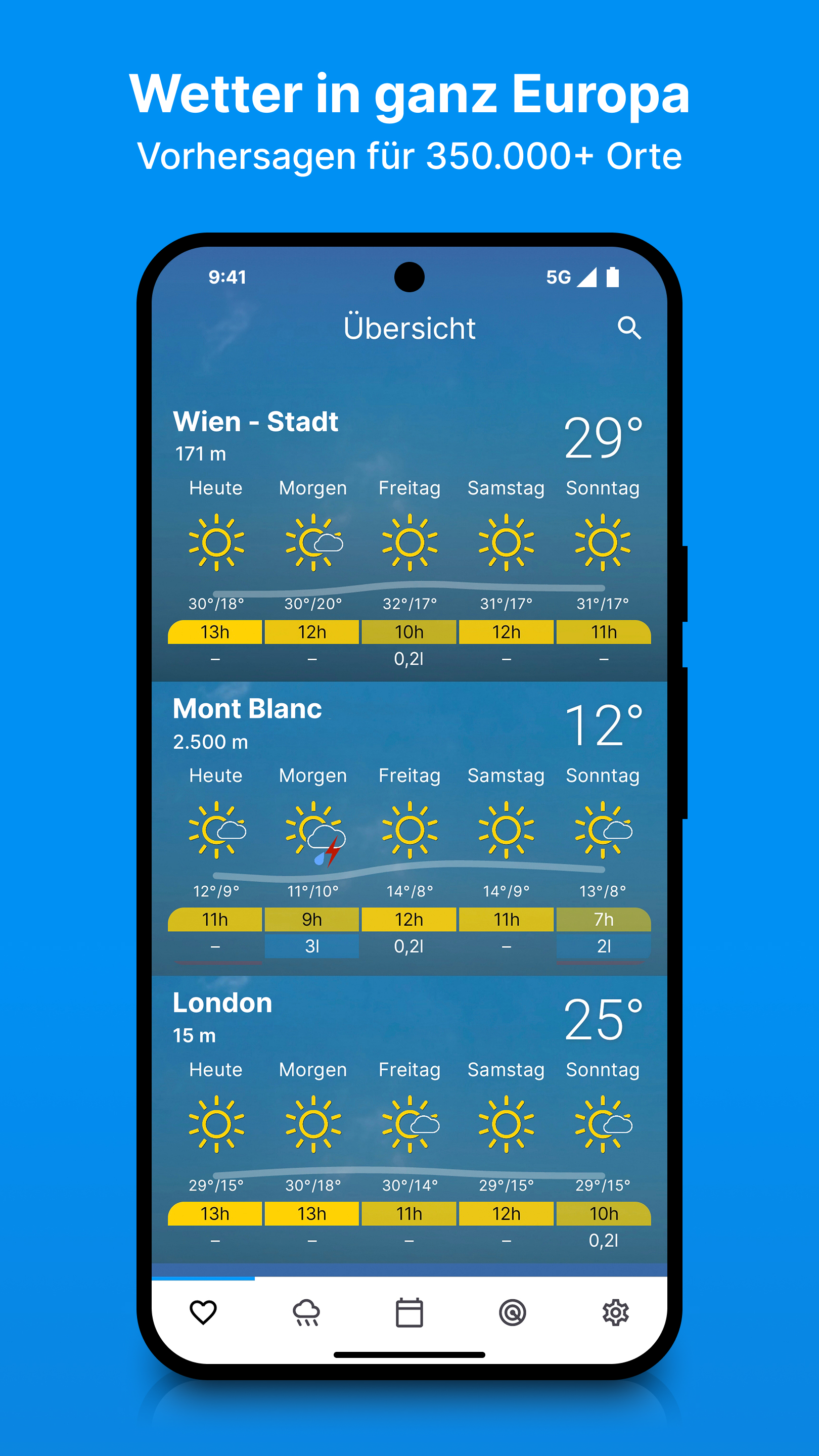 Lieblingsorte auf einen BlickIn unserer Wetter & Regenradar App kannst du Städte, Orte und sogar Berge als Favoriten hinzufügen und behältst so das Wetter noch leichter im Auge. Mit der Favoriten-Ansicht weißt du immer, wie sich das Wetter an den wichtigsten Orten entwickeln wird.