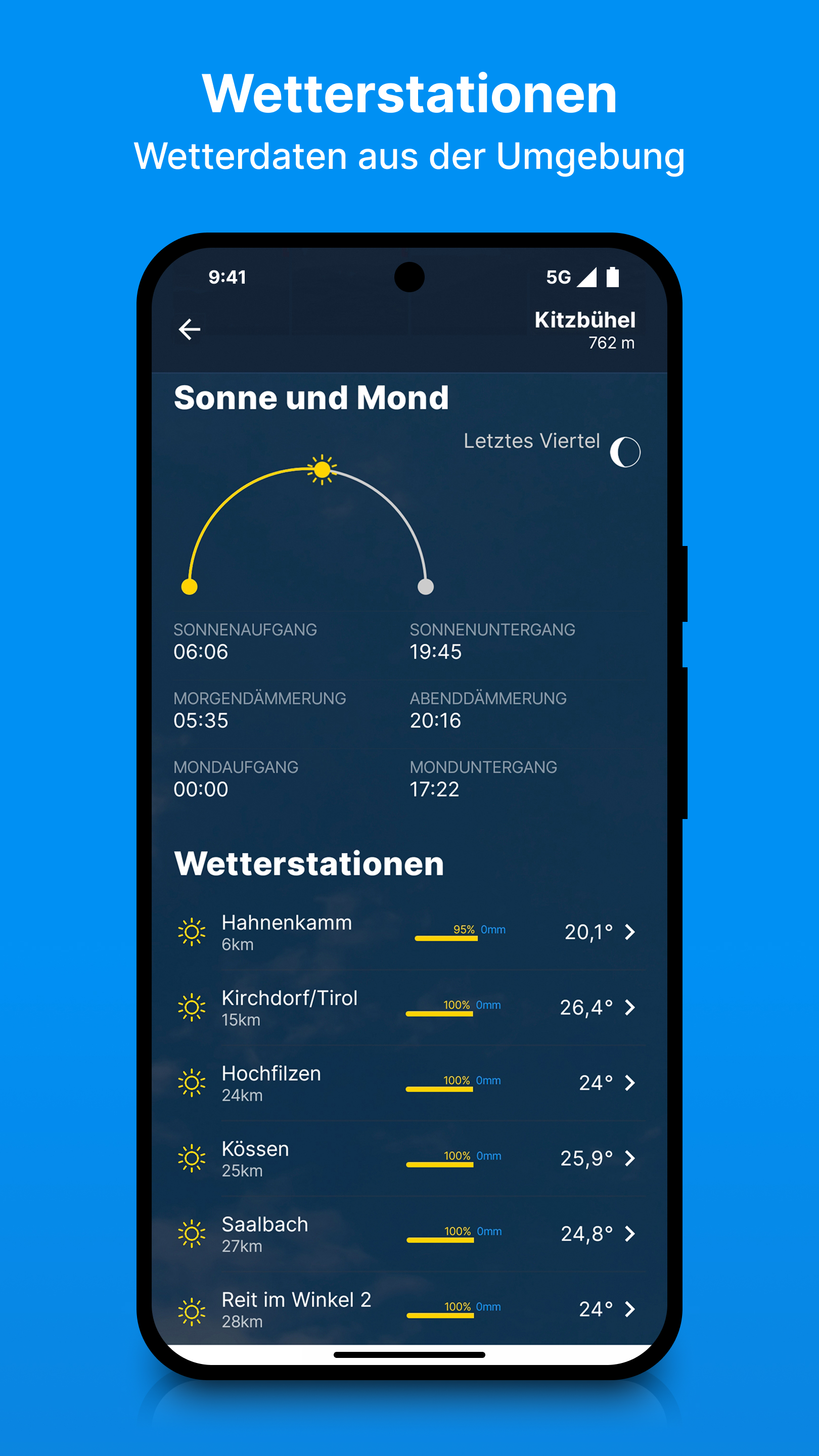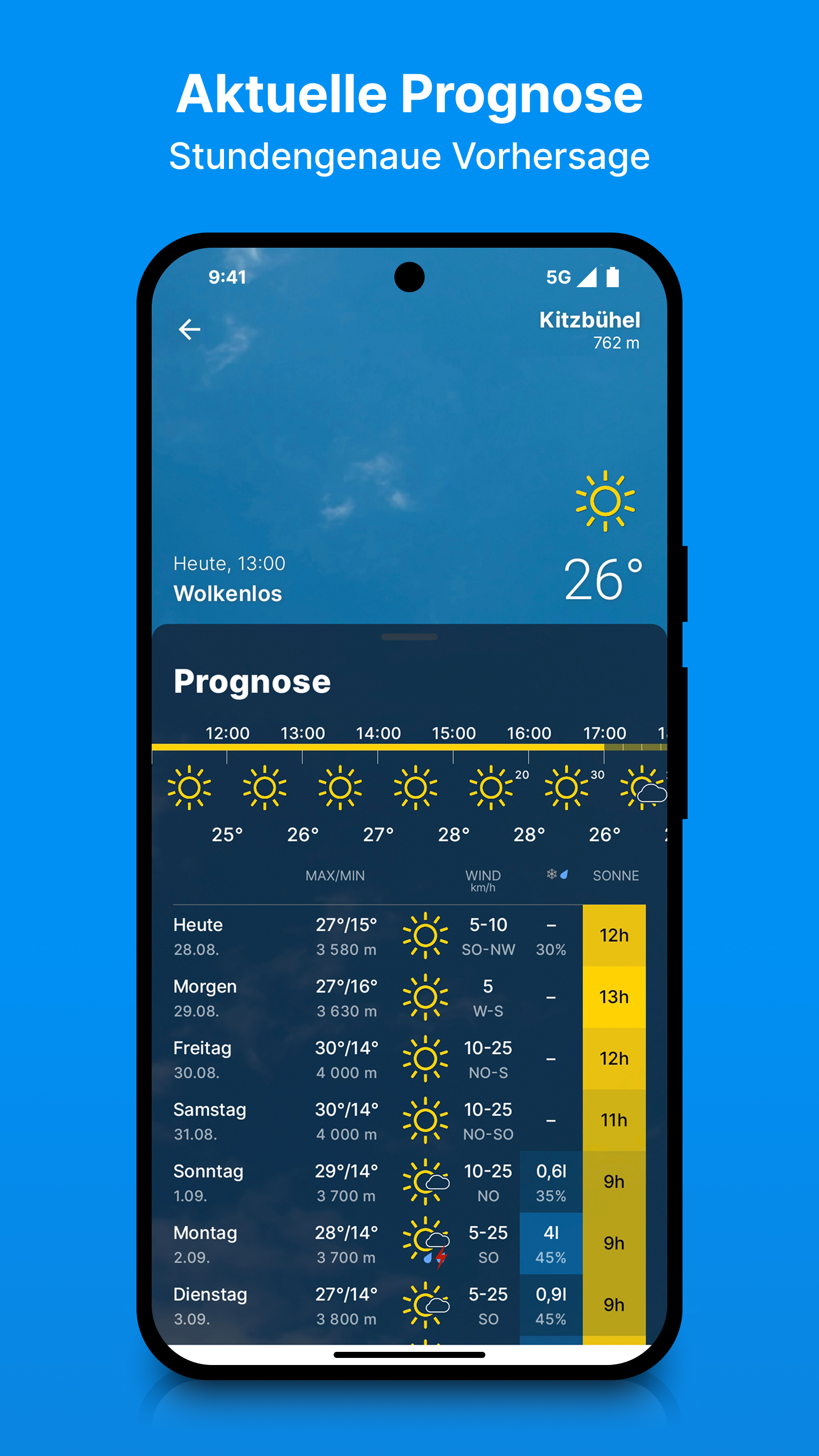 Umfassende Prognosen für Deinen StandortHole dir 9-Tages-Prognosen mit allen Details: Temperatur, Wind, Niederschlagswahrscheinlichkeit, Schneefallgrenzen, Sonnenscheindauer, Mondphasen sowie Sonnen- und Mondaufgang. So bist du jederzeit bestens über das Wetter vor Ort informiert.