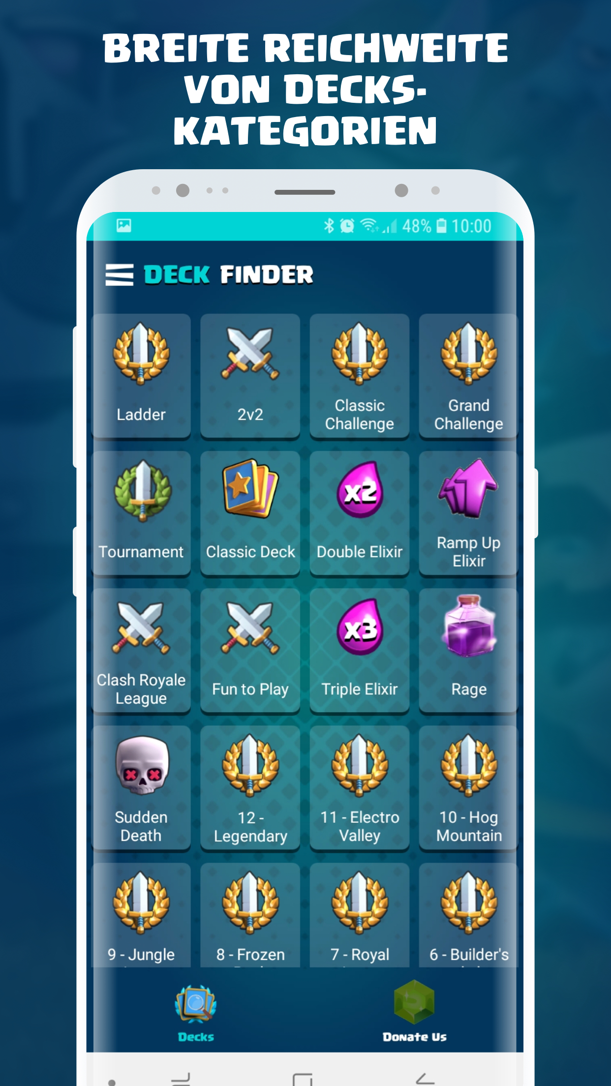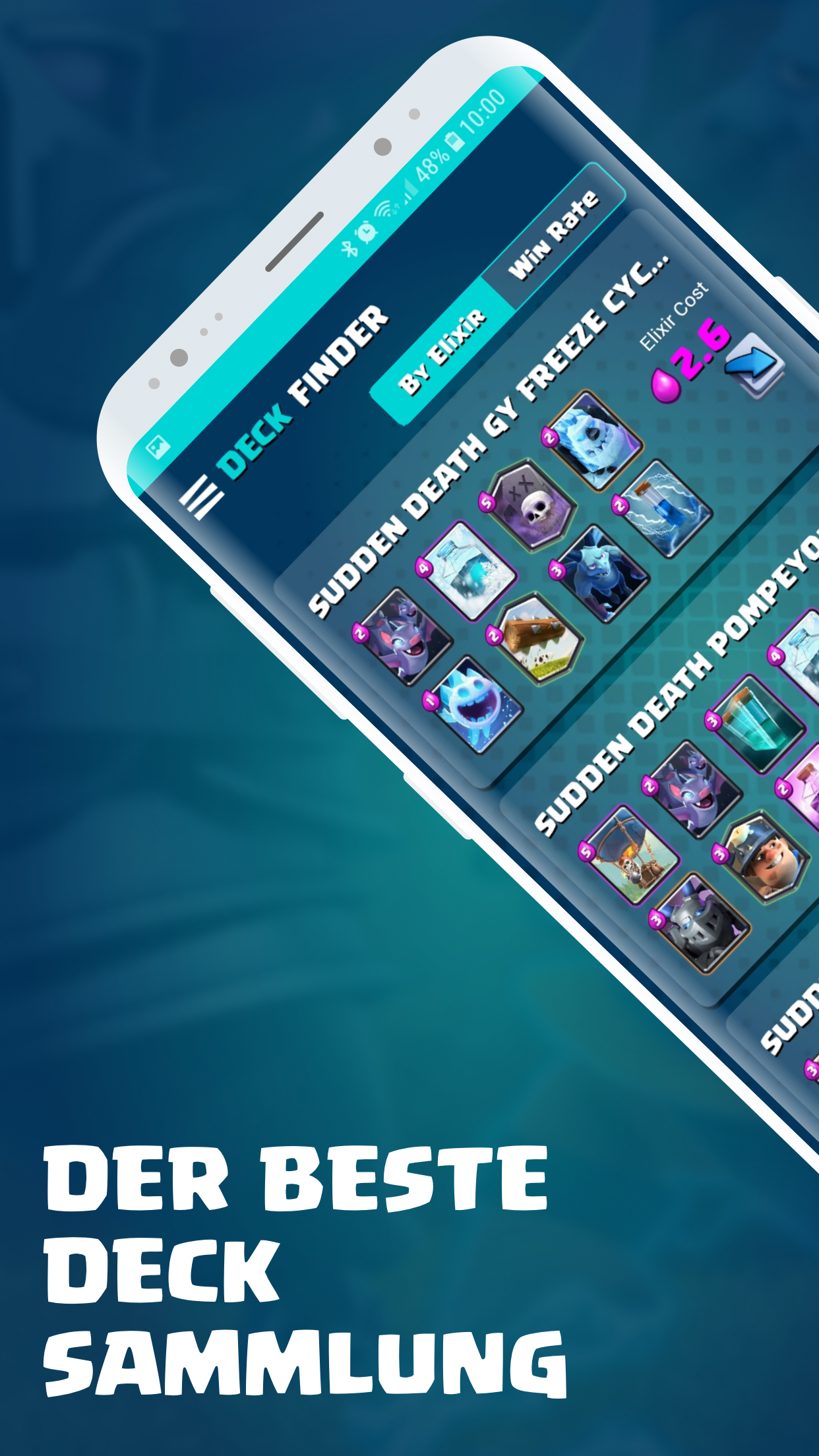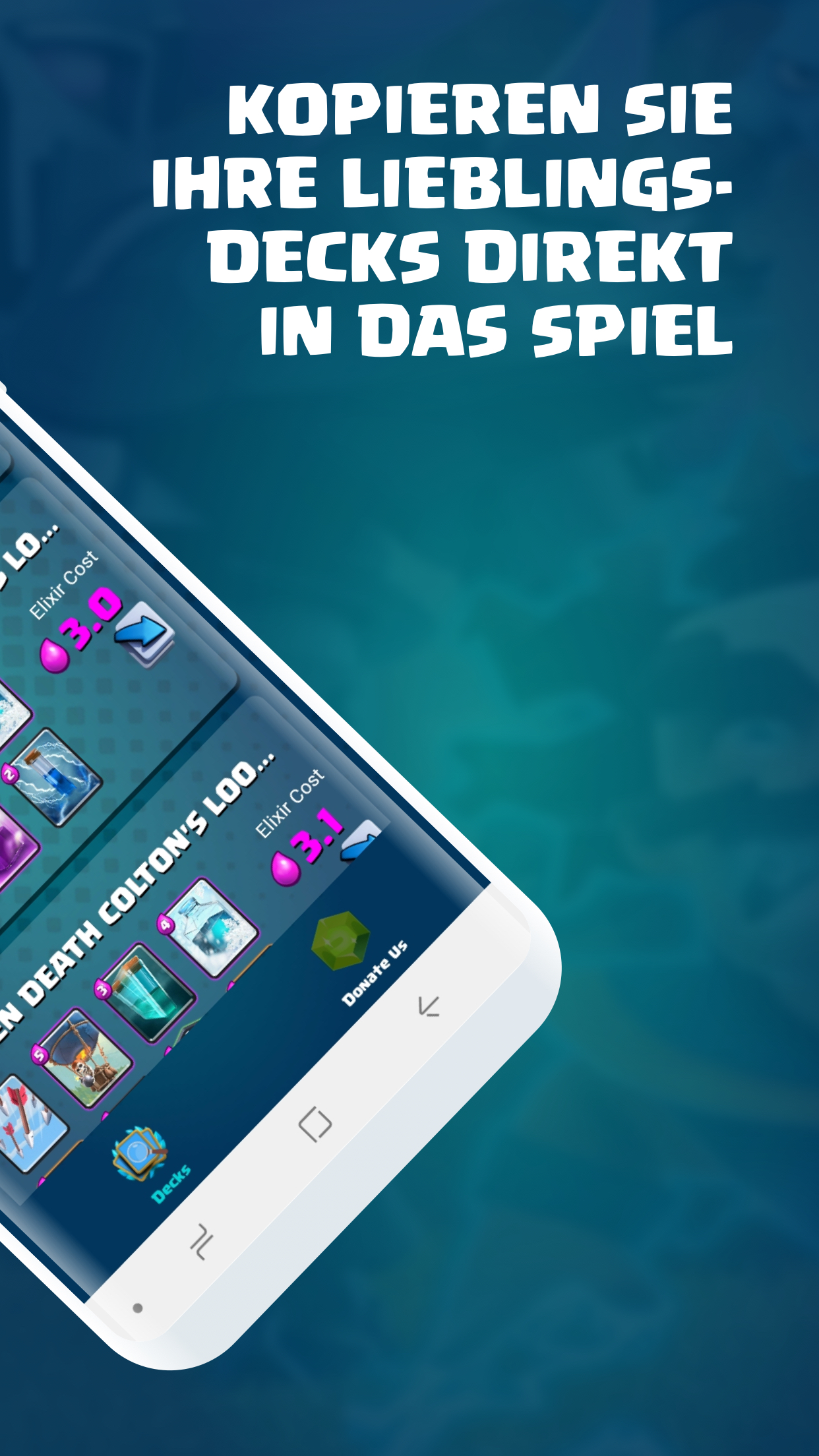 Langeweile, immer wieder dasselbe Deck zu spielen? Unsere App enthält je nach Spielmodus die besten Decks. Willst du eine Herausforderung gewinnen? Gehen Sie zur App und suchen Sie nach den Decks mit der besten Gewinnrate. Wir bieten Decks für alle Arenen, für globale Turniere, für Herausforderungen und vieles mehr. Bereitmachen zu kämpfen!! Hier ist unsere vollständige Funktionsliste: * Decks für alle Arten von Spielmodi: Wut, Doppel- und Dreifachelixier, Herausforderungen, globale Turniere, plötzlicher Tod, Hochlaufelixier, Leiter, 2 gegen 2 und vieles mehr. * Wir senden Ihnen Benachrichtigungen, wenn wir neue Decks hinzufügen * Die App ist mehrsprachig * Entwickelt, um auf jedem Gerät mit jeder Softwareversion zu funktionieren. * Wir haben es so schnell und einfach gemacht, dass Sie in Sekundenschnelle Clash Royale Challenges spielen werden! * Wir werden unsere App ständig aktualisieren, um eine größere Auswahl an Funktionen zu unterstützen. … Und vieles mehr kommt bald! Jetzt downloaden! Decks Royale für Clash Royale KOSTENLOS im Play Store! Haftungsausschluss Dieser Inhalt ist nicht mit Supercell verbunden, wird von Supercell unterstützt, gesponsert oder ausdrücklich genehmigt, und Supercell ist nicht dafür verantwortlich. Weitere Informationen finden Sie in der Fan-Inhaltsrichtlinie von Supercell: www.supercell.com/fan-content-policy.