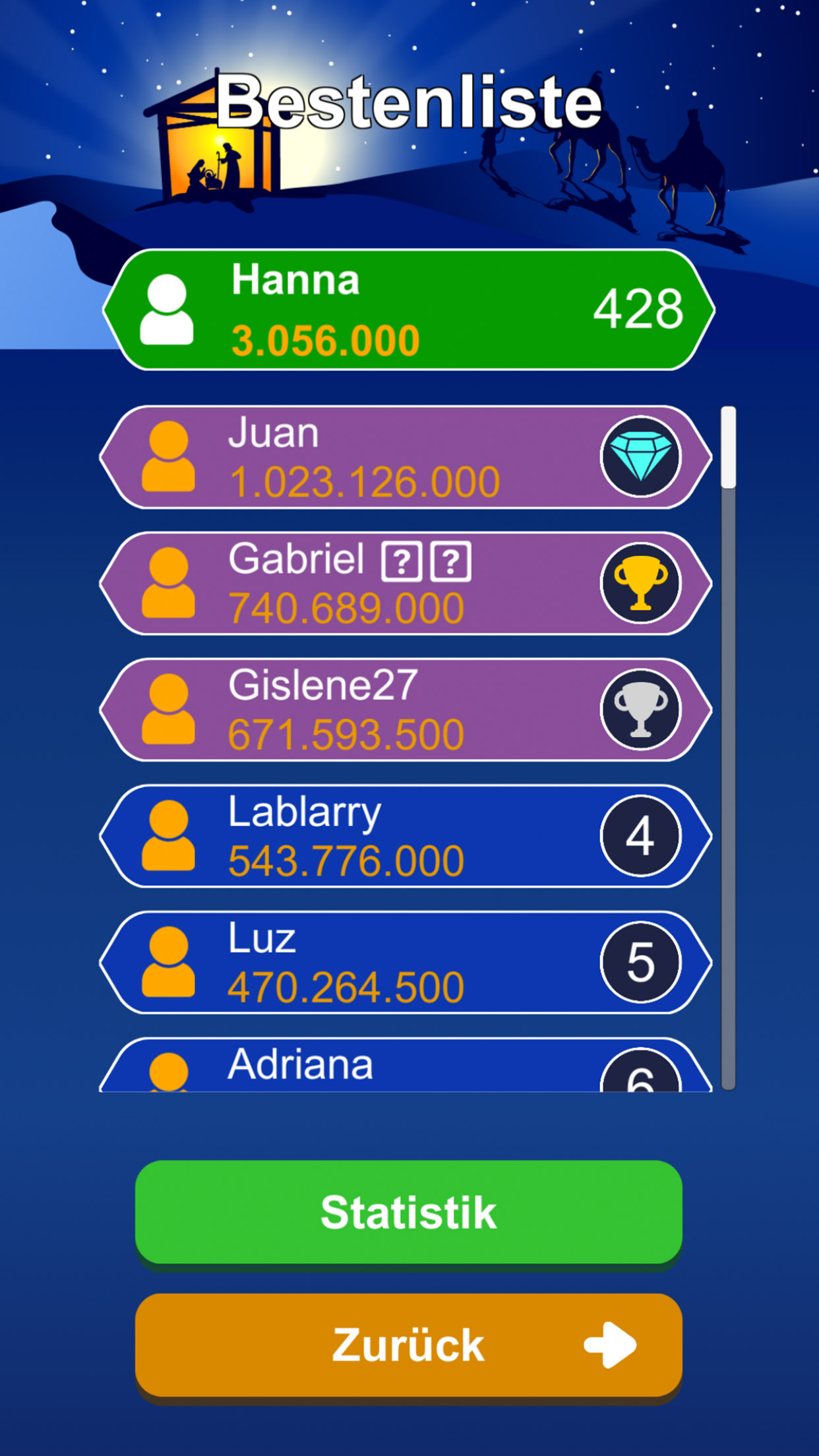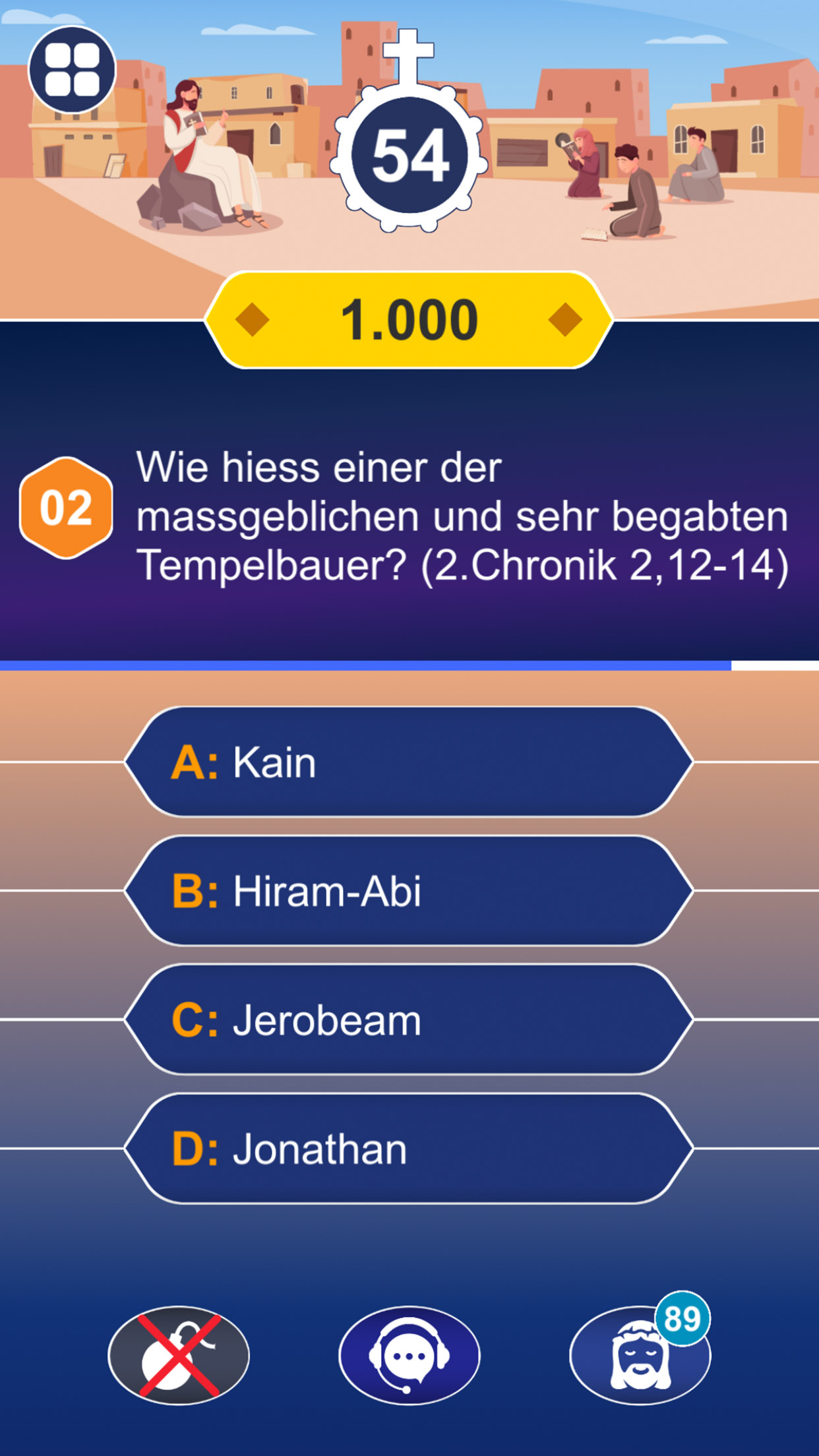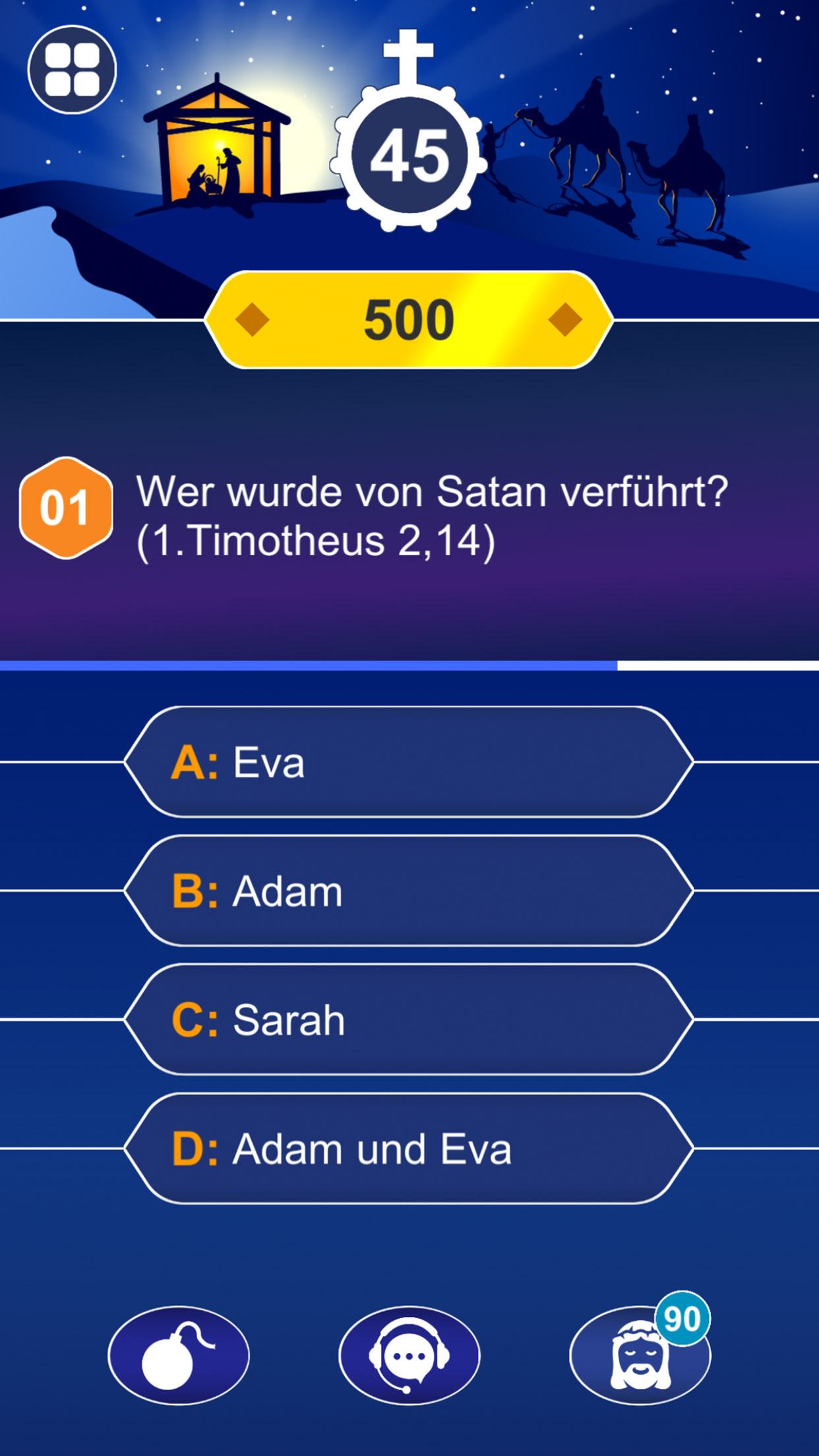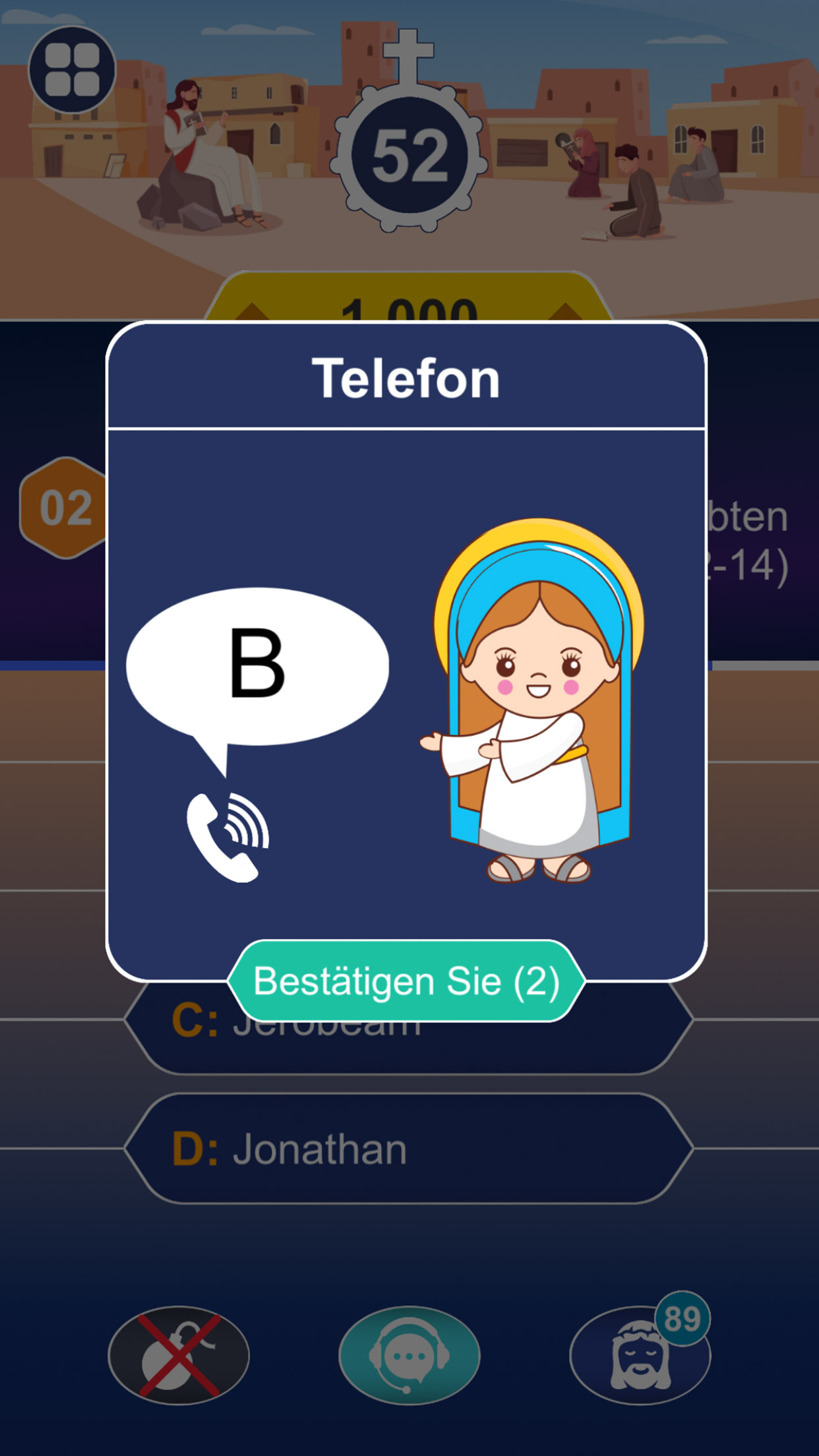 Stelle dich über 1000 täglichen Bibel-Trivia-Fragen – von leicht bis herausfordernd. Nutze klassische Joker wie „50:50“, „Publikumsjoker“ oder „Telefonjoker“ – ganz im Stil von Wer wird Millionär. Triff virtuelle Helfer wie Maria, Josef, Jesus und Papst Johannes Paul II.