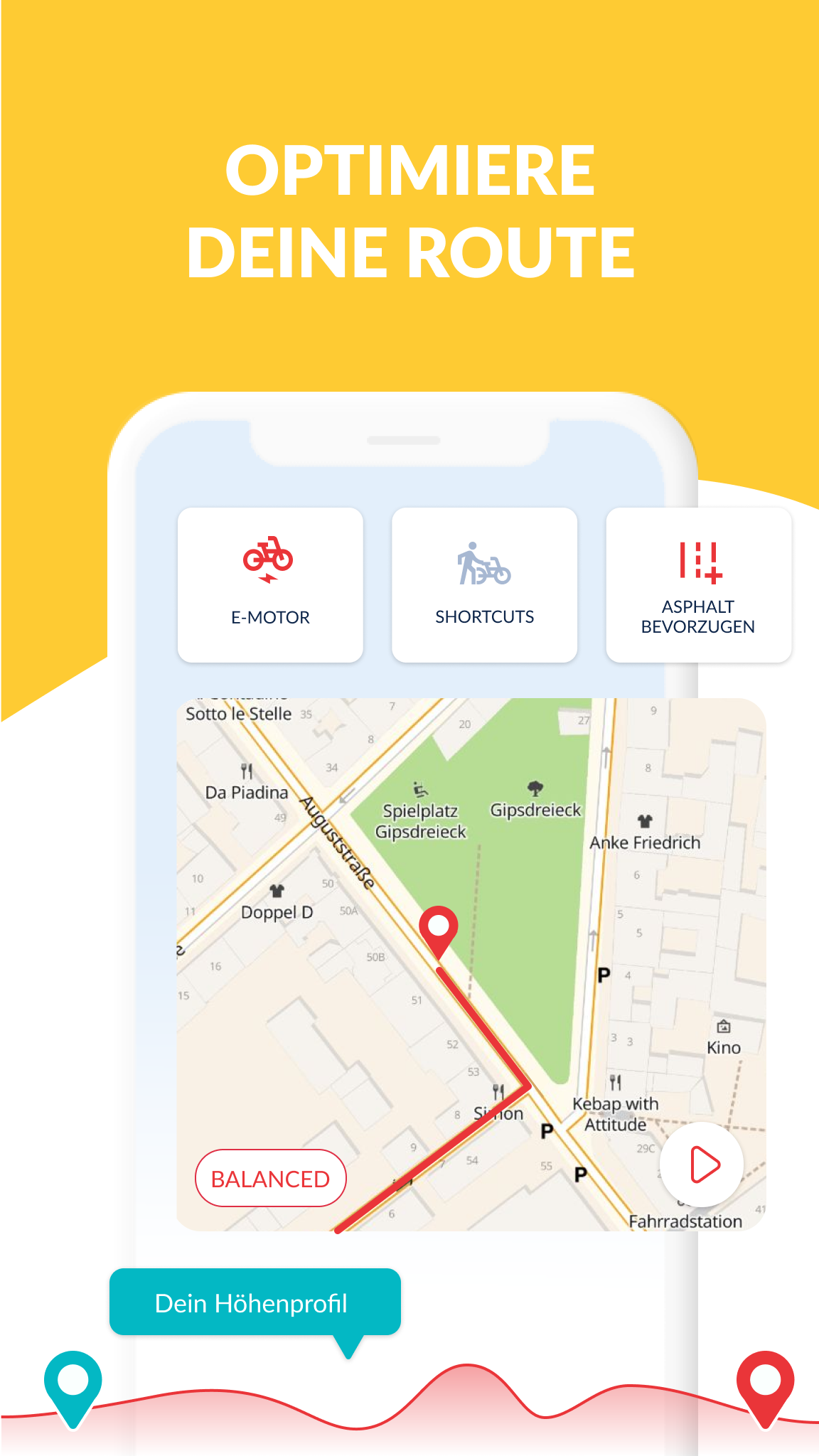 • Verschiedene Routingoptionen angepasst an deinen Radtyp (City Bike, MTB, Rennrad, Ebike)