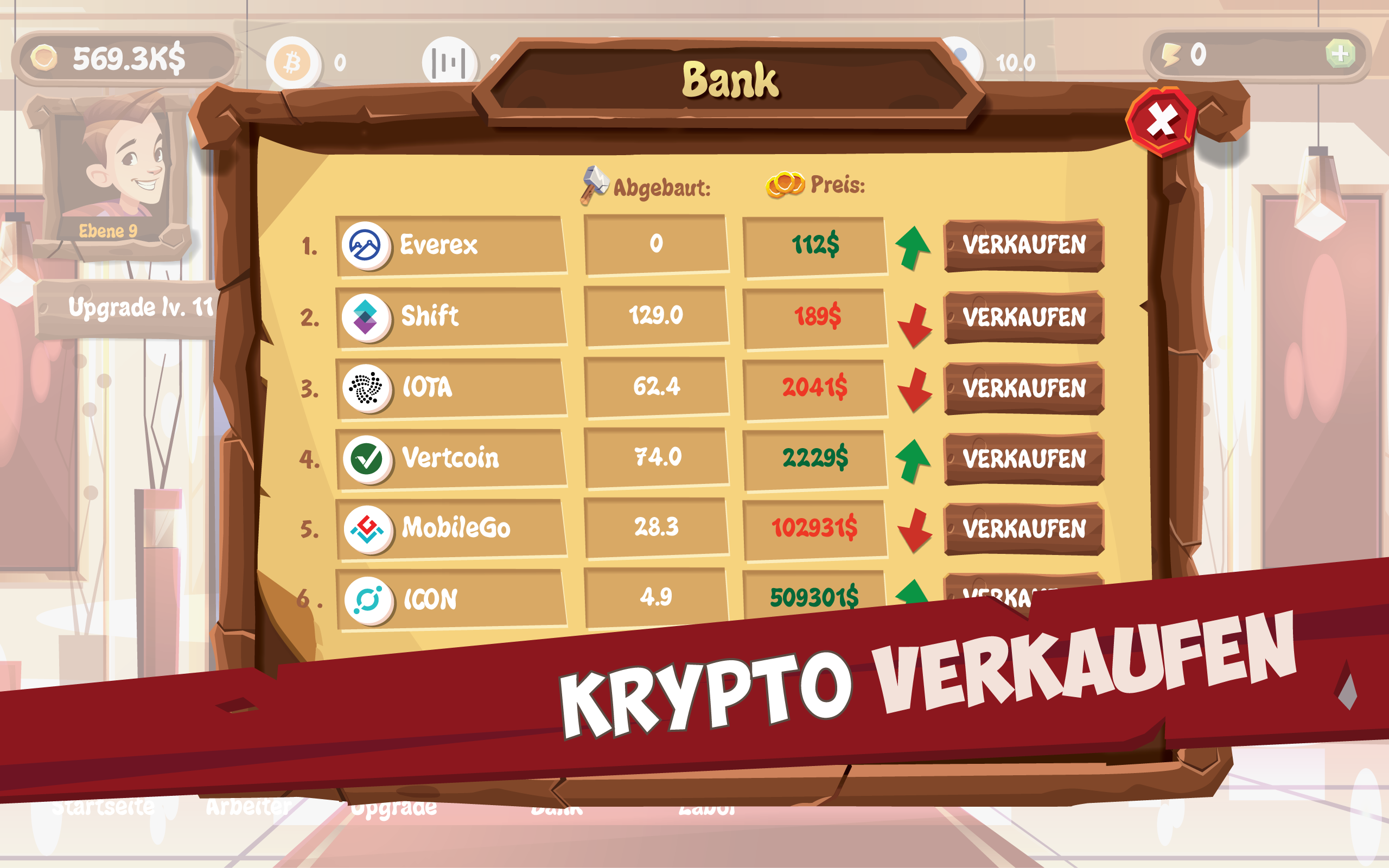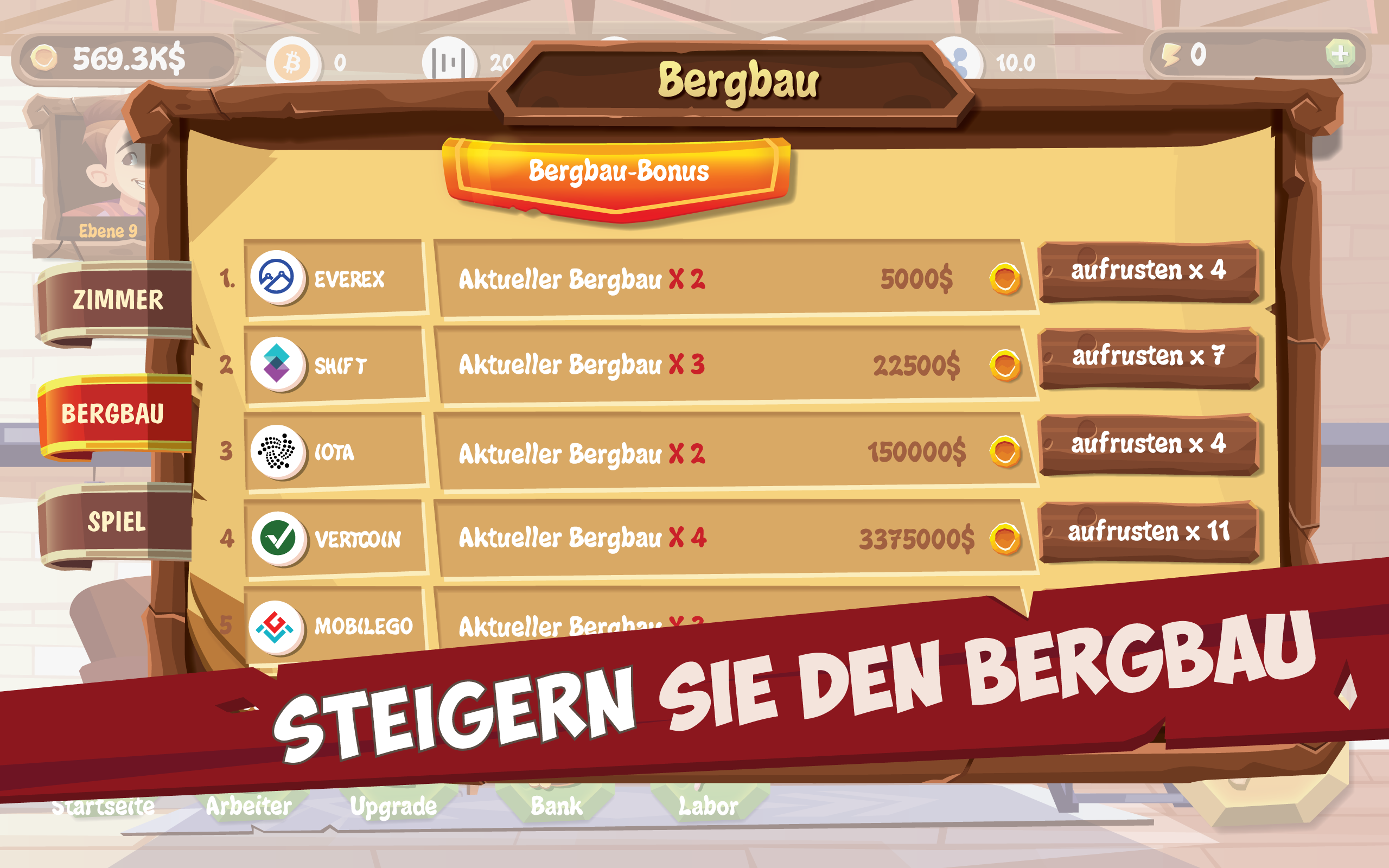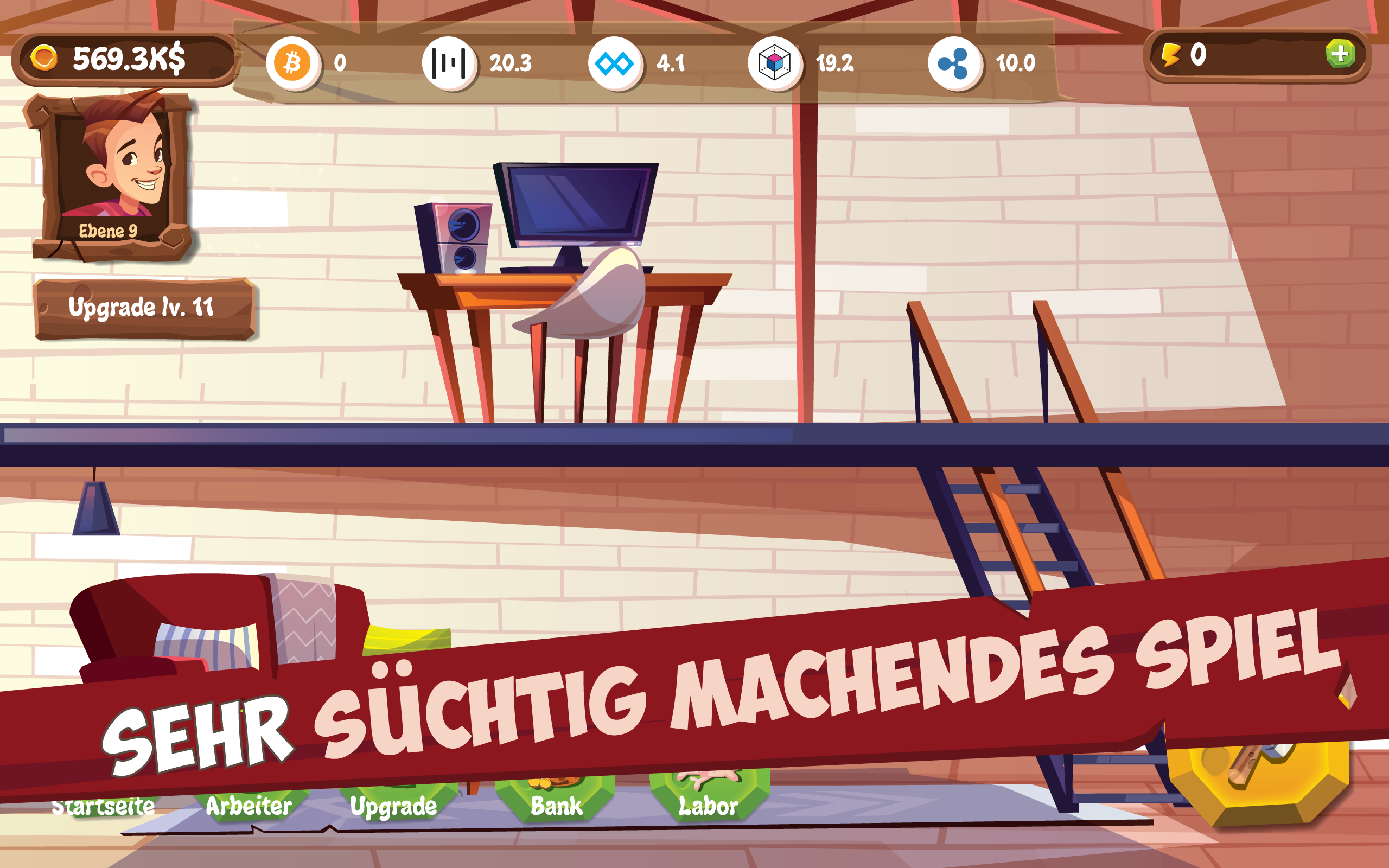 Sie lieben einfache und interessante Leerlauf-Klicker, möchten aber gerne mal etwas Neues ausprobieren? Dann ist der 'Idle Clicker Tycoon - Crypto currency Miner' genau das Richtige für Sie! Vergessen Sie die langweiligen Klicker und erstellen Sie Ihr eigenes Mining-Netzwerk!!! Holen Sie sich Ihr Leben geregelt: mieten Arbeiter, Mine Kryptowährung und erhalten Einkommen! Das Geld-Imperium wartet auf Sie! - Haben Sie einfach Spaß! Ein einfaches und interessantes Gameplay sorgt für maximalen Spaß an Ihrem Luxusleben - Ausgezeichnete Kunst und Animation! Das beste Cash-Tycoon im Netz! - Sie können eine breite Palette von Kryptowährungen minen! Everex, Delta, Bitcoin, und viele andere! - Spielende Vielfalt! Sie können sammeln und sparen Sie Geld für Ihr neues Leben! - Der Spielveränderer unter den Business-Simulatoren! Der Klicker der nächsten Generation! Klick, drück! - Eine Reihe von Verbesserungen, Upgrades und Leistungsstufen! Es macht Spaß, zu bauen! - Idle Miner ist cool! Werden Sie ein Teil der Familie und machen Sie neue Freunde! Erstellen Sie eine Farm und erhalten Sie ein passives Einkommen! - Wir haben dieses Spiel mit Liebe und Sorgfalt gemacht! Noch mehr als beim letzten Mal! - Verwalten! Einstellen! Automatisieren! - das ist unser Motto! - Dieses Spiel kann sowohl online als auch offline gespielt werden! Machen Sie sich bereit für verrückte Gewinne und hohe Einnahmen! Automatisieren Sie eine Mining-Farm im Idle Clicker Tycoon - Crypto Currency Miner! Wollen Sie passives Einkommen erhalten und der König des Kryptowährungsbergbaus werden? Es ist keine leichte Aufgabe, ein echter Magnat zu werden. Passives Einkommen wird nicht von selbst entstehen! Man muss die richtige Ausrüstung bekommen, Mitarbeiter einstellen, den Kryptowährungsabbau verwalten usw. Und das ist der einzige Weg, um ein erfolgreicher Führer des Geldimperiums zu werden! Ihr Imperium wartet auf Sie! Um passives Einkommen zu erhalten, muss eine Menge Arbeit erledigt werden: verwalten, einstellen, automatisieren - das sind nur einige der Aufgaben, die Sie erledigen müssen, damit Ihr Imperium wachsen kann. Entwickeln Sie eine richtige Strategie und werden Sie der erfolgreichste Magnat der Welt! Im Grunde, herunterladen. Es ist ein einfaches, interessantes und lustiges Spiel über Kryptowährung Bergbau und Gebäude ein eigenes Zimmer. Ja, die Ernte ist hier nicht Gemüse und Tiere, sondern Kryptowährung und Geld. Trotzdem ist es leicht und einfach, den Idleclicker Tycoon - Crypto currency Miner zu spielen! Fühlen Sie sich wie ein erfolgreicher Geschäftsmann, verdienen Sie Millionen, machen Sie Karriere vom Manager zum Top-Manager, vom Top-Manager zum Millionär und vom Millionär zum Milliardär. Und lassen Sie sich von anderen Milliardären beneiden. Denn Ihr Bergbauunternehmen ist auf dem Gipfel des Ruhmes und des Erfolges. Das Spiel hat eine Prestige-Funktion, ein beliebtes Feature in anderen Clickern. Ein Spieler kann auf Prestige klicken, um den gesamten Fortschritt zurückzusetzen und einen riesigen Bonus zu erhalten, der die weitere Entwicklung und die Machtstufen beschleunigt.