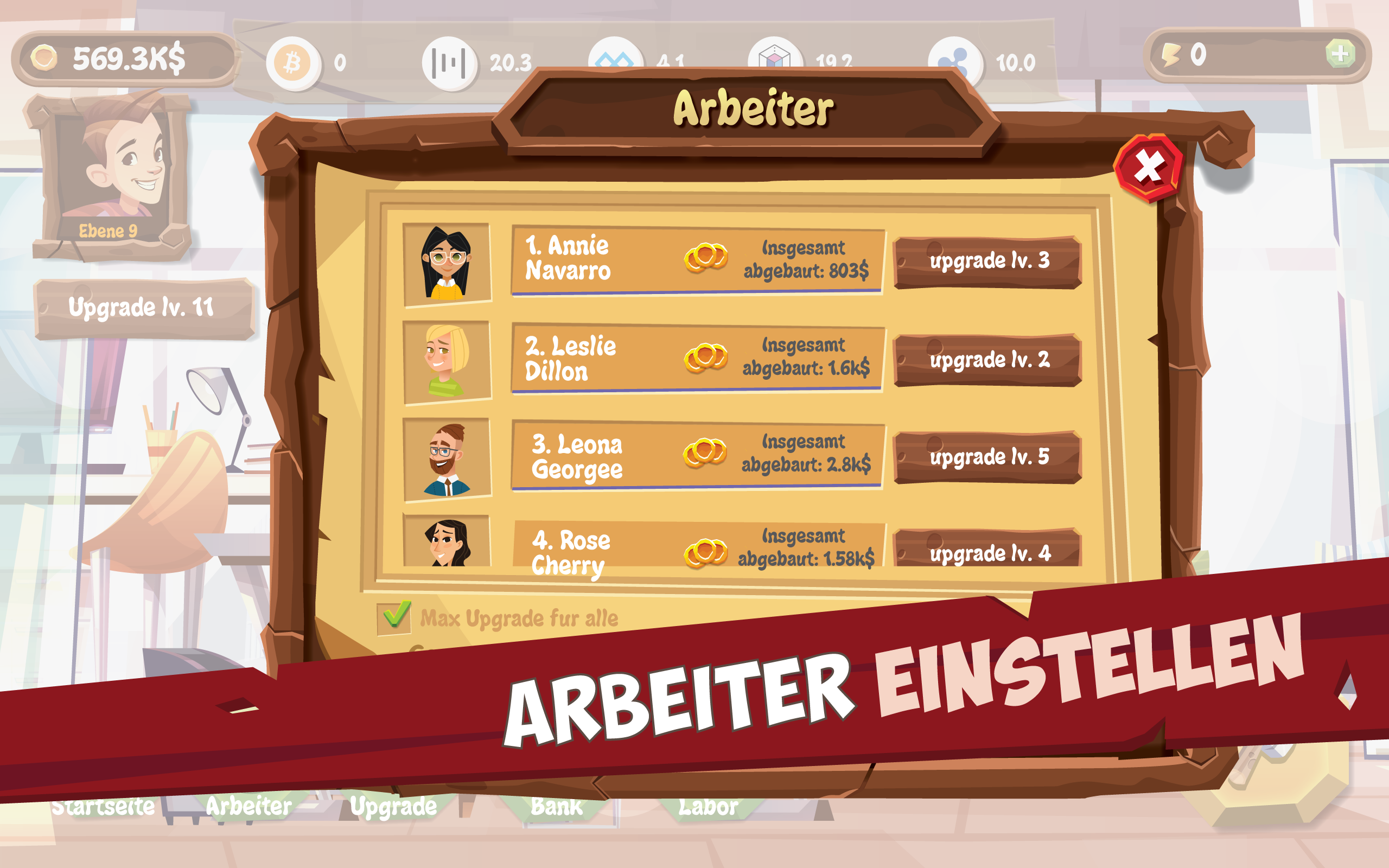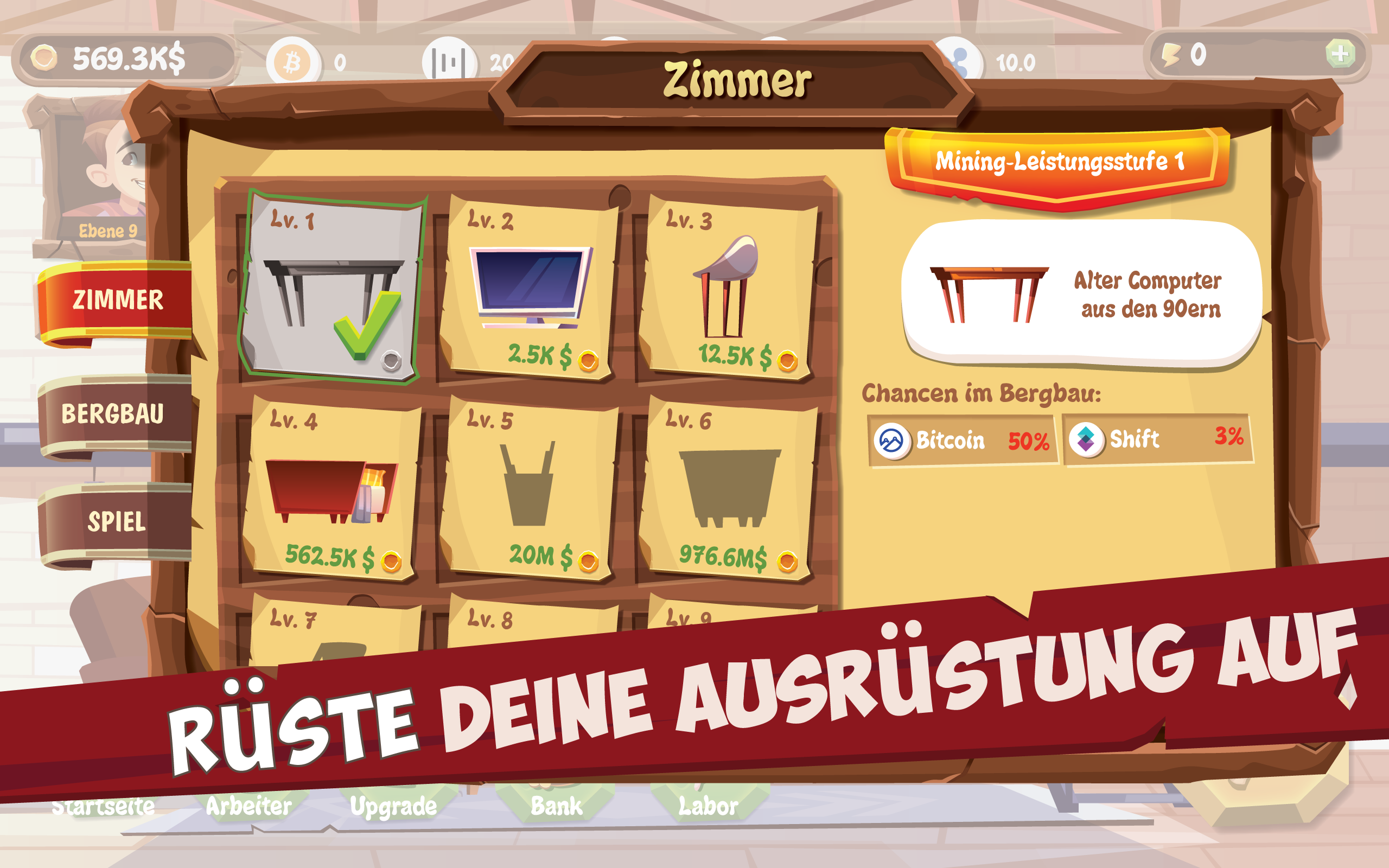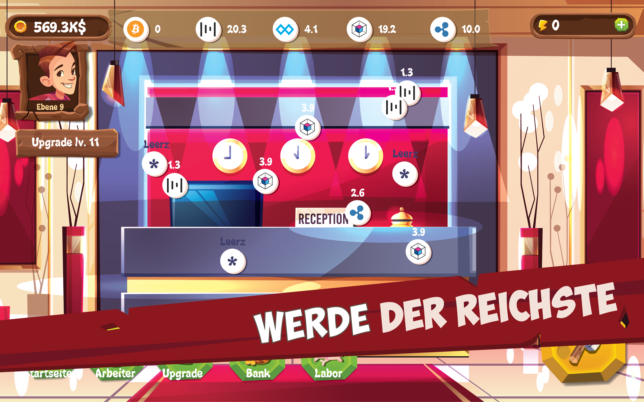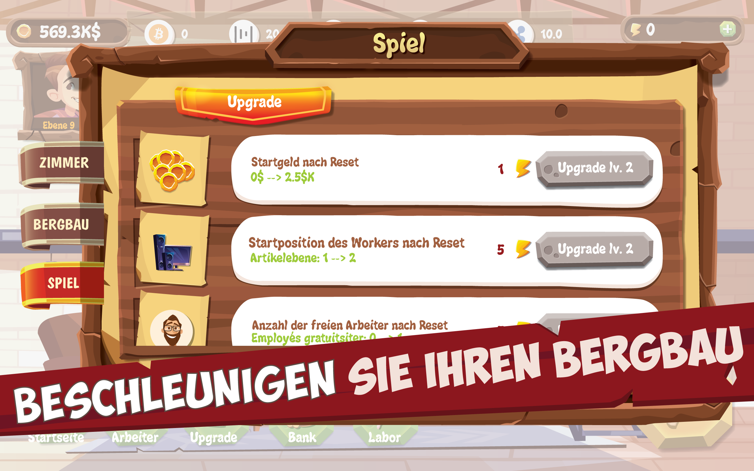 Sie lieben einfache und interessante Leerlauf-Klicker, möchten aber gerne mal etwas Neues ausprobieren? Dann ist der 'Idle Clicker Tycoon - Crypto currency Miner' genau das Richtige für Sie! Vergessen Sie die langweiligen Klicker und erstellen Sie Ihr eigenes Mining-Netzwerk!!! Holen Sie sich Ihr Leben geregelt: mieten Arbeiter, Mine Kryptowährung und erhalten Einkommen! Das Geld-Imperium wartet auf Sie! - Haben Sie einfach Spaß! Ein einfaches und interessantes Gameplay sorgt für maximalen Spaß an Ihrem Luxusleben - Ausgezeichnete Kunst und Animation! Das beste Cash-Tycoon im Netz! - Sie können eine breite Palette von Kryptowährungen minen! Everex, Delta, Bitcoin, und viele andere! - Spielende Vielfalt! Sie können sammeln und sparen Sie Geld für Ihr neues Leben! - Der Spielveränderer unter den Business-Simulatoren! Der Klicker der nächsten Generation! Klick, drück! - Eine Reihe von Verbesserungen, Upgrades und Leistungsstufen! Es macht Spaß, zu bauen! - Idle Miner ist cool! Werden Sie ein Teil der Familie und machen Sie neue Freunde! Erstellen Sie eine Farm und erhalten Sie ein passives Einkommen! - Wir haben dieses Spiel mit Liebe und Sorgfalt gemacht! Noch mehr als beim letzten Mal! - Verwalten! Einstellen! Automatisieren! - das ist unser Motto! - Dieses Spiel kann sowohl online als auch offline gespielt werden! Machen Sie sich bereit für verrückte Gewinne und hohe Einnahmen! Automatisieren Sie eine Mining-Farm im Idle Clicker Tycoon - Crypto Currency Miner! Wollen Sie passives Einkommen erhalten und der König des Kryptowährungsbergbaus werden? Es ist keine leichte Aufgabe, ein echter Magnat zu werden. Passives Einkommen wird nicht von selbst entstehen! Man muss die richtige Ausrüstung bekommen, Mitarbeiter einstellen, den Kryptowährungsabbau verwalten usw. Und das ist der einzige Weg, um ein erfolgreicher Führer des Geldimperiums zu werden! Ihr Imperium wartet auf Sie! Um passives Einkommen zu erhalten, muss eine Menge Arbeit erledigt werden: verwalten, einstellen, automatisieren - das sind nur einige der Aufgaben, die Sie erledigen müssen, damit Ihr Imperium wachsen kann. Entwickeln Sie eine richtige Strategie und werden Sie der erfolgreichste Magnat der Welt! Im Grunde, herunterladen. Es ist ein einfaches, interessantes und lustiges Spiel über Kryptowährung Bergbau und Gebäude ein eigenes Zimmer. Ja, die Ernte ist hier nicht Gemüse und Tiere, sondern Kryptowährung und Geld. Trotzdem ist es leicht und einfach, den Idleclicker Tycoon - Crypto currency Miner zu spielen! Fühlen Sie sich wie ein erfolgreicher Geschäftsmann, verdienen Sie Millionen, machen Sie Karriere vom Manager zum Top-Manager, vom Top-Manager zum Millionär und vom Millionär zum Milliardär. Und lassen Sie sich von anderen Milliardären beneiden. Denn Ihr Bergbauunternehmen ist auf dem Gipfel des Ruhmes und des Erfolges. Das Spiel hat eine Prestige-Funktion, ein beliebtes Feature in anderen Clickern. Ein Spieler kann auf Prestige klicken, um den gesamten Fortschritt zurückzusetzen und einen riesigen Bonus zu erhalten, der die weitere Entwicklung und die Machtstufen beschleunigt.