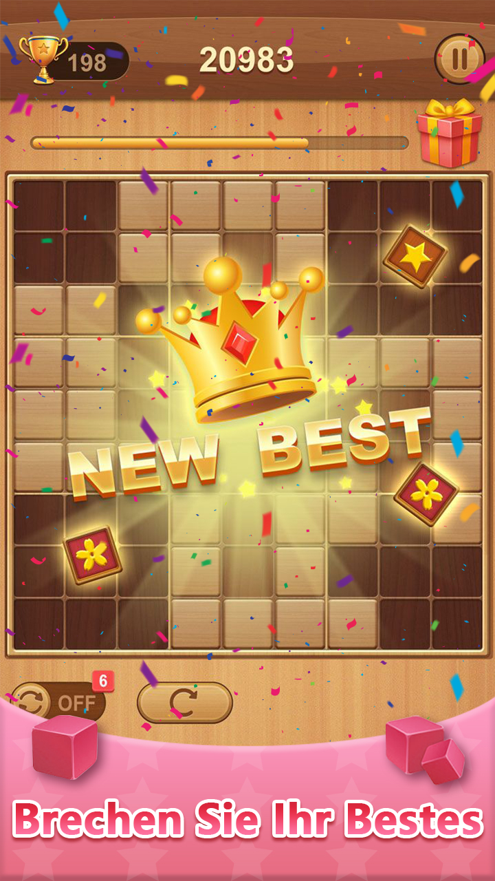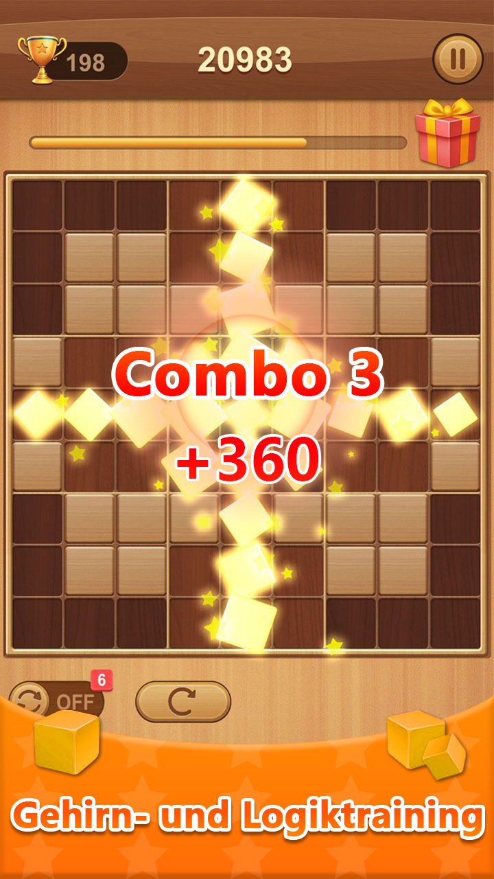 Entspannung, Logik & Spaß – Das ultimative 9x9 Block-Puzzle! Suchst du ein Spiel, das leicht zu lernen, aber schwer zu meistern ist? Dies ist die perfekte Mischung aus klassischen Holzpuzzles und Sudoku-Gittern. Egal, ob du dich entspannen oder geistig fit bleiben willst – vertreibe dir die Zeit mit diesem fesselnden Logikrätsel. Spielanleitung: * Ziehe Holzblöcke auf das 9x9-Gitter. * Fülle Zeilen, Spalten oder 3x3-Quadrate, um Blöcke zu entfernen. * Löse Combos aus, indem du mehrere Reihen oder Quadrate gleichzeitig leerst! * Erziele Streaks durch kontinuierliches Abräumen in jedem Zug. * Das Spiel endet, wenn kein Platz mehr für den nächsten Block ist. Hauptmerkmale: * Sudoku-Mechanik: Anders als bei traditionellen Blockspielen kannst du Blöcke in 3x3-Gittern löschen. Mehr Strategie, mehr Spaß! * Holz-Ästhetik: Genieße die Zen-Atmosphäre mit realistischer Holzoptik und befriedigenden Soundeffekten. * Gehirntraining: Schärfe deine räumliche Logik und deinen IQ ohne Zeitdruck. * Kein Zeitlimit: Spiele in deinem eigenen Tempo. Perfekt für eine kurze Pause. * Offline-Spiel: Kein WLAN? Kein Problem. Spiele überall und jederzeit. Fordere dich selbst heraus und knacke deinen Highscore. Wenn du Sudoku oder Tetris-artige Spiele liebst, wirst du dieses 9x9 Holzblock-Puzzle lieben! Jetzt herunterladen und das Logik-Abenteuer starten!