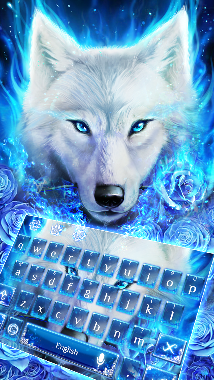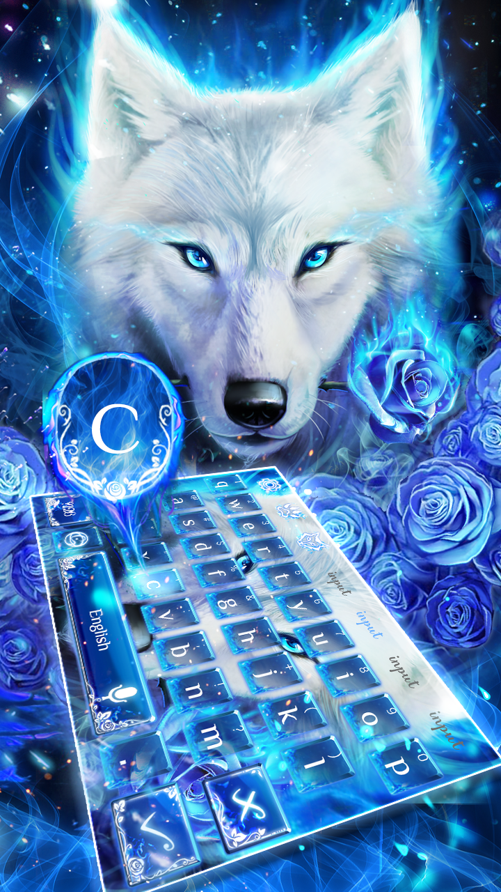 Das transparente Blaue Feuer Wolf Keyboard Theme mit wunderschönen Arktis Wolf, duftende blaue Rose als Hintergrund, die speziell für heulende Wolfsliebhaber entworfen wurde.