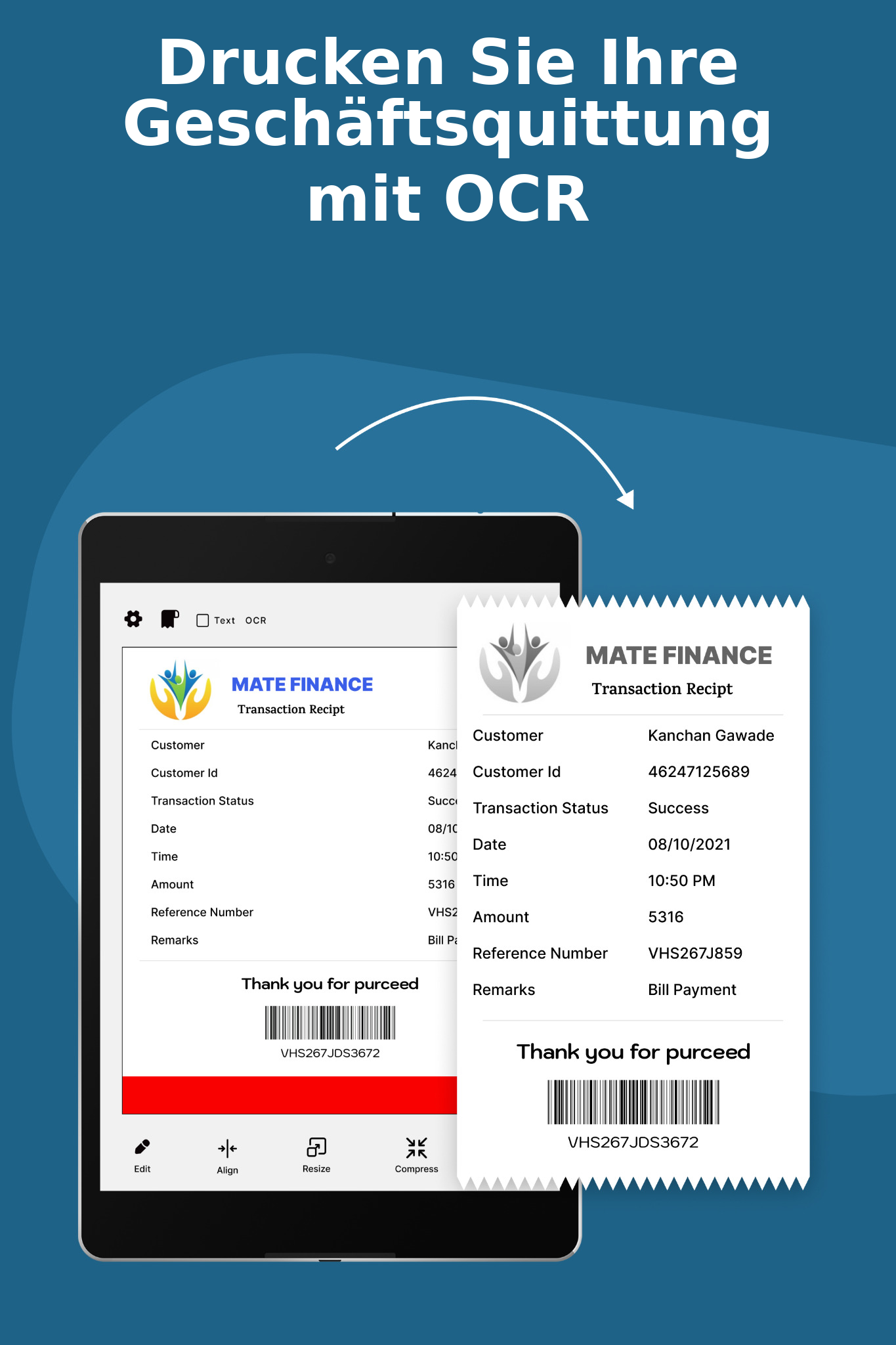 🔤Bankbelege von Kunden mit OCR drucken Vergessen Sie Apps zum Drucken von POS-Belegen, die OCR nicht unterstützen. Mit der Thermer-App können Sie einen Bankzahlungsbeleg in bester Qualität ausdrucken.