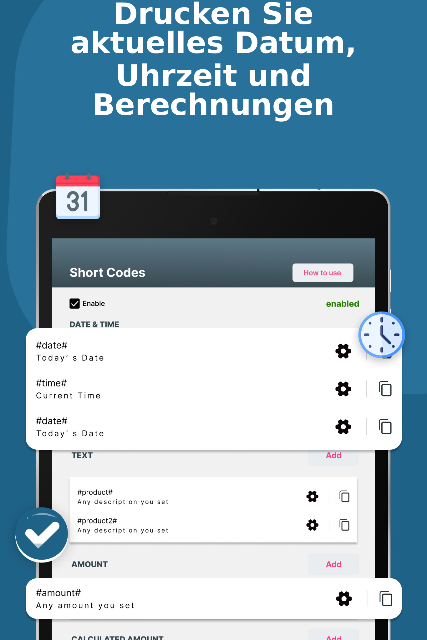 ⌚Multifunktional Im Vergleich zu anderen Mini-Drucker-Apps für Android kann Thermer aktuelle Daten, Uhrzeiten, Beträge und Berechnungen automatisch mit Kurzcodes drucken.