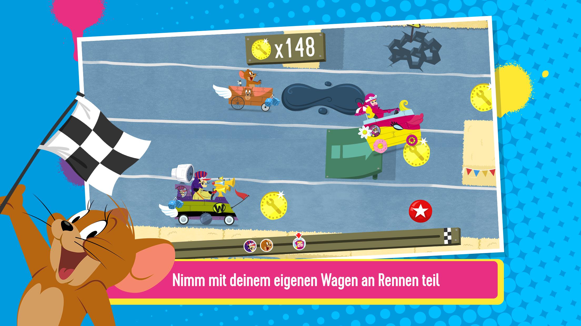 Wenn du dein Auto und deinen Rennfahrer ausgesucht hast, wird es ernst! Trete gegen klassische Boomerang-Charaktere an und weiche dabei Gegenständen aus, um dir den ersten Platz zu sichern!