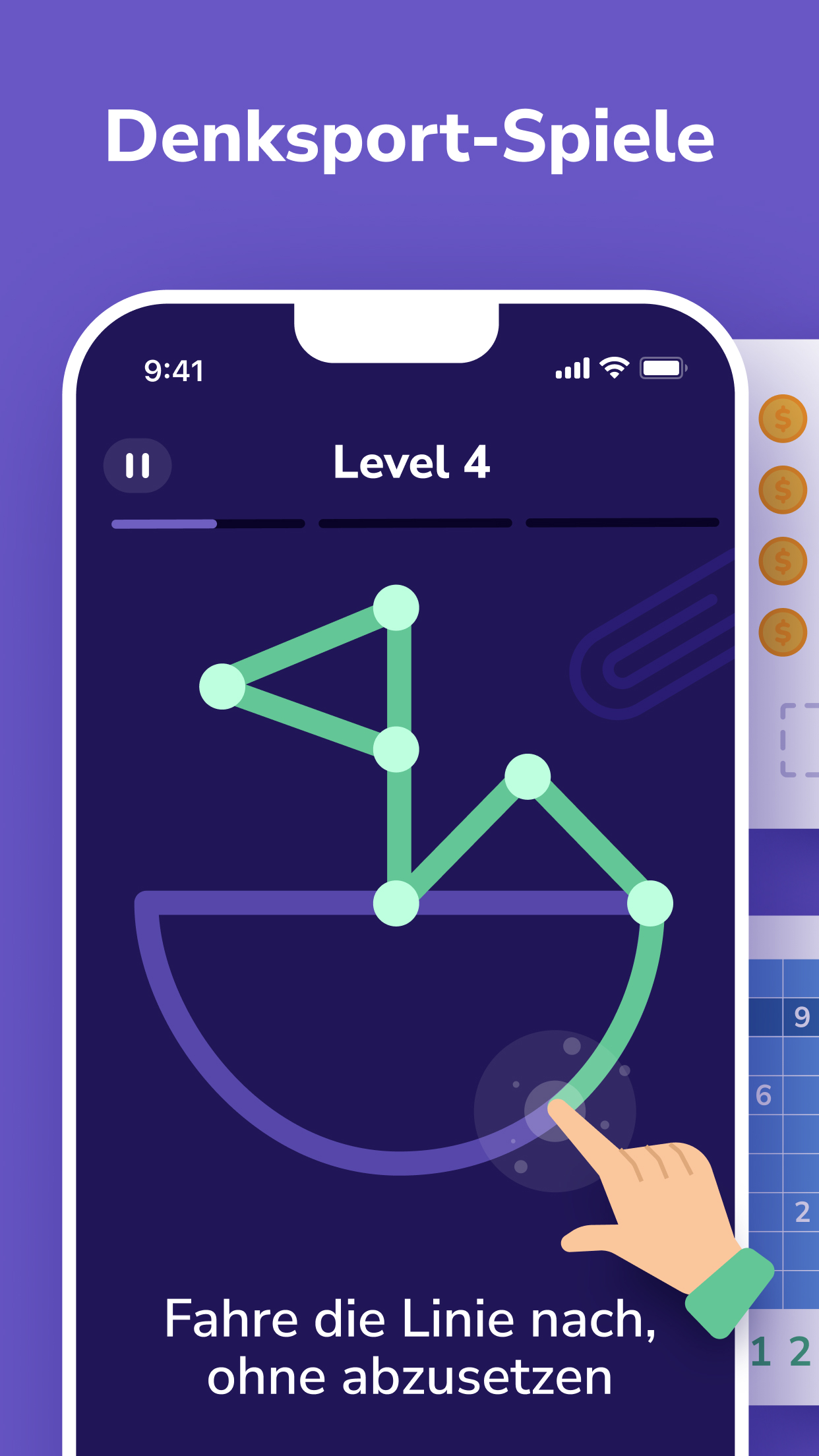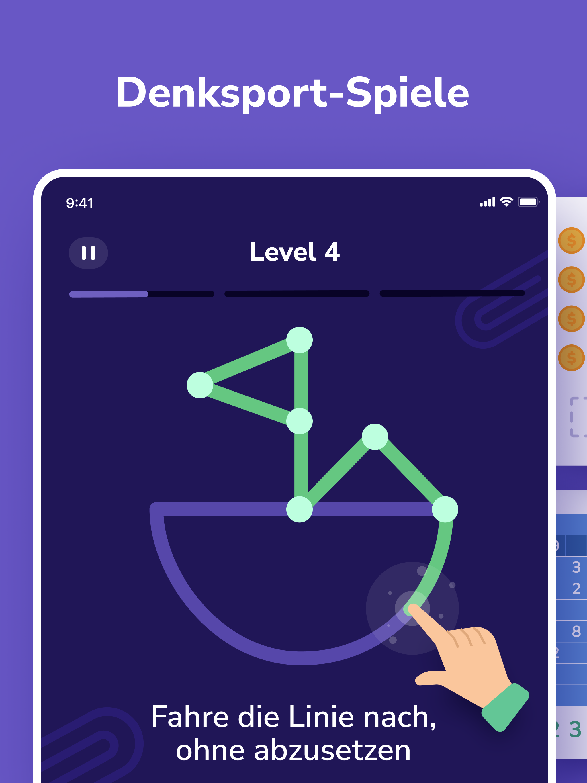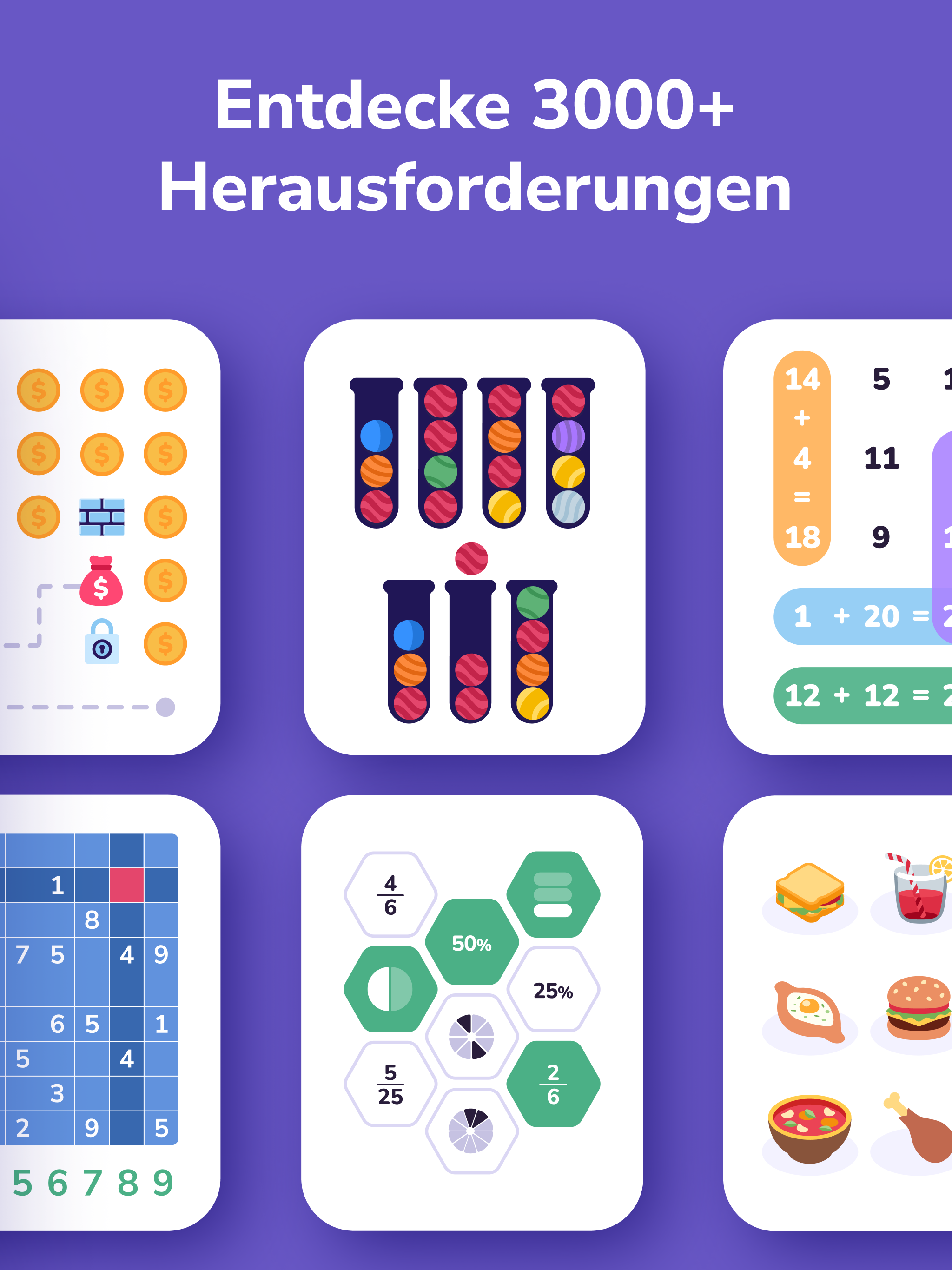 Unsere Sammlung mit Logik-Puzzle-Spiele und Mathe-Rätseln wächst jeden Monat! Unsere Gehirntrainer bietet mehr als 500 Logik-Spiele, mehr als 400 Rätsel für räumliches Denken, über 300 Bilderrätsel und Hunderte anderer spannender Denksportaufgaben und Rätsel-Spiele zur Entwicklung von Denken und Gedächtnis. Beim Spielen entwickelst du nützliche Gewohnheiten und verbesserst wichtige Fähigkeiten: