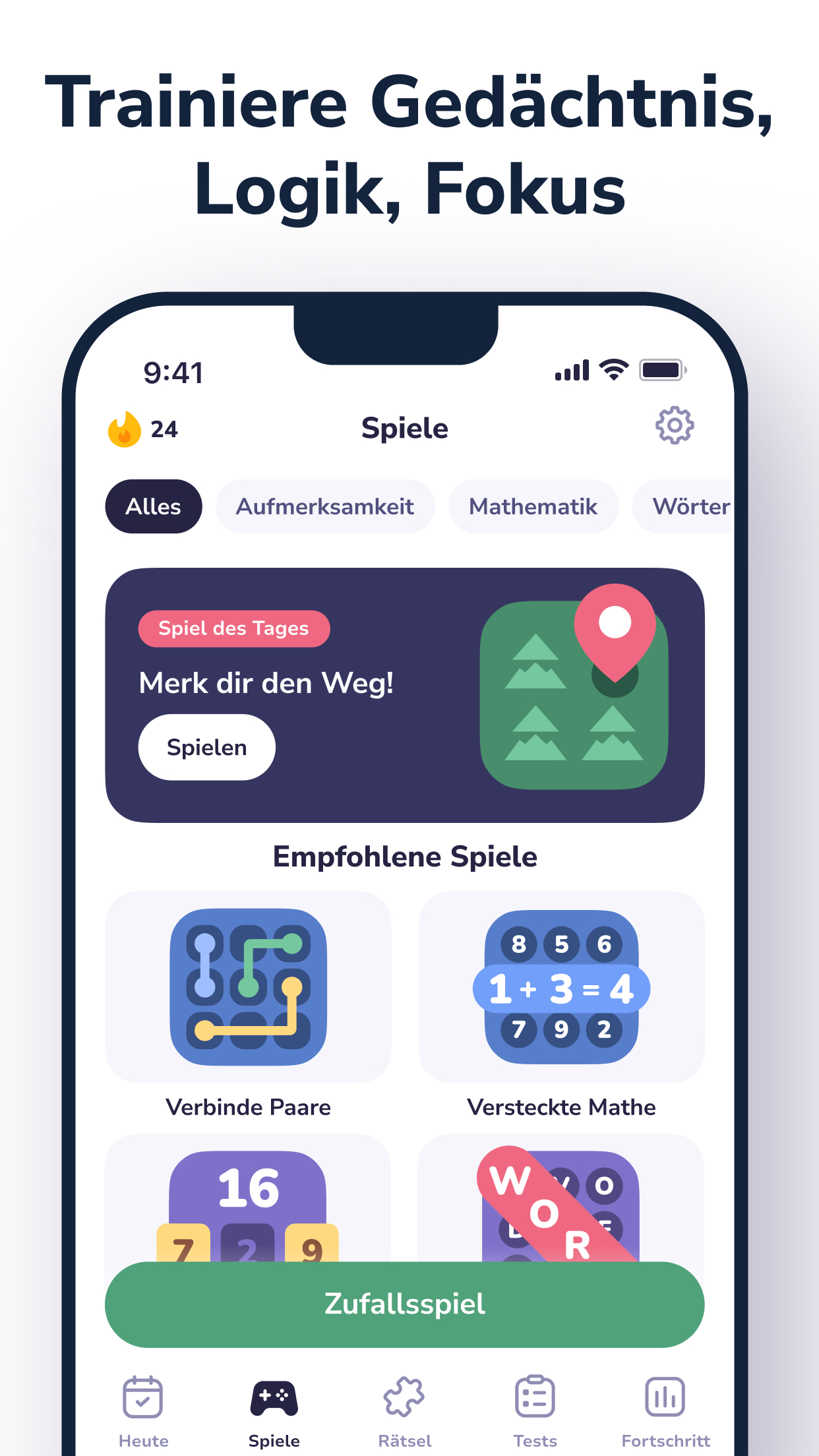 Logik-Spiele verfolgt einen innovativen Ansatz beim Training von Gedächtnis und Aufmerksamkeit, einschließlich Zahlen lernen. Bereits 15–20 Minuten täglich genügen, um mit diesem unterhaltsamen Gehirntraining deine grauen Zellen in Bestform zu bringen.