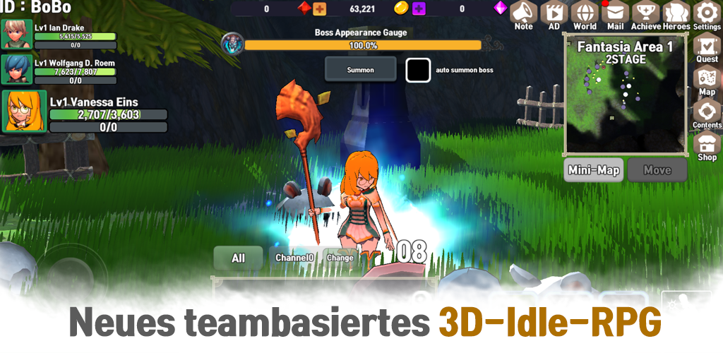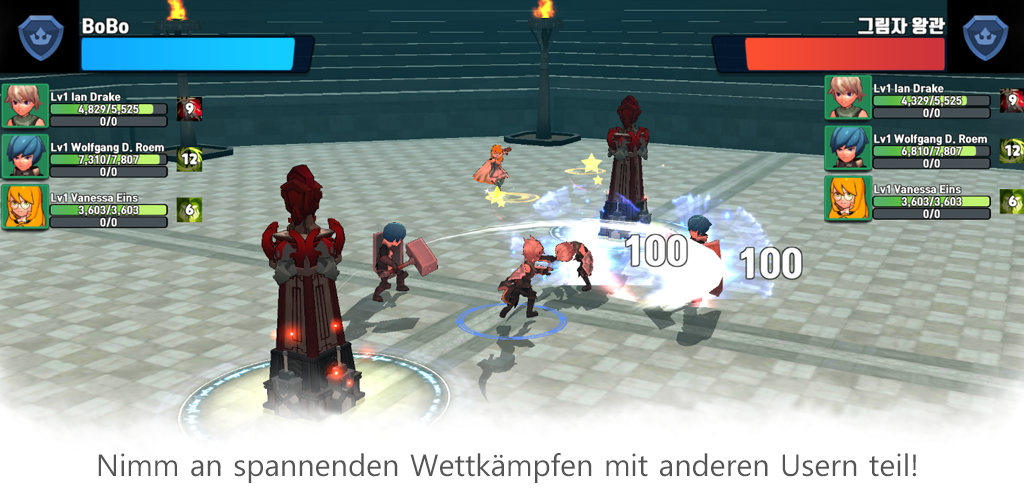 Nach dem Start kannst du Gelegenheitskämpfe und PVP-Arena spielen. Du kannst auch mit anderen Usern chatten und in der PVP-Arena Rang-Matches bestreiten.