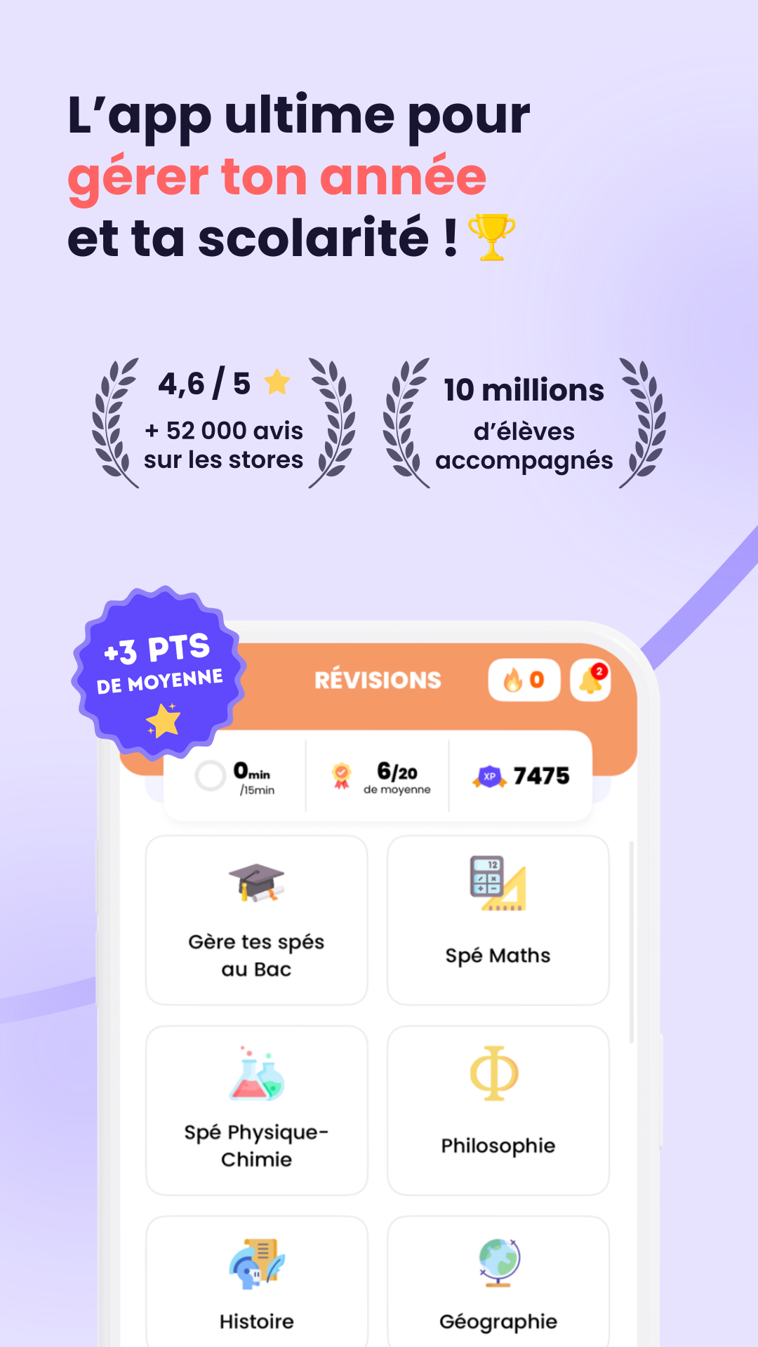 Mathematik, Französisch, Geschichte-Geografie, Physik-Chemie, Biologie und Geowissenschaften, Philosophie, Englisch … Alle deine Fächer. Alles in einer App.