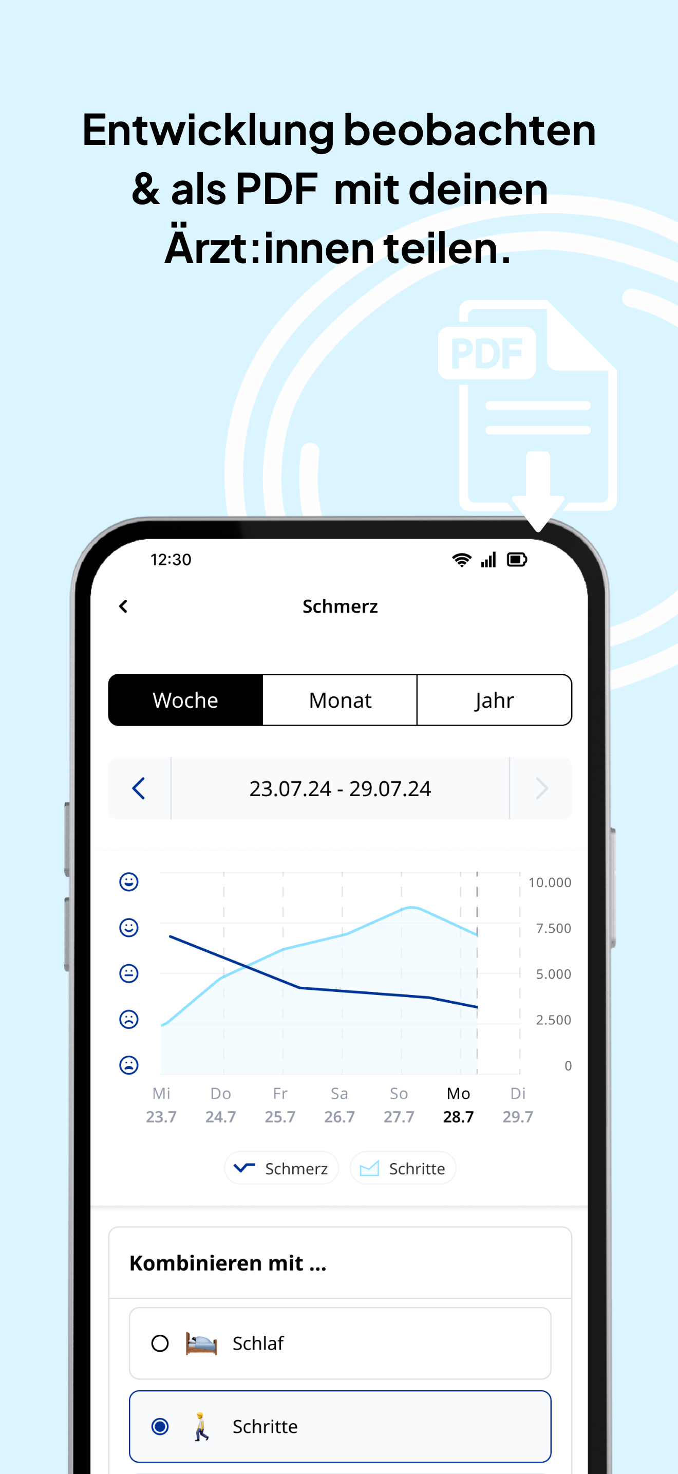 ◉ Teile deine Daten mit dem Behandlungsteam: Exportiere deine Einträge und teile sie mit deinem Arzt oder Therapeutenteam.
