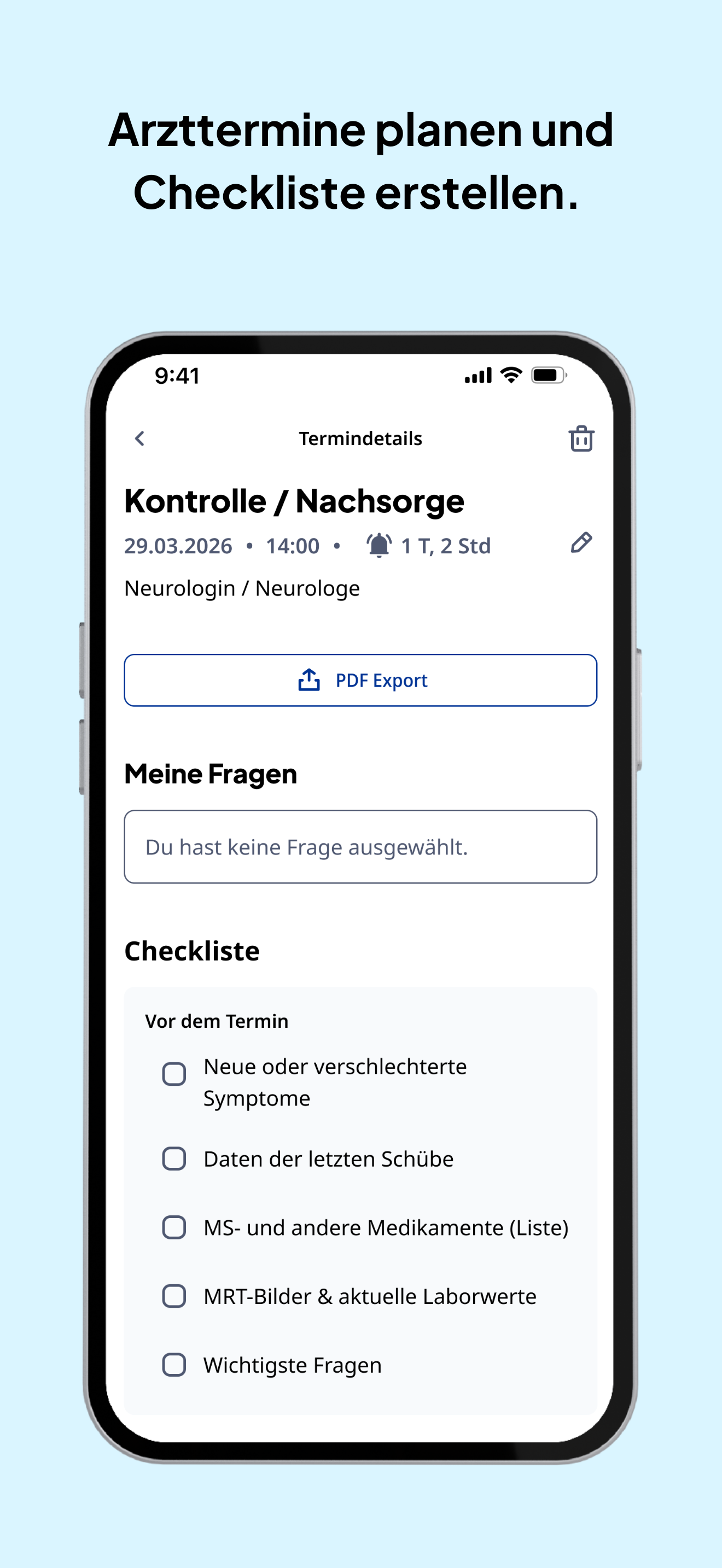 ◉ Bereite dich gezielt auf Arzttermine vor: Plane bevorstehende Arztbesuche strukturiert, lege Terminart und Erinnerungen fest, sammle wichtige Fragen und behalte den Überblick mit einer persönlichen Checkliste.