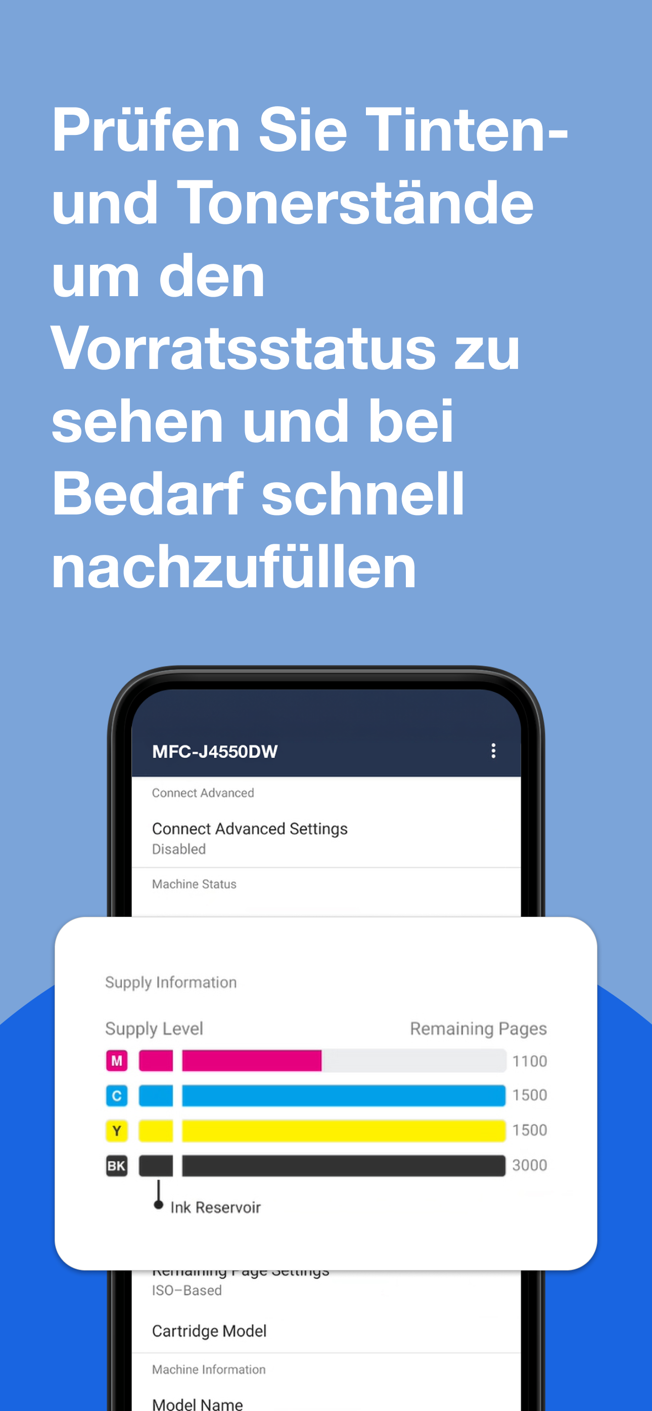 Brother Mobile Connect ermöglicht es Ihnen, Tinten- und Tonerstände auf bis zu 5 Geräten einfach zu überwachen. So kaufen Sie, was Sie brauchen, wann Sie es brauchen und ganz einfach über die App.