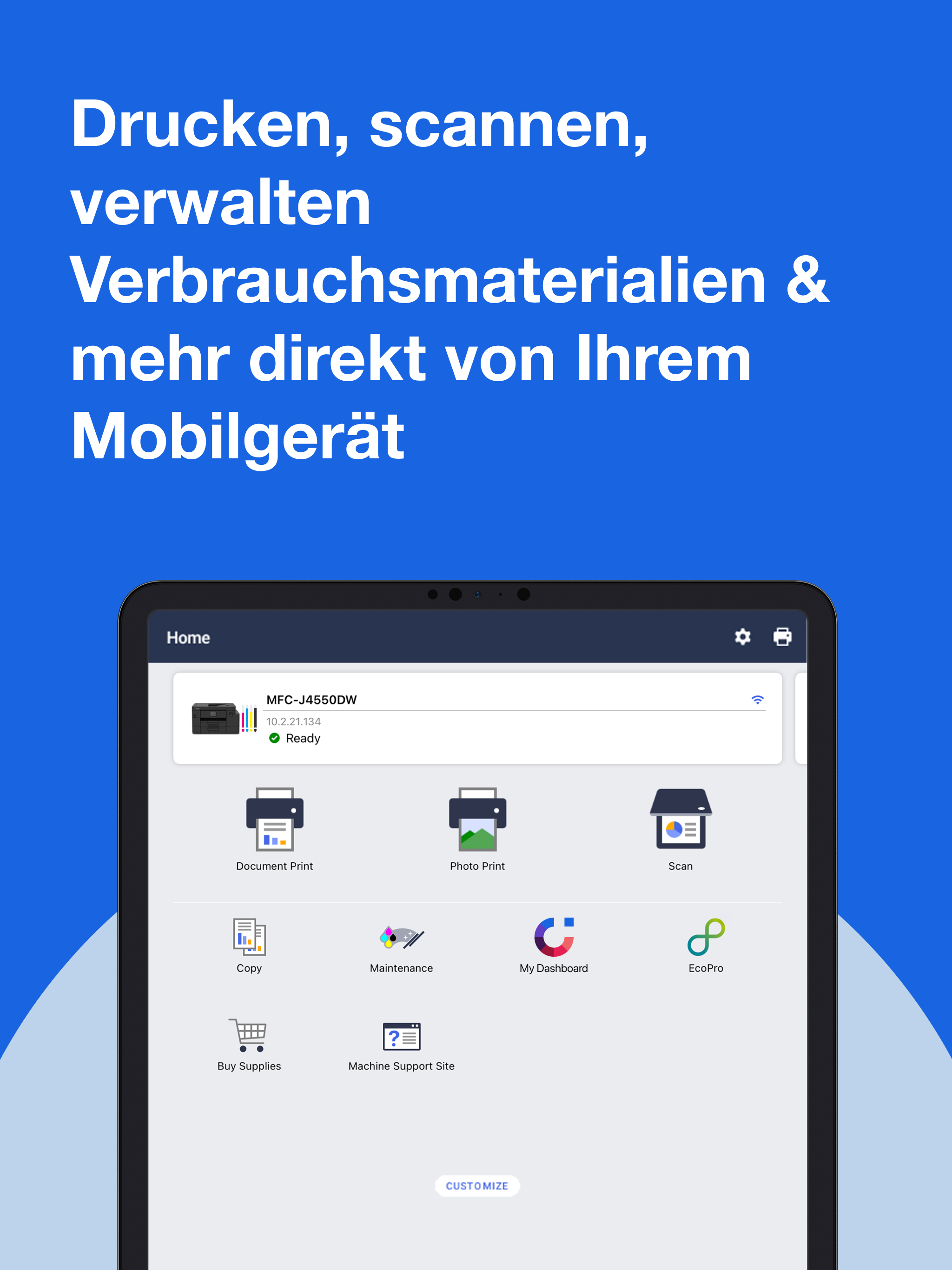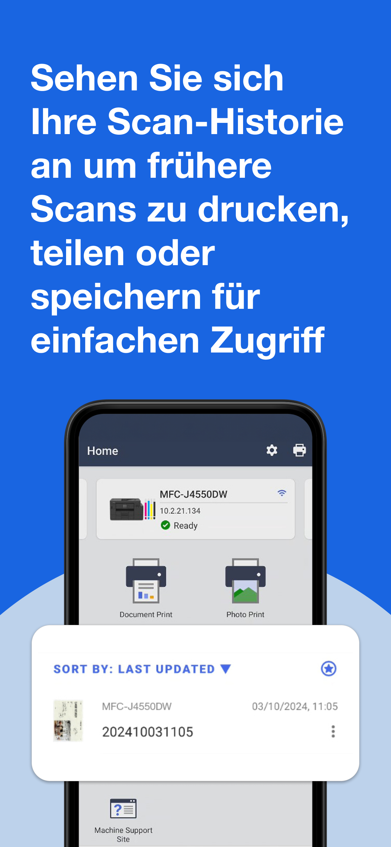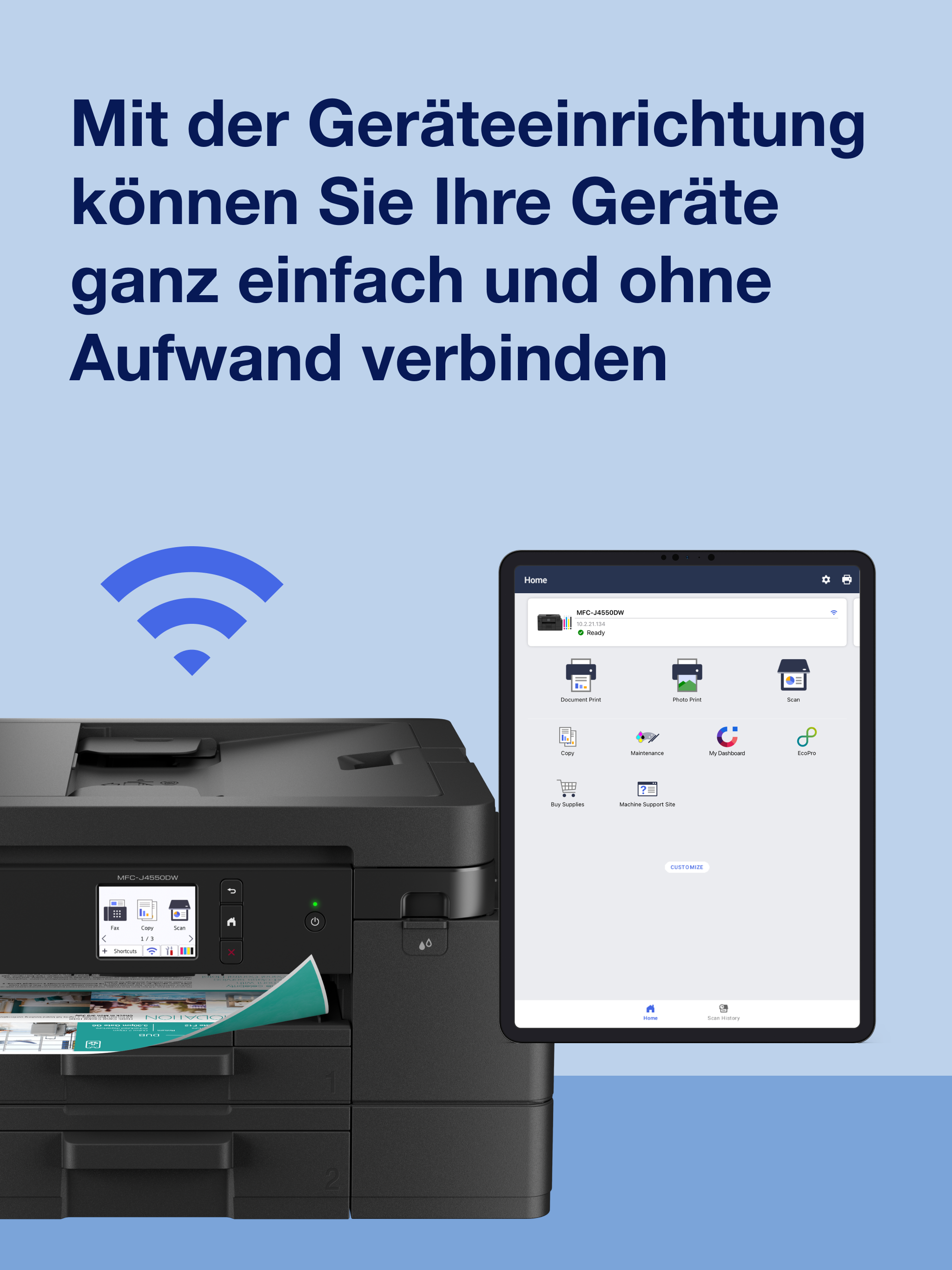 Mit unserer geführten Einrichtung können Sie Ihre Geräte in wenigen Minuten aktivieren und verbinden – und falls nötig, erreichen Sie unsere Support-Seiten ganz einfach, indem Sie das Support-Symbol auf der Startseite der Brother Mobile Connect App antippen.
