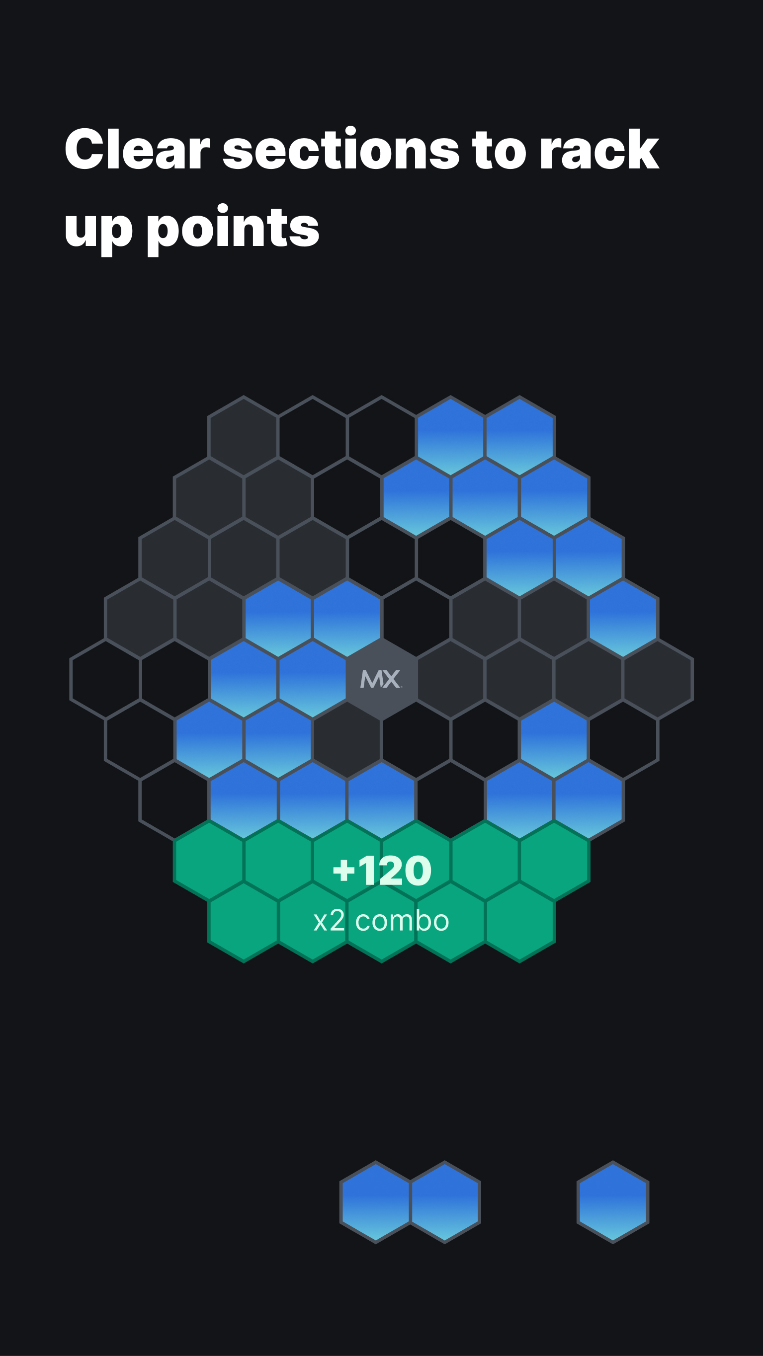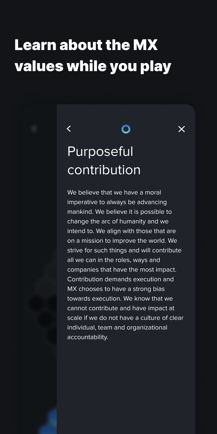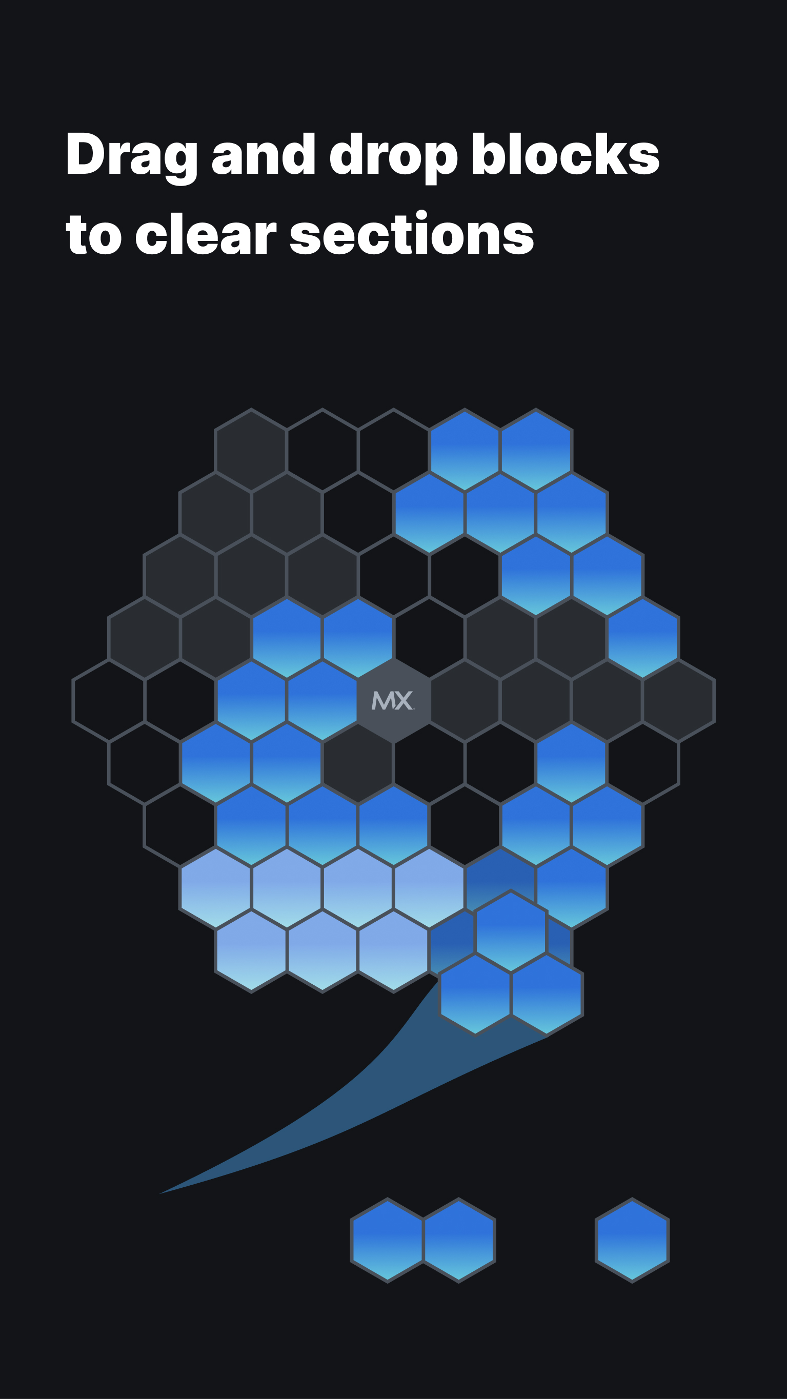 Ready for a challenge? Place hexagonal pieces on the board and try to keep going! Clear completed lines and completed "slices" to earn points toward your high score. Bonus points for combos and streaks. Can you beat your last attempt? Can you beat your friends? Ready for the *next* challenge? Over time you will unlock the MX values, and learn about how you can join our team of talented, exceptional people. Come build with us!