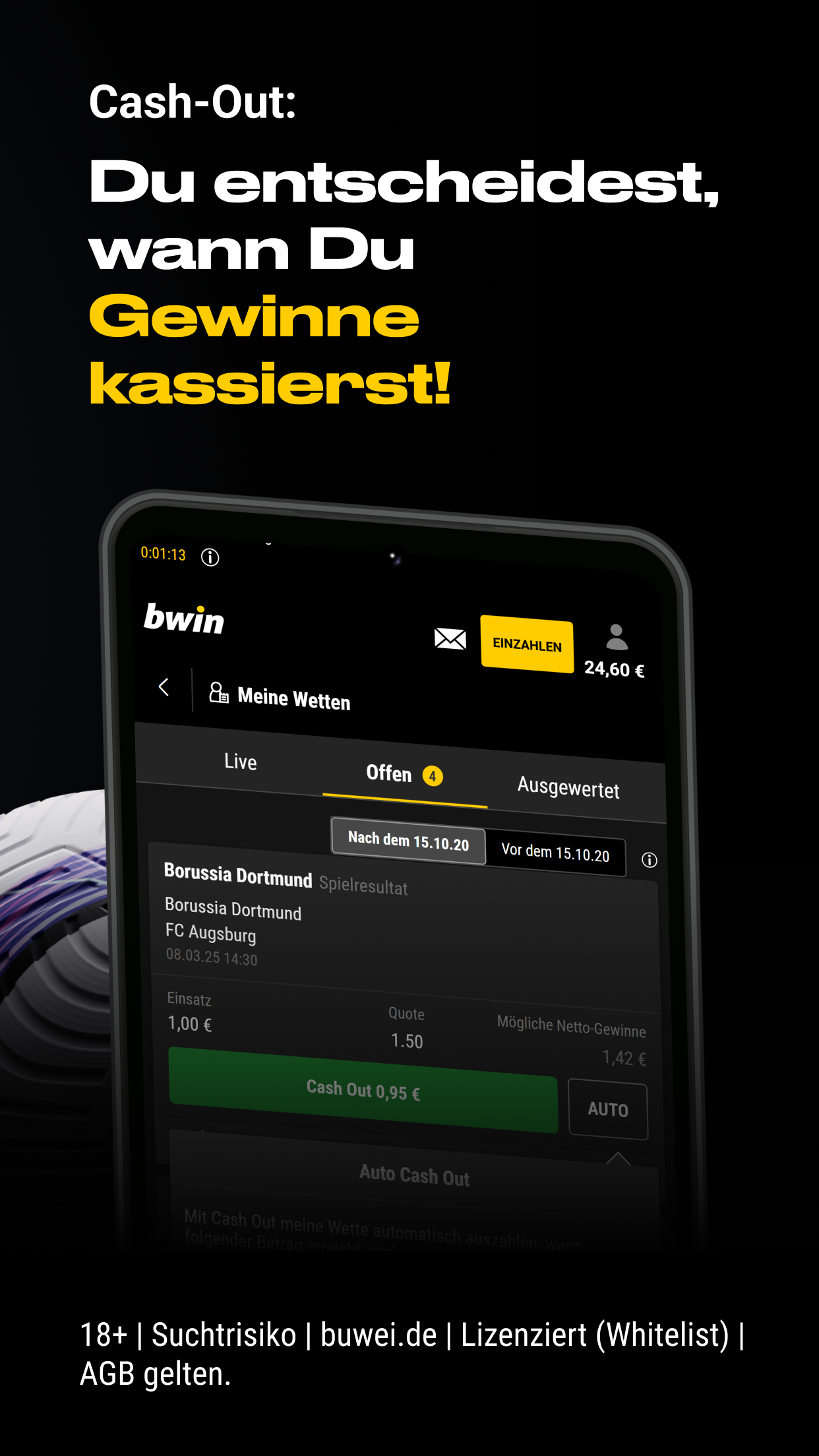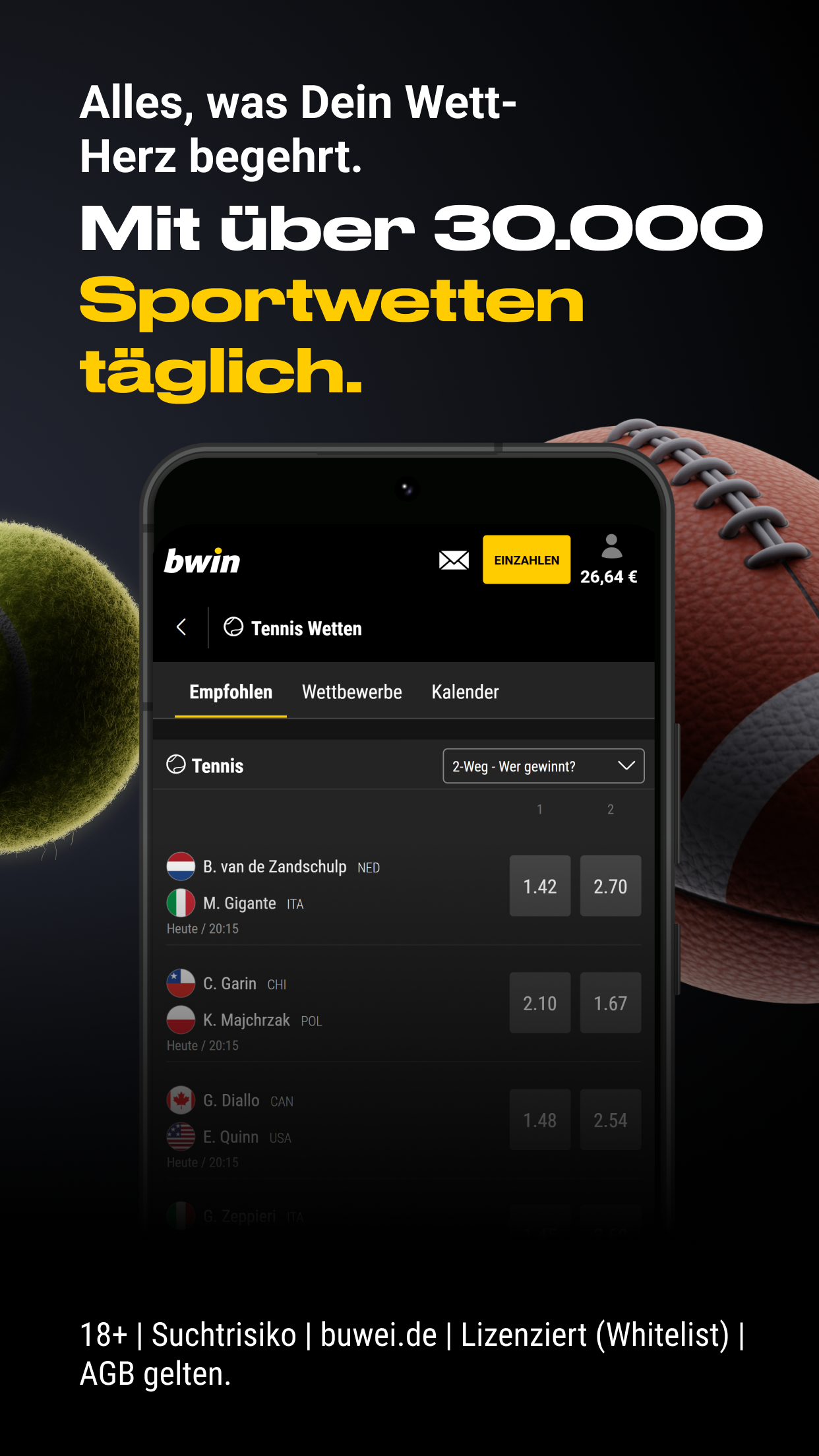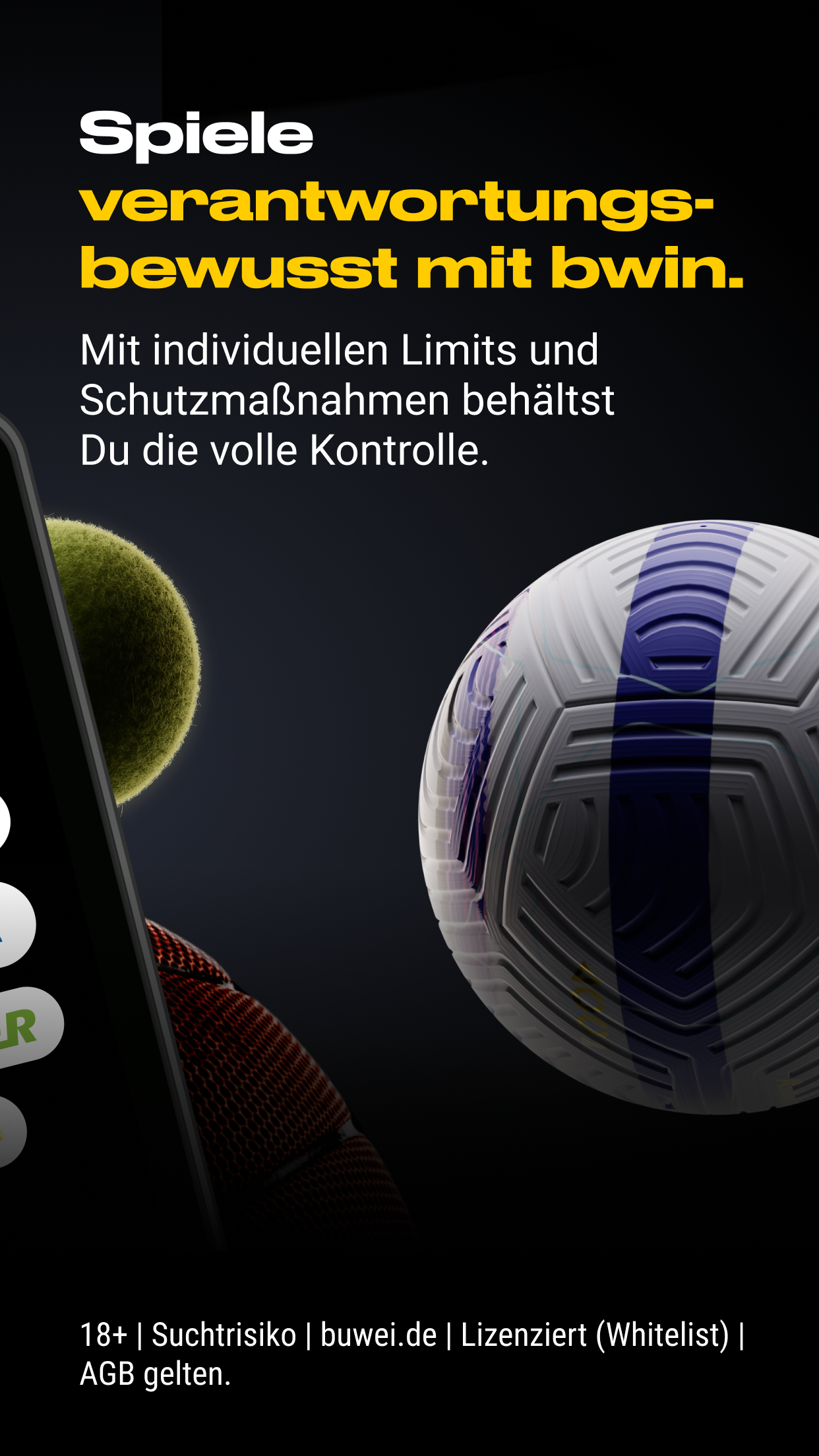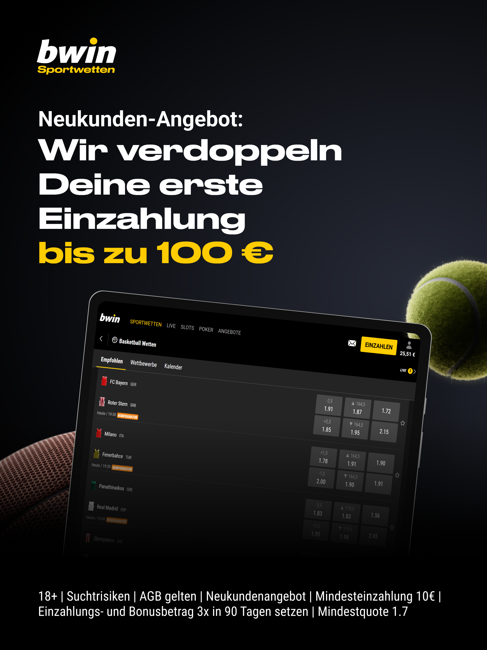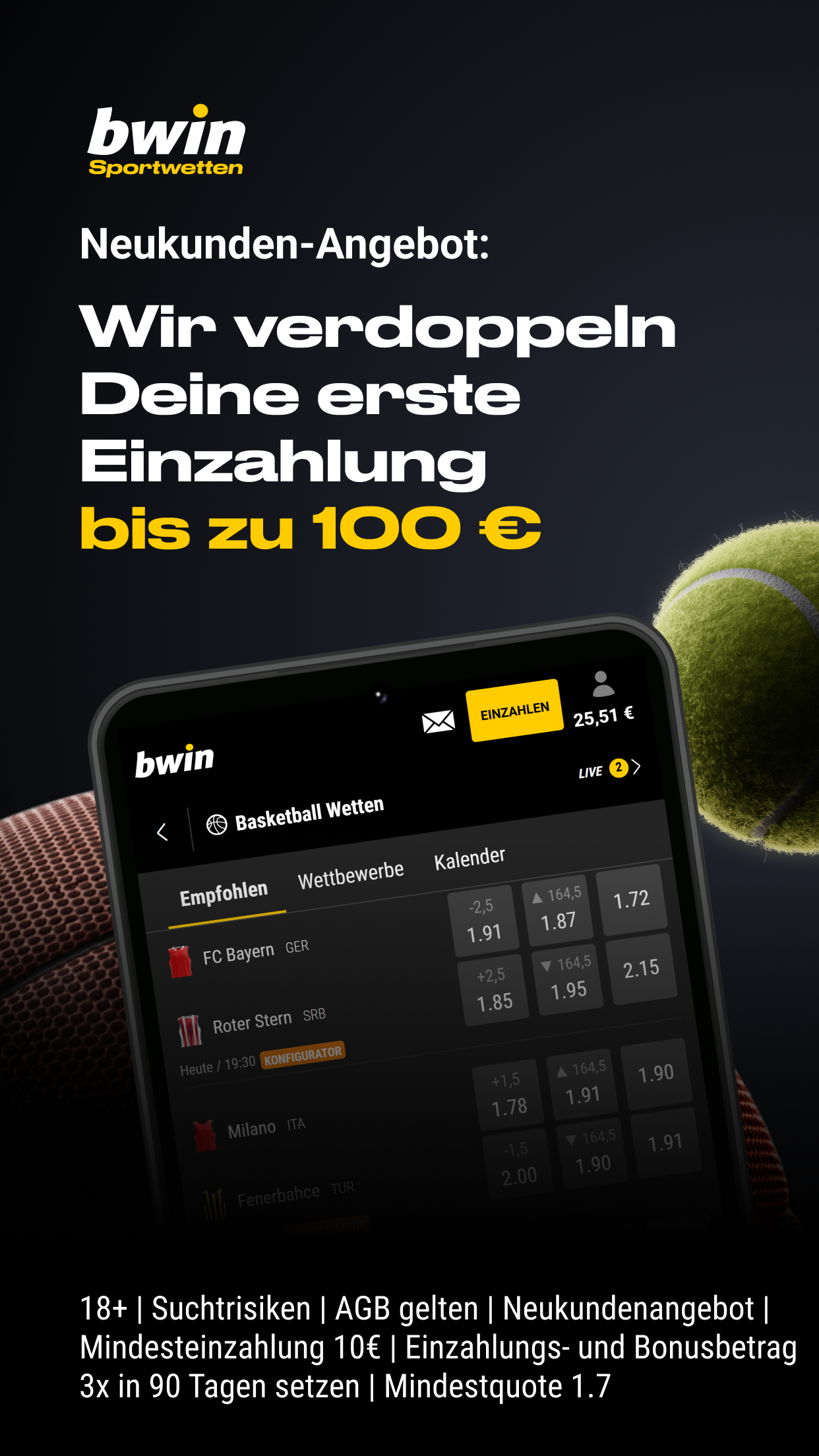 Der bwin Wett-Bonus für alle Neukunden: Wir verdoppeln Deine erste Einzahlung bis zu 100€ Anmelde-Angebot endet am 31.12.2025 um 23.59 Uhr. 18+, Suchtrisiko, buwei.de, Whitelist In der bwin Wett-App kannst du aus Tausenden Sportwetten und Wett-Quoten wählen. Wir bieten dir alles zum Thema Fußballwetten und warten mit unseren Online-Fußball-Quoten auf deine Fußball-Tipps zum Spieltag. Doch bei uns kannst du nicht nur auf Fußball wetten, sondern es gibt alle möglichen Sportwetten. Wähle täglich aus über 90 Sportarten und gib deinen Tipp zu unseren Wett-Quoten ab. Oder wie wäre es mit Live-Wetten während des Spiels? Mit AUTO-CASHOUT kannst du deinen Wettschein schon frühzeitig auszahlen lassen! Darum solltest du auf bwin setzen: - Wir bieten dir viele verschiedene Promos und Live-Sportwetten. Dank Cashout und Pre-Match-Wettquoten machen deine Online-Wetten auf Fußball und anderen Sport erst richtig Spaß. - Offiziell als Sport- und Fußball-Wettanbieter unter der Aufsicht der GGL genehmigt. - Die größte Auswahl: Wir bieten mehr Sport-Wettquoten für Online-Wetten als jede andere App auf dem Wettmarkt. - Mehr Wetten: Wähle aus 50.000 Sportwetten und Wettquoten täglich. Spiele In-Play oder Live-Sportwetten mit Cashout. - Mehr Kontrolle: Ändere deine Wette, nachdem du sie platziert hast. Lass deine Einzelwette oder Kombiwette vor Spielende auszahlen. Mit Cashout können sich unsere Wettquoten bei Fußballwetten und Sportwetten richtig lohnen. - Mehr Statistiken: Mit stets aktuellen Live-Statistiken in der bwin Sportwetten-App weißt du immer, wie es um deine Wetten steht, und kannst sie direkt auszahlen lassen. Unsere bwin App bietet diese Funktionen: - AUTO CASH OUT: Wähle den CASH OUT-Betrag vorab auf deinem Sport-Wettschein und erhalte live deinen Gewinn über die bwin App. KONFIGURATOR: Kombiniere verschiedene Tipps für ein und dasselbe Match in einer Sportwette. - LIVE-WETTEN: Schau dir Hunderte Live-Wetten und Wettquoten für deine Fußballwetten an und checke die MATCH-STATISTIKEN in der bwin Sportwetten-App. - LIVE-BENACHRICHTIGUNGEN: Bleibe bei deinen Sportwetten und Fußballwetten am Ball und erhalte live App-Benachrichtigungen, SMS oder E-Mails. Das Sportwetten-Angebot der bwin Sportwetten-App bietet über 90 Sportarten, auf die du jeden Tag wetten kannst, darunter: - Fußballwetten: internationale Live-Wetten auf Fußball in der Bundesliga, österreichische Bundesliga, Premier League, La Liga, Serie A und europäische Fußball-Turniere. - Tenniswetten: Wette auf jeden Grand Slam in unserer bwin Sportwetten-App. - Basketballwetten: NBA, Euro League, Bundesliga-Basketball und mehr erwarten dich in unserer bwin Sportwetten-App. In der bwin Sportwetten-App kannst du auf jeden Sport wetten – bei uns findest du ein komplettes Sportwetten-Angebot. Erlebe Action mit Live-Sport-Wetten und nutze Cashouts. Lade dir noch heute die bwin App herunter! bwin will die sicherste und innovativste Online-Gaming-Plattform werden. Verantwortungsbewusstes Glücksspiel 18+, Suchtrisiko, Whitelist.. Dies ist eine Echtgeld-Glücksspiel-App. Bitte spiele verantwortungsbewusst und setze nur soviel, wie du dir leisten kannst. Hilfe und Unterstützung bei Glücksspielsucht findest du unter www.buwei. de. Lizenzierung: bwin (Deutschland) Limited ist lizensiert und reguliert unter der Aufsicht der Gemeinsame Glücksspielbehörde der Länder (GGL).Weitere Lizenzinformationen finden sich auf www.bwin.de