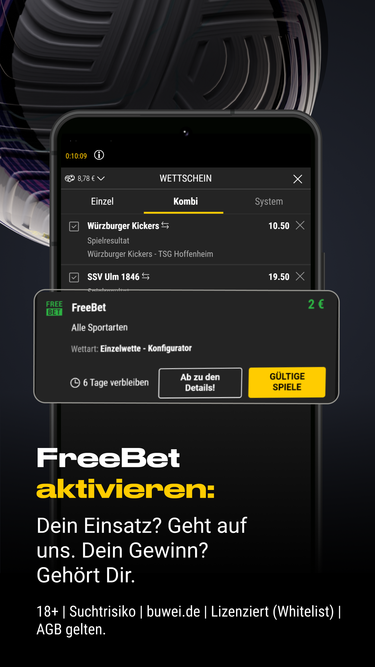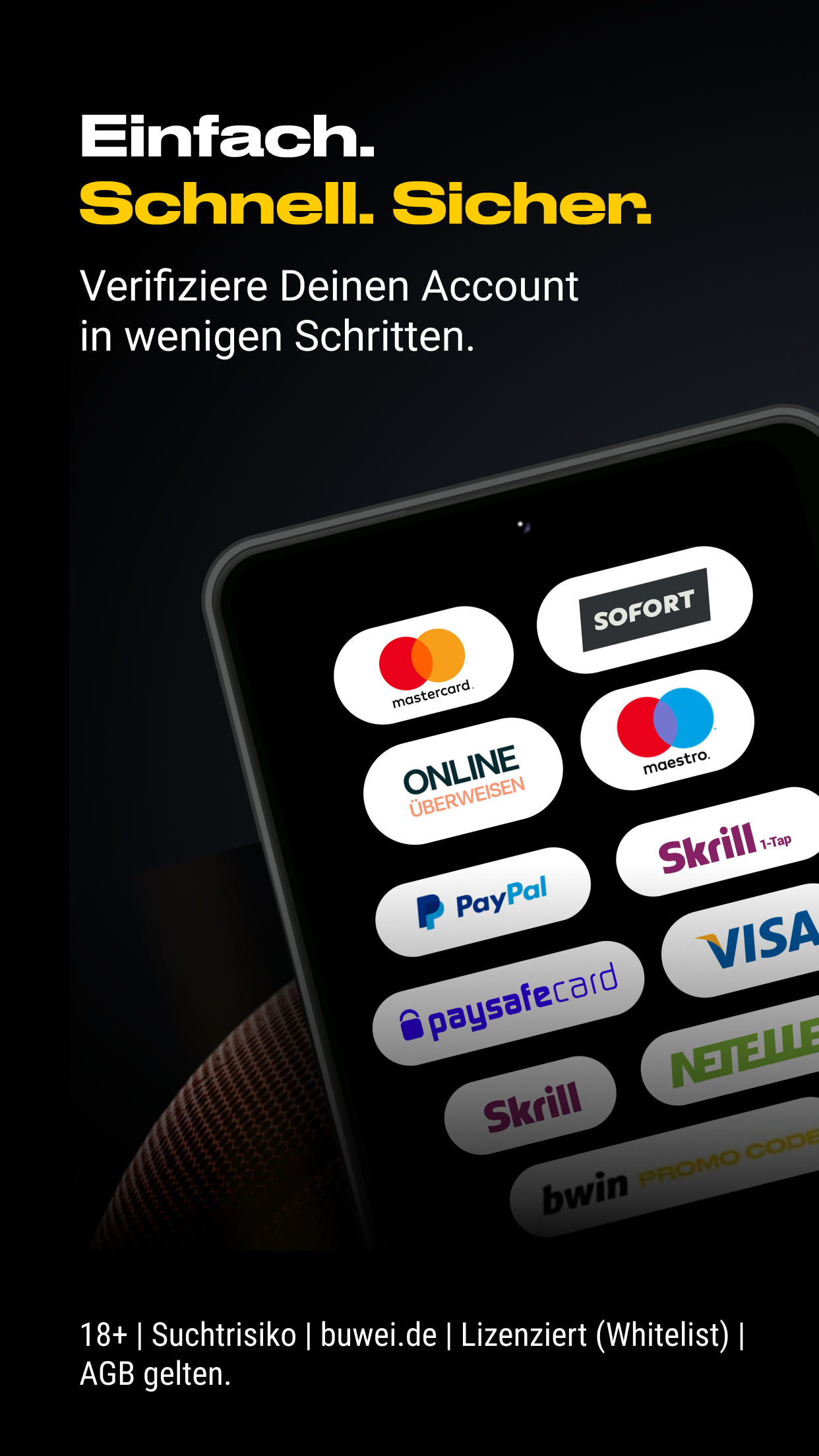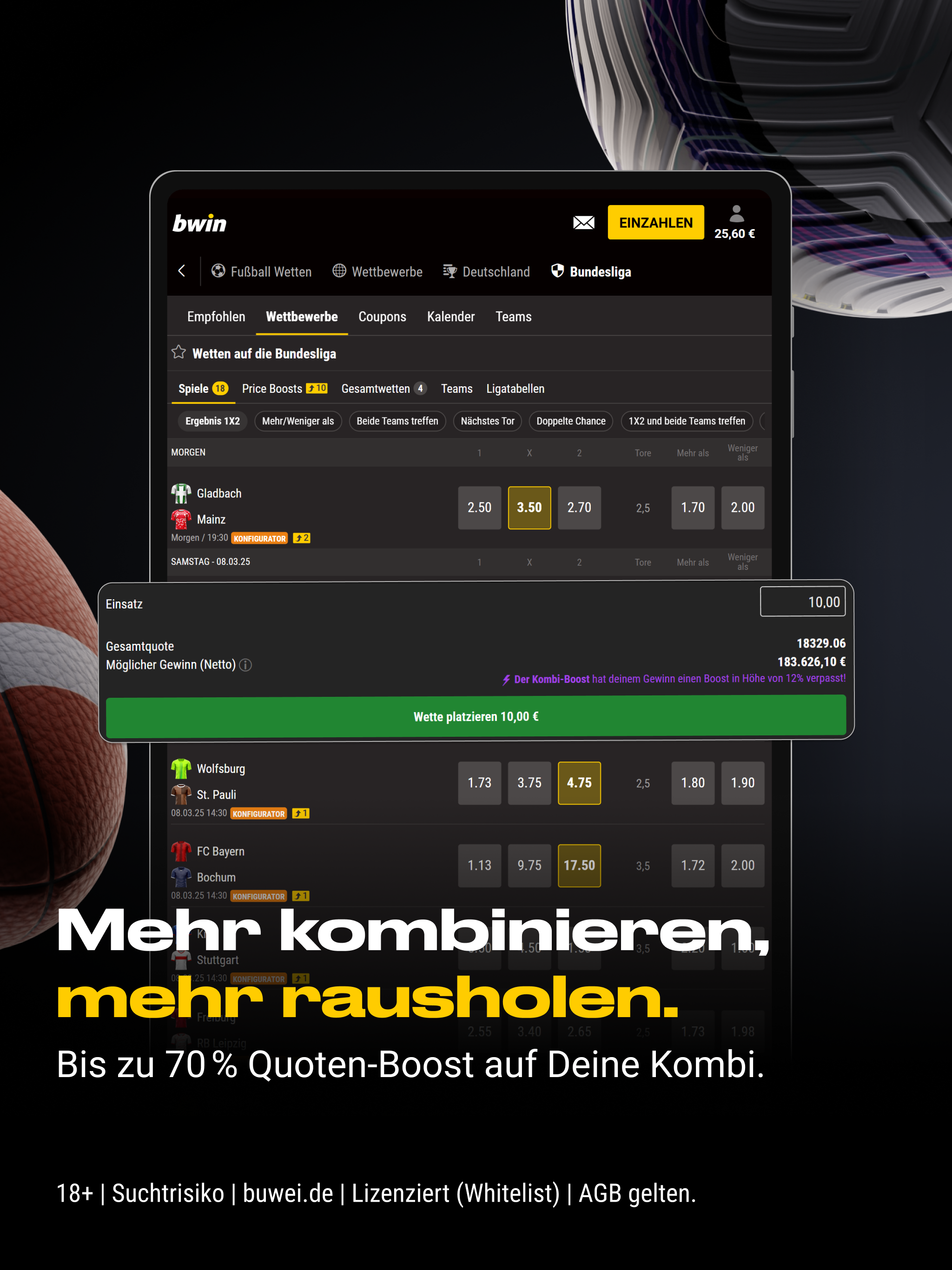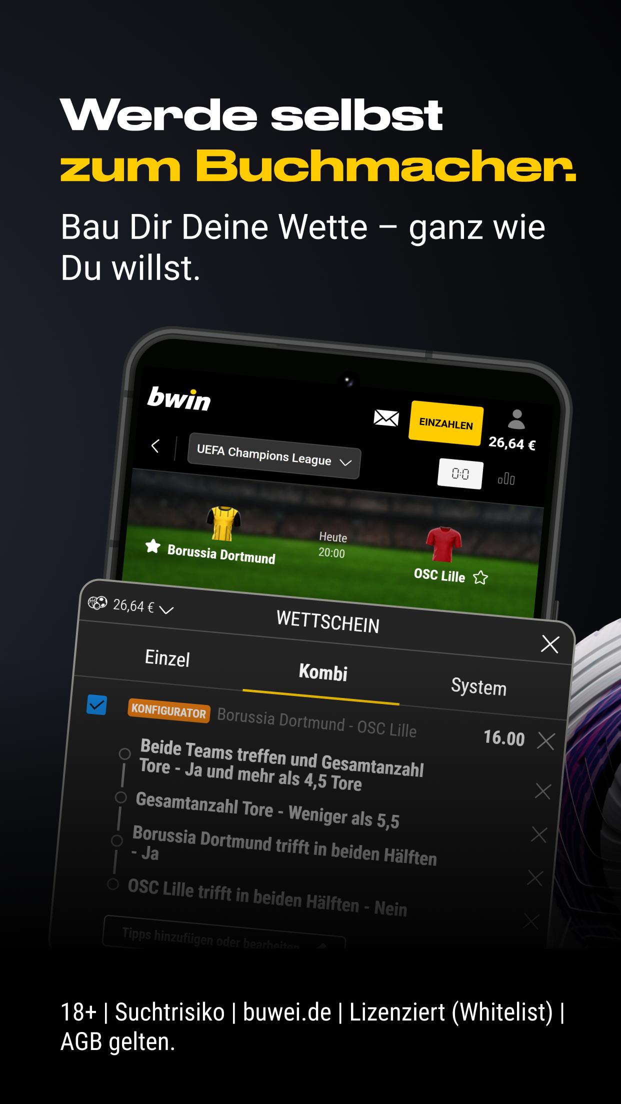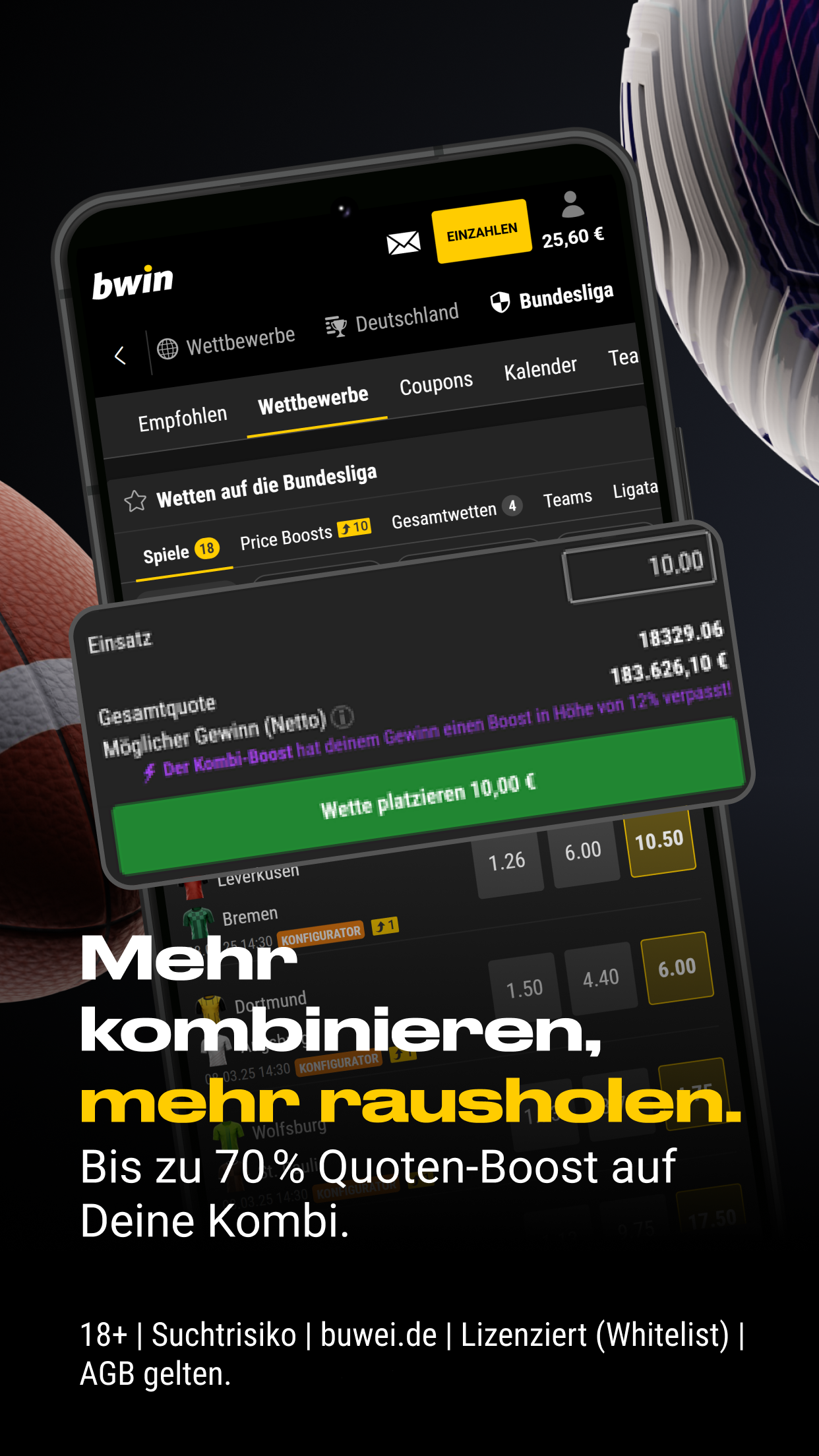 Der bwin Wett-Bonus für alle Neukunden: Wir verdoppeln Deine erste Einzahlung bis zu 100€ Anmelde-Angebot endet am 31.12.2025 um 23.59 Uhr. 18+, Suchtrisiko, buwei.de, Whitelist In der bwin Wett-App kannst du aus Tausenden Sportwetten und Wett-Quoten wählen. Wir bieten dir alles zum Thema Fußballwetten und warten mit unseren Online-Fußball-Quoten auf deine Fußball-Tipps zum Spieltag. Doch bei uns kannst du nicht nur auf Fußball wetten, sondern es gibt alle möglichen Sportwetten. Wähle täglich aus über 90 Sportarten und gib deinen Tipp zu unseren Wett-Quoten ab. Oder wie wäre es mit Live-Wetten während des Spiels? Mit AUTO-CASHOUT kannst du deinen Wettschein schon frühzeitig auszahlen lassen! Darum solltest du auf bwin setzen: - Wir bieten dir viele verschiedene Promos und Live-Sportwetten. Dank Cashout und Pre-Match-Wettquoten machen deine Online-Wetten auf Fußball und anderen Sport erst richtig Spaß. - Offiziell als Sport- und Fußball-Wettanbieter unter der Aufsicht der GGL genehmigt. - Die größte Auswahl: Wir bieten mehr Sport-Wettquoten für Online-Wetten als jede andere App auf dem Wettmarkt. - Mehr Wetten: Wähle aus 50.000 Sportwetten und Wettquoten täglich. Spiele In-Play oder Live-Sportwetten mit Cashout. - Mehr Kontrolle: Ändere deine Wette, nachdem du sie platziert hast. Lass deine Einzelwette oder Kombiwette vor Spielende auszahlen. Mit Cashout können sich unsere Wettquoten bei Fußballwetten und Sportwetten richtig lohnen. - Mehr Statistiken: Mit stets aktuellen Live-Statistiken in der bwin Sportwetten-App weißt du immer, wie es um deine Wetten steht, und kannst sie direkt auszahlen lassen. Unsere bwin App bietet diese Funktionen: - AUTO CASH OUT: Wähle den CASH OUT-Betrag vorab auf deinem Sport-Wettschein und erhalte live deinen Gewinn über die bwin App. KONFIGURATOR: Kombiniere verschiedene Tipps für ein und dasselbe Match in einer Sportwette. - LIVE-WETTEN: Schau dir Hunderte Live-Wetten und Wettquoten für deine Fußballwetten an und checke die MATCH-STATISTIKEN in der bwin Sportwetten-App. - LIVE-BENACHRICHTIGUNGEN: Bleibe bei deinen Sportwetten und Fußballwetten am Ball und erhalte live App-Benachrichtigungen, SMS oder E-Mails. Das Sportwetten-Angebot der bwin Sportwetten-App bietet über 90 Sportarten, auf die du jeden Tag wetten kannst, darunter: - Fußballwetten: internationale Live-Wetten auf Fußball in der Bundesliga, österreichische Bundesliga, Premier League, La Liga, Serie A und europäische Fußball-Turniere. - Tenniswetten: Wette auf jeden Grand Slam in unserer bwin Sportwetten-App. - Basketballwetten: NBA, Euro League, Bundesliga-Basketball und mehr erwarten dich in unserer bwin Sportwetten-App. In der bwin Sportwetten-App kannst du auf jeden Sport wetten – bei uns findest du ein komplettes Sportwetten-Angebot. Erlebe Action mit Live-Sport-Wetten und nutze Cashouts. Lade dir noch heute die bwin App herunter! bwin will die sicherste und innovativste Online-Gaming-Plattform werden. Verantwortungsbewusstes Glücksspiel 18+, Suchtrisiko, Whitelist.. Dies ist eine Echtgeld-Glücksspiel-App. Bitte spiele verantwortungsbewusst und setze nur soviel, wie du dir leisten kannst. Hilfe und Unterstützung bei Glücksspielsucht findest du unter www.buwei. de. Lizenzierung: bwin (Deutschland) Limited ist lizensiert und reguliert unter der Aufsicht der Gemeinsame Glücksspielbehörde der Länder (GGL).Weitere Lizenzinformationen finden sich auf www.bwin.de