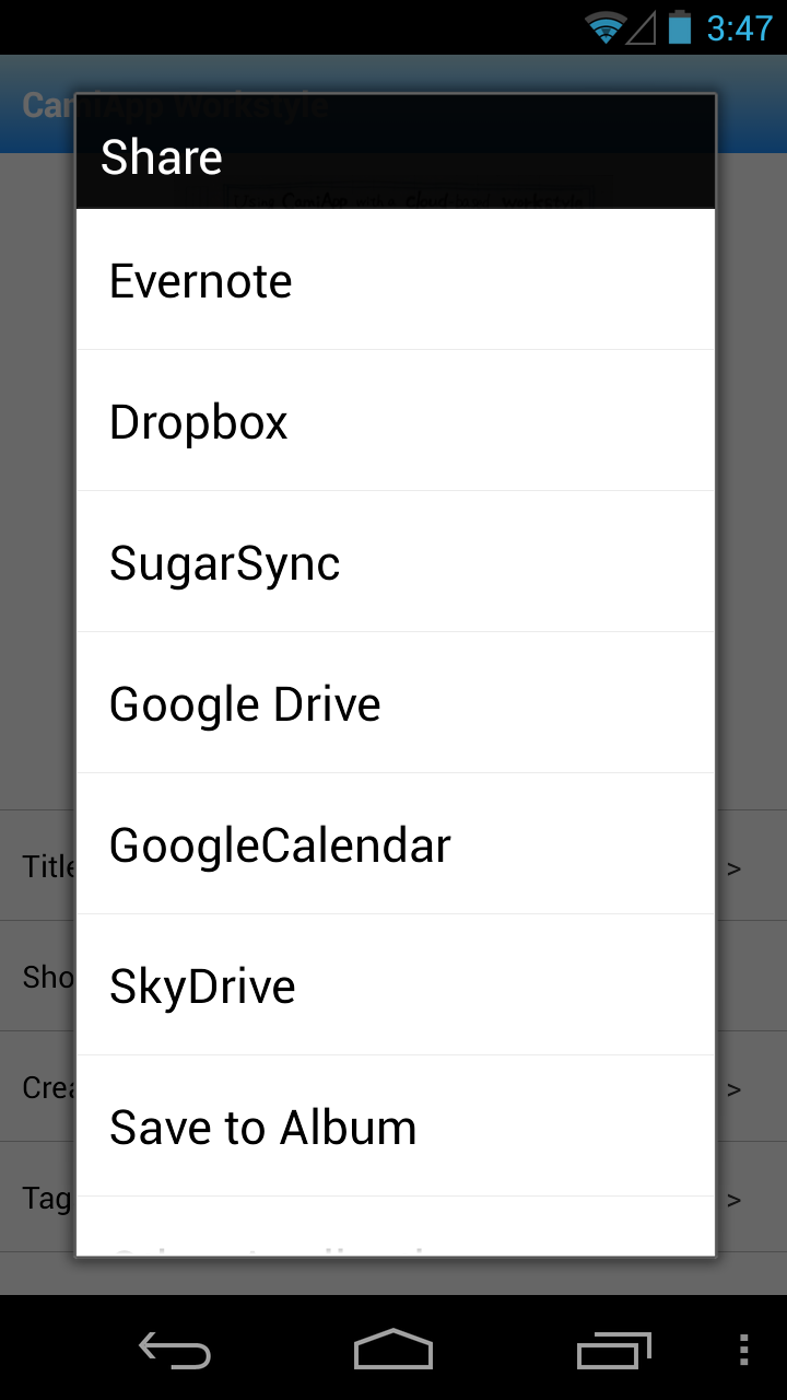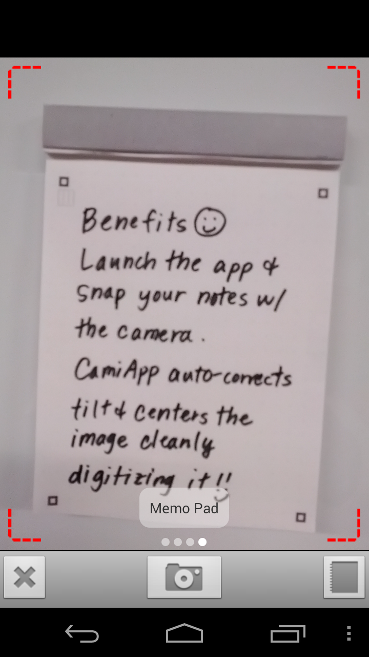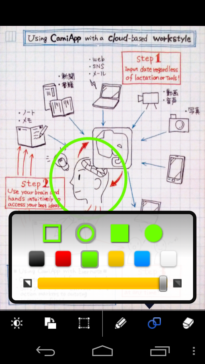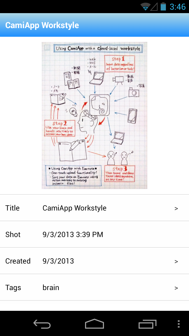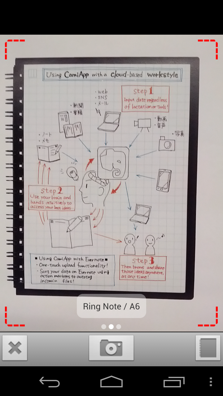CamiApp digitize paper notebooks, and automatically adjust angle and shape to fit the screen. In addition, by using with CamiApp S, digitize the handwritten character you wrote. You can sort and organize digitized notes. Also, search notes on your smartphone and tablet. Share your notes by cloud services. ============================== [HOW TO USE/FEATURES] ============================== ■STEP1 Scan paper notebooks Run the app and snap your notes. CamiApp auto-corrects tilt and centers the image, cleanly digitizing it! In case of CamiApp S, turn on the power of CamiApp S. Put the check to “SAVE box”. That's all. ■STEP2 Organize your digitized notes Add a title, date, tags, and comments to make searching a snap and organizing easy! In addition, CamiApp S recognizes your handwritten character and change to TEXT(JAPANESE ONLY). ■STEP3 Share your digitized notes You can upload to Google Calendar, Google Drive, Evernote, Dropbox, ShareFile and other cloud services is available. * Shared image file format is JPEG, PDF. ■FEATURE1 ACTION MARKERs You can quickly and easily not only tag notes but also upload notes to cloud services and sharing other apps by filling the specified area of Action Marker. ■FEATURE2 Edit your digitized notes Use shape and pen tools to edit your image! ■FEATURE3 Cooperation between applications. * Canon "CaptureOnTouch Mobile" / PFU "ScanSnap Connect Application" - If you have Canon high speed document scanners or PFU ScanSnap iX100/iX500, you can DIRECTLY AND EASILY scan and import notes to CamiApp via each ordinal scanner apps. - You can quickly and easily not only send JPEG files but also tag notes, send notes via e-mail and upload JPEG files to your favorite cloud services by making use of "scanner settings". ※NOTES: THIS FEATURE WORKS WITH Canon CaptureOnTouch Mobile V2.5 OR LATER. ※NOTES: THIS FEATURE WORKS WITH PFU ScanSnap Connect Application V2.4.0 OR LATER. * Supported the camera app plugin installed in Xperia(TM) Z1. * Supported Personal Protect in ELUGA P. ============================== [REQUIREMENTS] ============================== CamiApp app is designed for CamiApp notebooks and memo pads or CamiApp S from KOKUYO. Get them at your nearest KOKUYO retailer. 【CamiApp and other products compatible with CamiApp】http://goo.gl/DwJucP 【CamiApp S】http://goo.gl/qVHYfw ■Operation checked with the following devices 【CamiApp】http://goo.gl/tUadv (JAPANESE ONLY) 【CamiApp S】A Bluetooth 2.1+EDR ready mobile device running Android 5.0 or later. * PLEASE NOTE THAT CamiApp IS NOT COMPATIBLE WITH ANDROID DEVICES THAT DO NOT HAVE AUTO FOCUS CAMERA. * Recent improvement may add devices on which this app works. Also, you can try sample file. - sample file http://goo.gl/70JJy * YOU MUST INSTALL THE APP "CamiApp S Setting" FROM Google Play, IF YOU USE CamiApp S. *"shortcut for the shooting display frequently used" not working on Android 8.0 All other product and service names listed in are trademarks or registered trademarks of their respective companies.