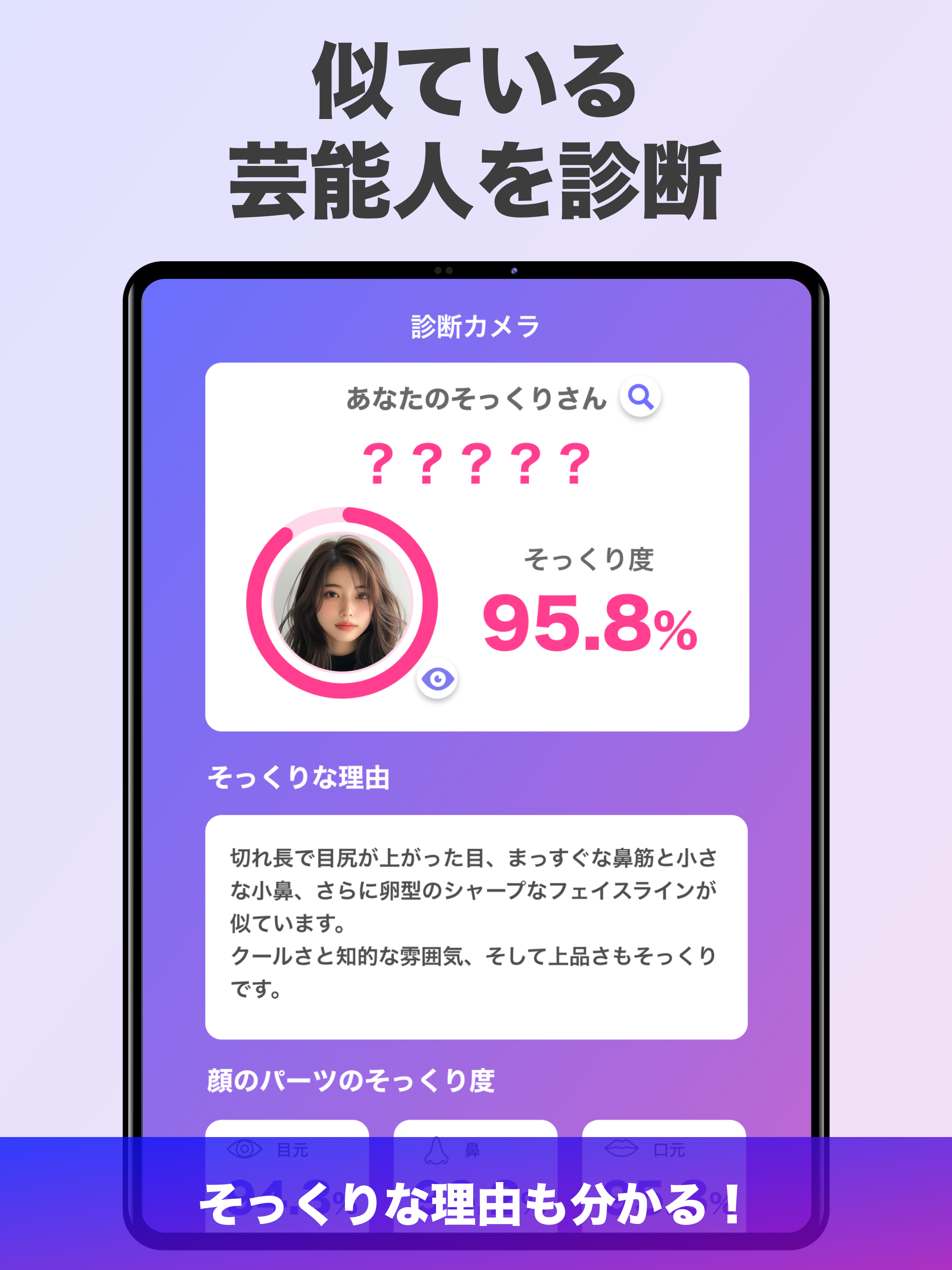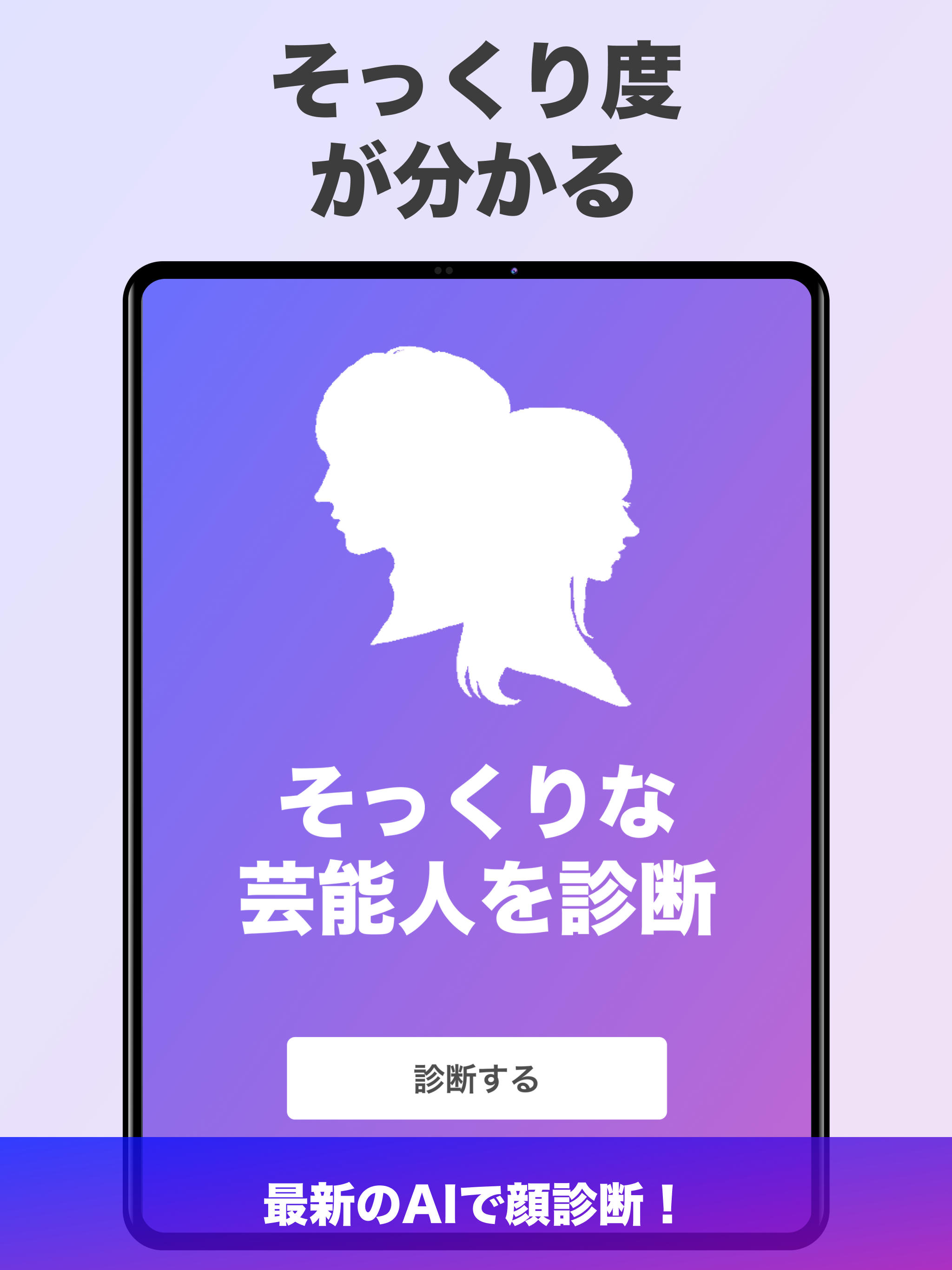 Eine Diagnose-App, die Prominente und Entertainer identifiziert, die dir ähnlich sehen! Was glaubst du, wer sie sind? „Diagnosis Camera“ ist eine Kamera-App, die mithilfe von Gesichtserkennung und künstlicher Intelligenz (KI) anhand deiner Fotos Prominente und Entertainer identifiziert, die dir ähnlich sehen. Du kannst deine Ergebnisse auch über LINE, Facebook und X (Twitter) mit Freunden teilen. Die Diagnose basiert auf einer Vielzahl von Mustern, darunter Schauspielerinnen, Schauspieler, Komiker, Idole, Models und internationale Berühmtheiten! Du kannst auch deine Familie, Freunde und deinen Partner diagnostizieren! Das sorgt garantiert für Abwechslung in der Schule, bei der Arbeit oder auf einer Party! Die Prominenten und Entertainer, denen du ähnelst, ändern sich je nach Aufnahmewinkel. Dreh dein Gesicht also um, um Prominente und Entertainer zu finden, die dir im Profil ähnlich sehen, nicht nur von vorne! Du kannst deine vorherigen Diagnosen jederzeit mit der Bilderbuchfunktion überprüfen. Du bist vielleicht wunderschön! [Einfach zu bedienen!] 1. Wählen Sie das Geschlecht und die Kategorie aus, für die Sie eine Diagnose durchführen möchten. 2. Die Kamera startet. Machen Sie ein Foto von Ihrem Gesicht. 3. Die Analyse von Prominenten und Entertainern, denen Sie ähnlich sehen, beginnt. 4. Sobald die Analyse abgeschlossen ist, werden die Diagnoseergebnisse angezeigt. 5. Sie können Ihre Diagnoseergebnisse mit Ihren Freunden teilen. [Hinweise] – Die Diagnoseergebnisse können je nach Aufnahmewinkel des Gesichtsfotos mit der Diagnosekamera variieren. – Mit der Diagnose-App aufgenommene Fotos werden nicht gespeichert. – Mit der Kamera-App aufgenommene Bilder werden ausschließlich für die Diagnose verwendet. – Bitte verwenden Sie die App unbesorgt.