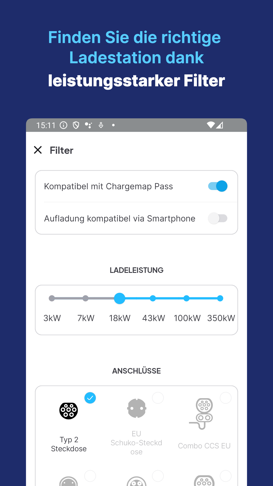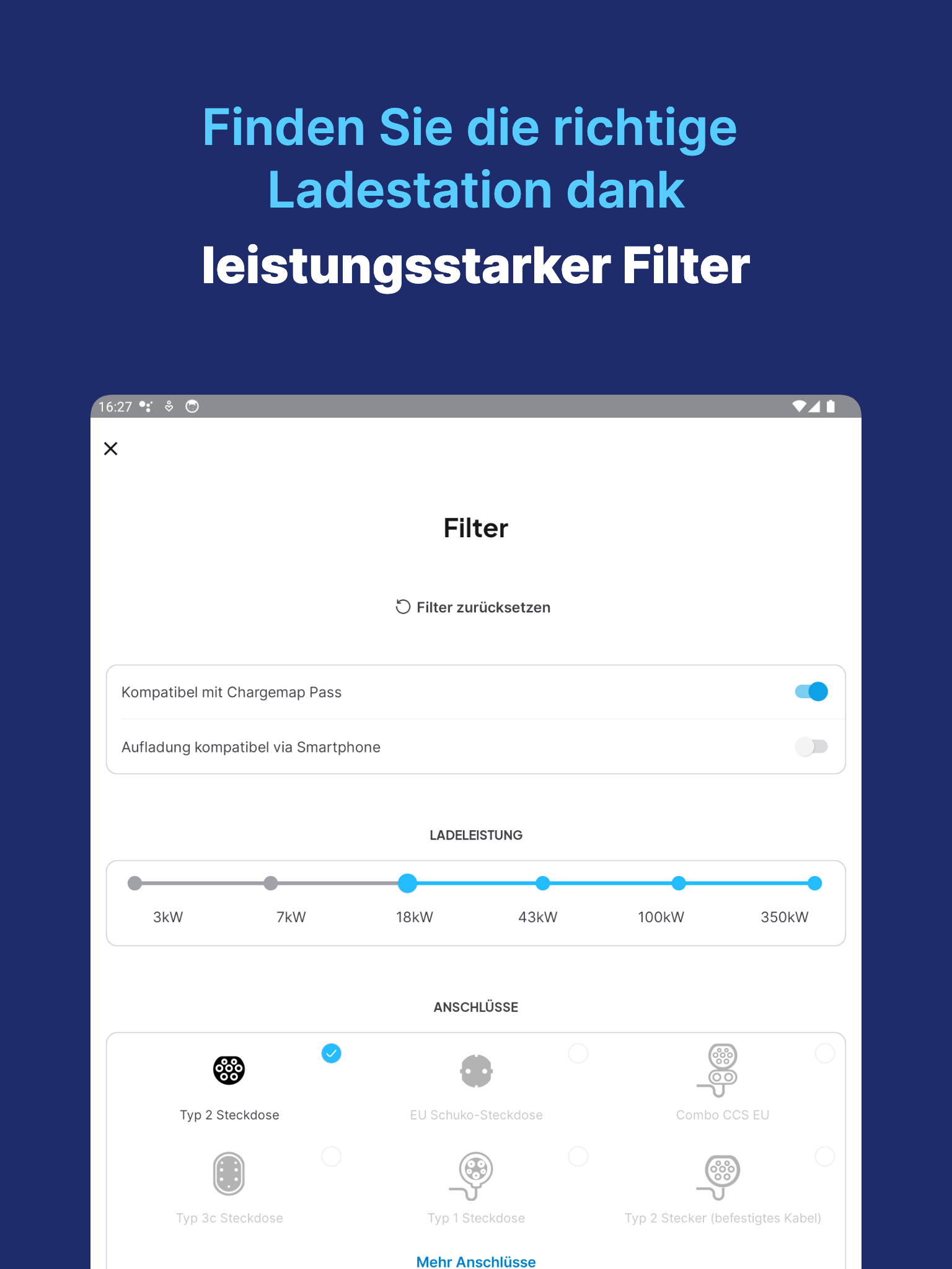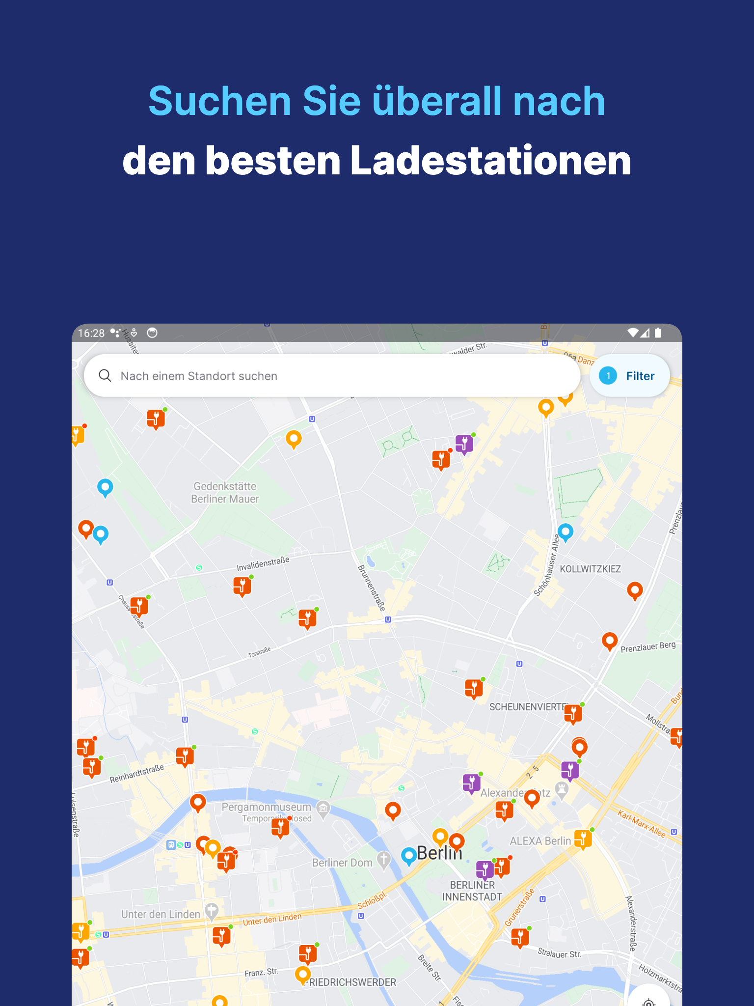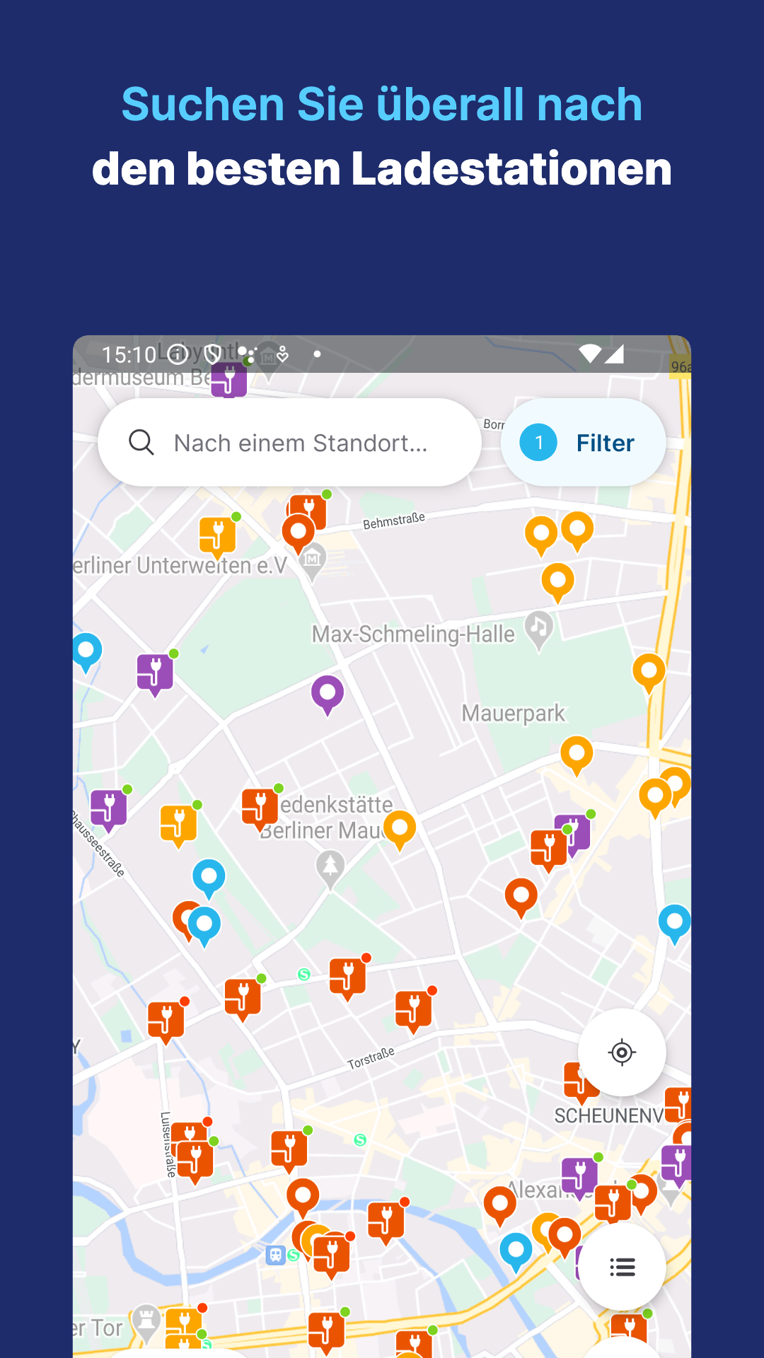 Mithilfe leistungsstarker Filter finden Sie die Ladestationen, die Ihren Bedürfnissen entsprechen: kostenlose Ladestationen, die am besten bewerteten Ladestationen, Schnellladestationen, bevorzugte Ladenetze, nur an Autobahnen etc.