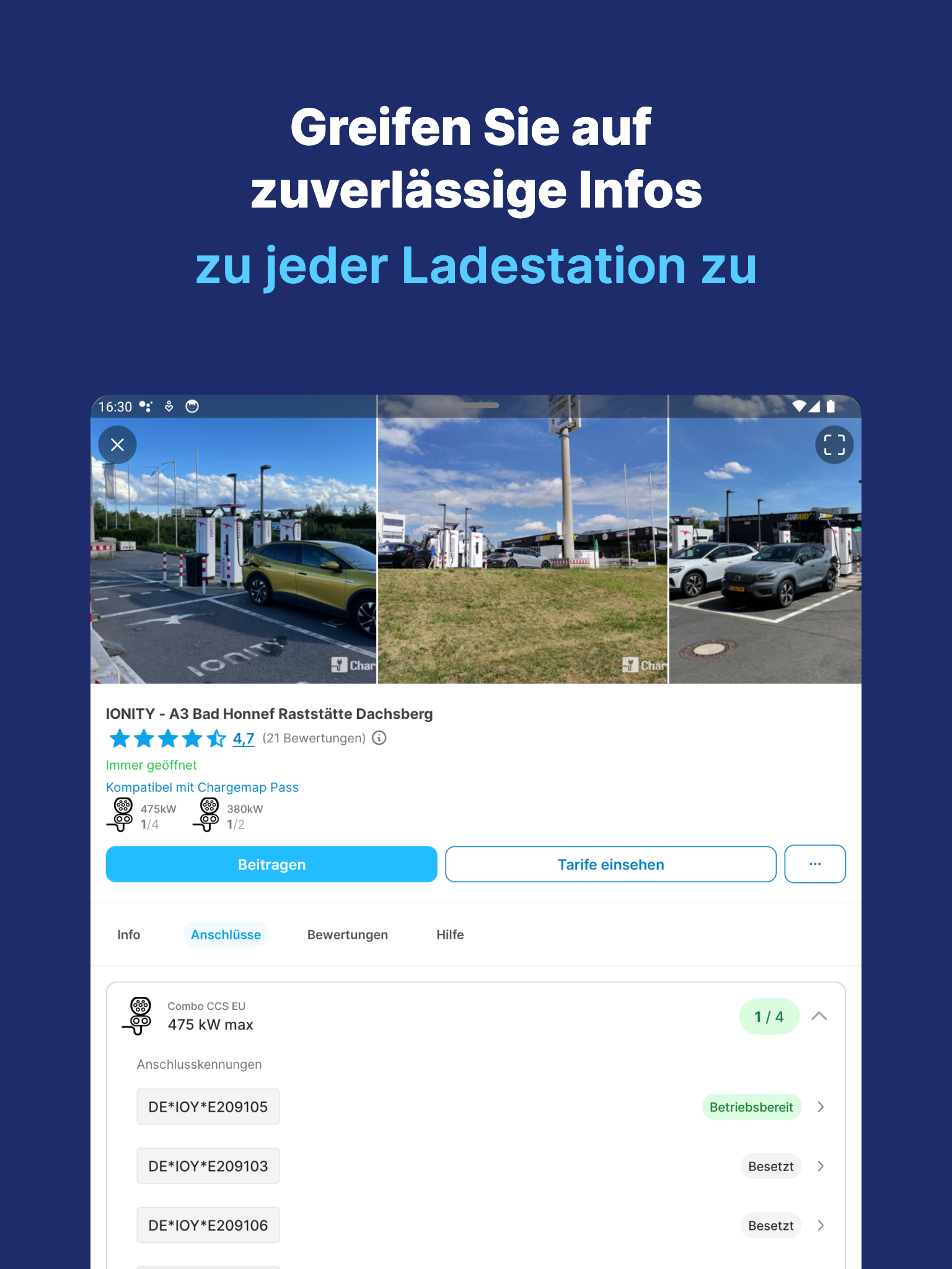 Zudem erhalten Sie alle wichtigen Informationen, um die richtige Ladestation zu finden: Steckertypen, Ladeleistung, Zugangsmöglichkeiten, Bewertungen und Kommentare der Community etc.