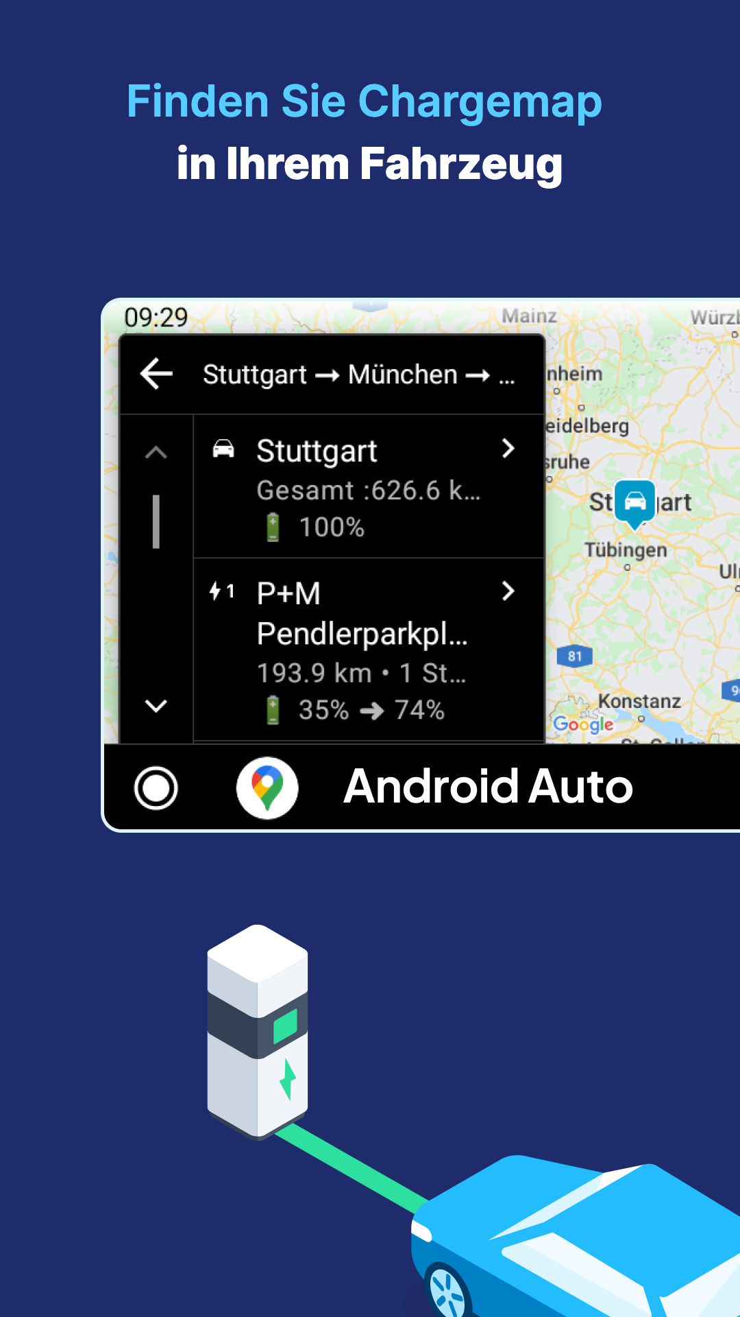 Nutzen Sie die Chargemap-Funktionen über das Dashboard Ihres E-Autos. Lassen Sie sich die Ladepunkte in der Umgebung anzeigen, finden Sie Ihre bevorzugten Ladestationen und gespeicherten Routen und navigieren Sie über Ihre bevorzugte GPS-App zur nächsten Ladestation.