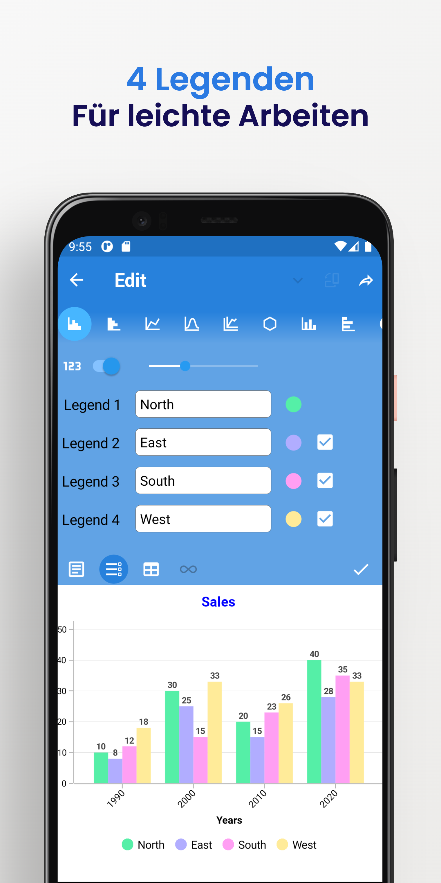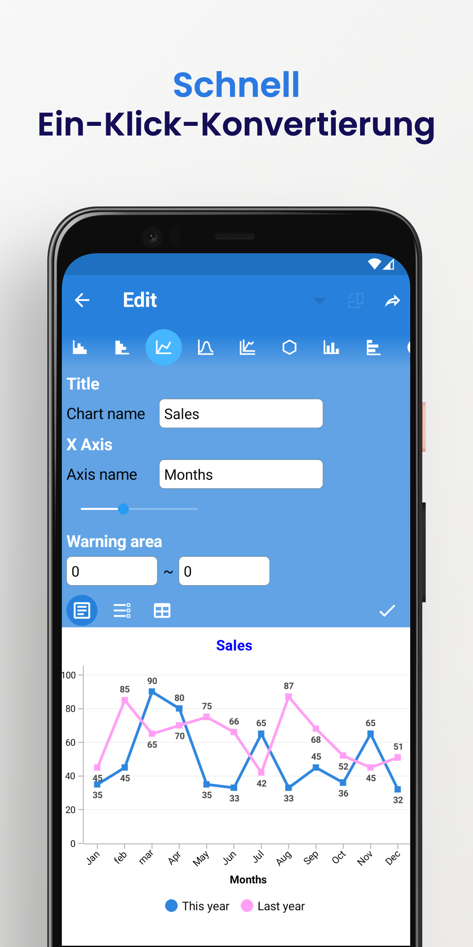 - Unterstützt mehrere Diagrammtypen Säulendiagramm, Liniendiagramm, Spline-Diagramm, Kreisdiagramm, Donut-Diagramm, Radardiagramm, Pyramidendiagramm. - Einfache und benutzerfreundliche Benutzeroberfläche Erstellen Sie jederzeit, überall, einfach und schnell Diagramme. - Unterstützt den Dunkelmodus Der Dunkelmodus reduziert die Belastung der Augen. - Exportieren Sie Diagrammbilder Exportieren Sie Diagrammbilder, um sie einfach an Freunde oder Kunden weiterzugeben. - Unterstützung für mehrere Sprachen Englisch, vereinfachtes Chinesisch, traditionelles Chinesisch, Japanisch, Koreanisch, Italienisch, Griechisch, Französisch, Deutsch, Thailändisch, Indonesisch, Vietnamesisch, Spanisch, Portugiesisch, Hindi, Russisch.