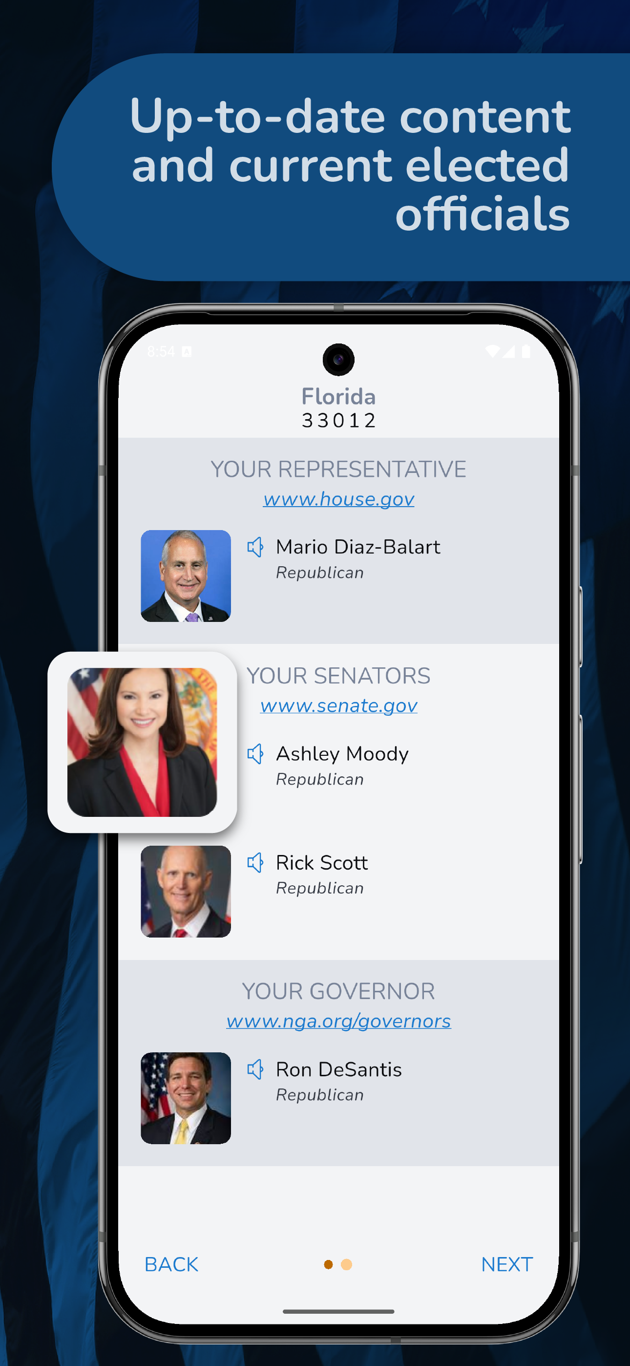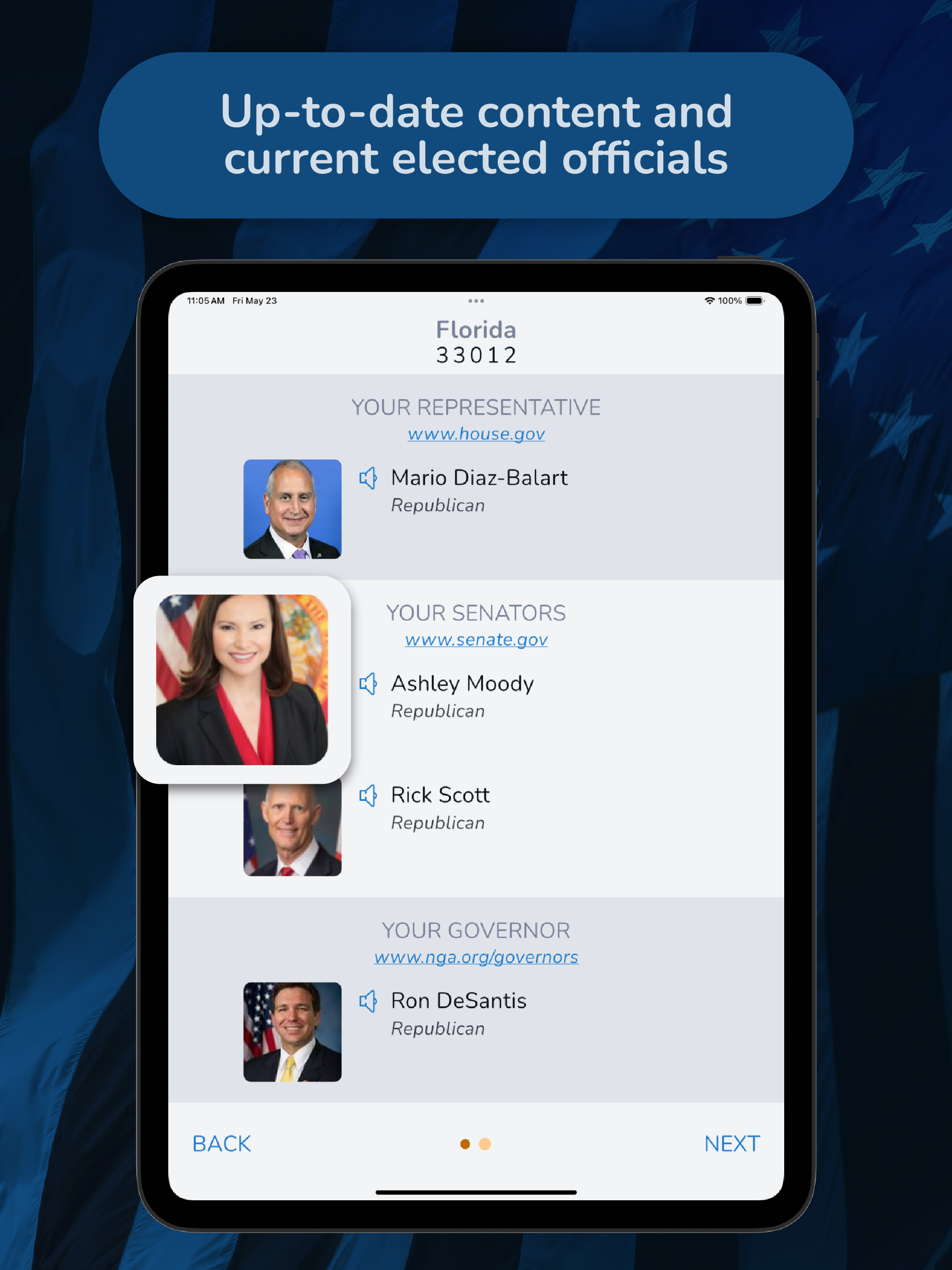 Erhalten Sie präzise und aktuelle Informationen für Ihre Region, einschließlich Ihres aktuellen Gouverneurs, Ihrer Senatoren und Abgeordneten.