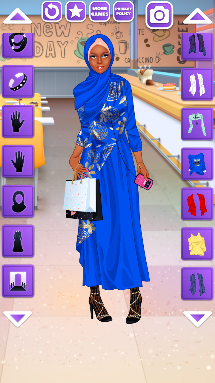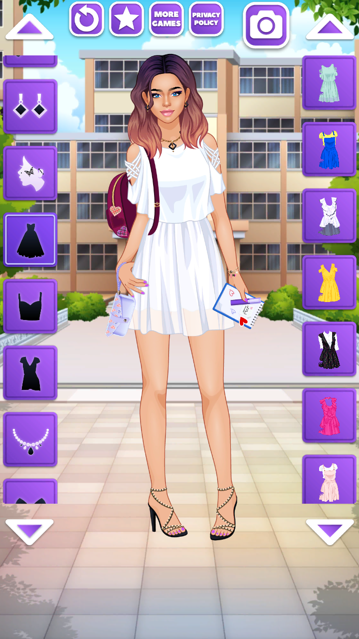Probieren Sie Ihre Fashionista-Fähigkeiten aus, indem Sie eine Studentin im Teenageralter stilisieren, die gerade die High School abgeschlossen hat und aufs College geht.Kleiden und machen sie im Schönheitssalon für junge Fashionistas.Entscheiden Sie sich für ihren Kleidungsstil: intelligent, sogar mit geeky Brille, oder vielleicht ein Party-Girl, oder ein lässiges Mädchen-neben-Tür, oder ein junges Modell von einem Magazin-Cover, oder eine edle Tochter eines Millionärs, oder etwas ganz anderes.Rummage durch ihre Garderobe von 200 Artikel, um das einzigartige Design zu schaffen, das es wert ist, einen Screenshot von und teilen Mit Ihren Freunden zu erstellen.Die App ist völlig kostenlos, keine In-App-Käufe oder Sperren, so dass nichts im Weg Ihrer Phantasie und Mode-Geschmack steht.Wählen Sie eine Frisur, ein Kleid oder ein Oberteil mit Jacke (plus Mantel), mit einem Rock, Einer Hose oder einer Kurzen.Wählen Sie aus verschiedenen Accessoires und Schmuck. Wählen Sie Gesichtszüge, Iris Farbe, sogar Tattoos ein Piercings.Holen Sie sich mehr Android-Apps für Mädchen und junge Frauen, die an virtual character styling interessiert sind, indem Sie die Schaltfläche "Mehr Spiele" in der Anwendung drücken.Überprüfen Sie unsere Shop-Seite regelmäßig, um keine neuen Verjüngungskuren zu verpassen.Wir hoffen, Sie genießen unsere Cosplay / Dressup Spiele