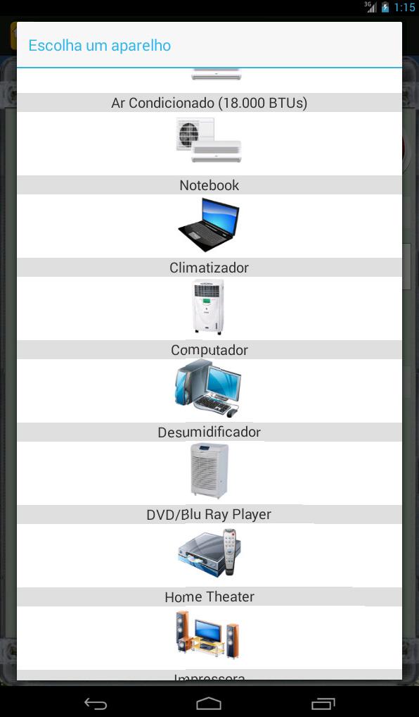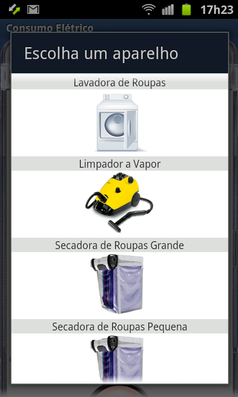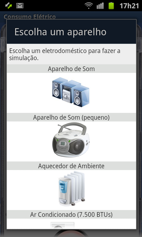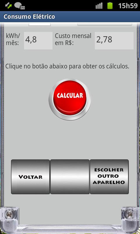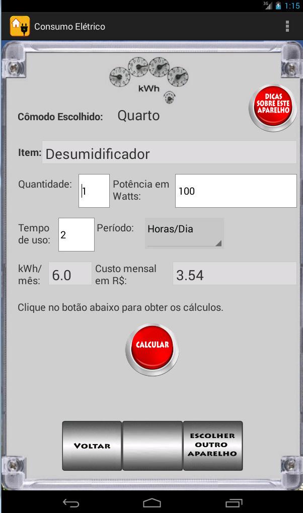 Consumo Elétrico - Free Com este App você saberá em poucos cliques quanto cada eletrodoméstico está gastando em sua casa, ou quanto pesará em sua conta de energia elétrica aquela nova televisão, máquina de lavar ou outro aparelho que deseja comprar. É simples. Escolha o eletrodoméstico desejado, clique em calcular e pronto. O programa traz para você qual o gasto mensal em reais do eletrodoméstico escolhido e ainda o seu consumo elétrico em kWh mês. Quer comprar uma televisão nova, um Home Theater, Secadora de Roupas outro eletrodoméstico e não sabe qual será o impacto na conta de energia? Fácil, basta ter instalado o app Consumo Elétrico e você fica sabendo na hora. Para um cálculo mais preciso, você ainda pode modificar a potência do eletrodoméstico ou aparelho elétrico caso esta seja diferente da sugerida pelo aplicativo. Não deixe de configurar também a tarifa local praticada pela companhia de energia de sua cidade, para um cálculo ainda mais preciso. Para fazer isto, basta localizar em sua conta de energia elétrica o valor da tarifa e configurá-lo no aplicativo Consumo Elétrico (Lembrando que a tarifa local é o valor do kWh mais impostos). Possibilidade de simular o consumo de energia elétrica nos períodos: Minutos/Dia, Horas/Dia, Horas/Semana, Horas/Mês. Além disso, o aplicativo traz diversas dicas de economia de energia e utilização, específicas para vários aparelhos eletrônicos e eletrodomésticos disponíveis em nossa casa. A produção de energia requer recursos naturais preciosos e na maioria das vezes gera impactos irreparáveis ao meio ambiente. Nestes tempos em que assuntos como aquecimento global, escassez de recursos naturais e aumento global na demanda por energia são assuntos tão comuns em nosso dia a dia, economizar energia e desenvolver o consumo consciente se torna uma necessidade primordial em nosso cotidiano. E o aplicativo Simulador de Consumo Elétrico te ajuda nesta tarefa. App construído para ser simples, leve e funcional, sem utilização de recursos além dos necessários para o software. Nos envie seus comentários com sugestões de novos eletrodomésticos, novos recursos, dúvidas ou críticas. Elas serão muito bem vindas. Não deixe de reportar erros ou bugs. --------------------- Versão Gratuita -------------------------- - Exibição de banners ou outras publicidades podem aparecer durante a execução do aplicativo. ------------------------------------------------------------------------ **-------- Adquirida a versão Consumo Elétrico Full deste aplicativo. Na versão Consumo Elétrico Full você não tem a exibição de banners de propaganda, publicidades ou qualquer pedido de autorização para utilização de recursos do celular além dos necessários ao aplicativo ----**