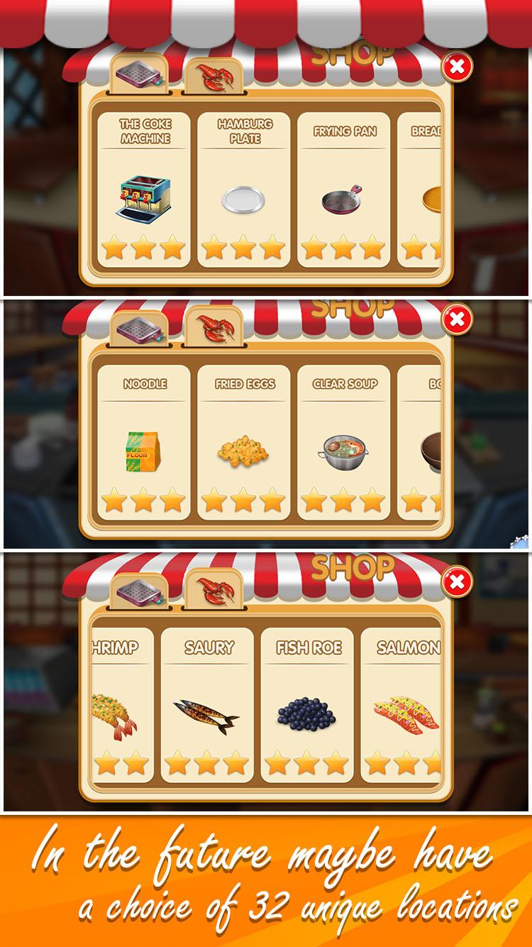 Koch köstliche Mahlzeiten und schöne Desserts aus der ganzen Asien in diesem kostenlosen süchtig Zeit-Management-Spiel! In Zukunft vielleicht eine Auswahl von 32 einzigartigen Orten haben, von Fast Food und Handgezogen Noodle Restaurant, können Sie Ihre Fähigkeiten in einer Vielzahl von Einstellungen und Kochtechniken zu üben. Verwenden Sie mehr als dreißig Materialien mehrere hundert edle Gerichte zu kochen. Versuchen Sie, alle möglichen Küchengeräte, von Cola-Hersteller und Barbecue Maschine Sushi-Rolle und Teekanne. Dekorieren Sie Ihre Restaurants mehr zu gewinnen clients.to Ihren Kunden die Erfahrung persönlicher und unvergesslich zu machen - so wie im wirklichen Leben! Rüsten Sie Ihre Küche und produzieren eine noch größere Vielfalt an Zartheit. Oh, und haben wir gesagt, dass dieses Spiel so süchtig ist und wie fesselnd! Viel Spaß beim Kochen und vergessen Sie nicht mit Ihren Freunden auf Facebook Ihre köstlichen Mahlzeiten zu teilen! Eigenschaften: * Mehr als 20 Delikatesse zu kochen unter Verwendung von 100 Material * In der Zukunft vielleicht eine Auswahl von 32 einzigartigen Orten haben: Fast-Lebensmittel, Bäckerei, Chinesisch, Pizza, Meeresfrüchte, Indisch, Frühstück Café, Sushi Bar, Eisdiele, Paradise Cocktail Bar, Corn Dog Van, Café Mexicana, House of Krabbe, FC Barcelona Sports Bar, Sunset Waffeln, Smokey Grill BBQ und so weiter. * Mehr als 80 Levels abzuschließen * Dutzende von Upgrades für Ihre Küchengeräte und Interieur