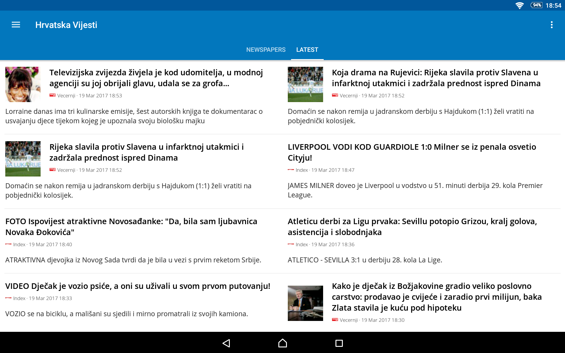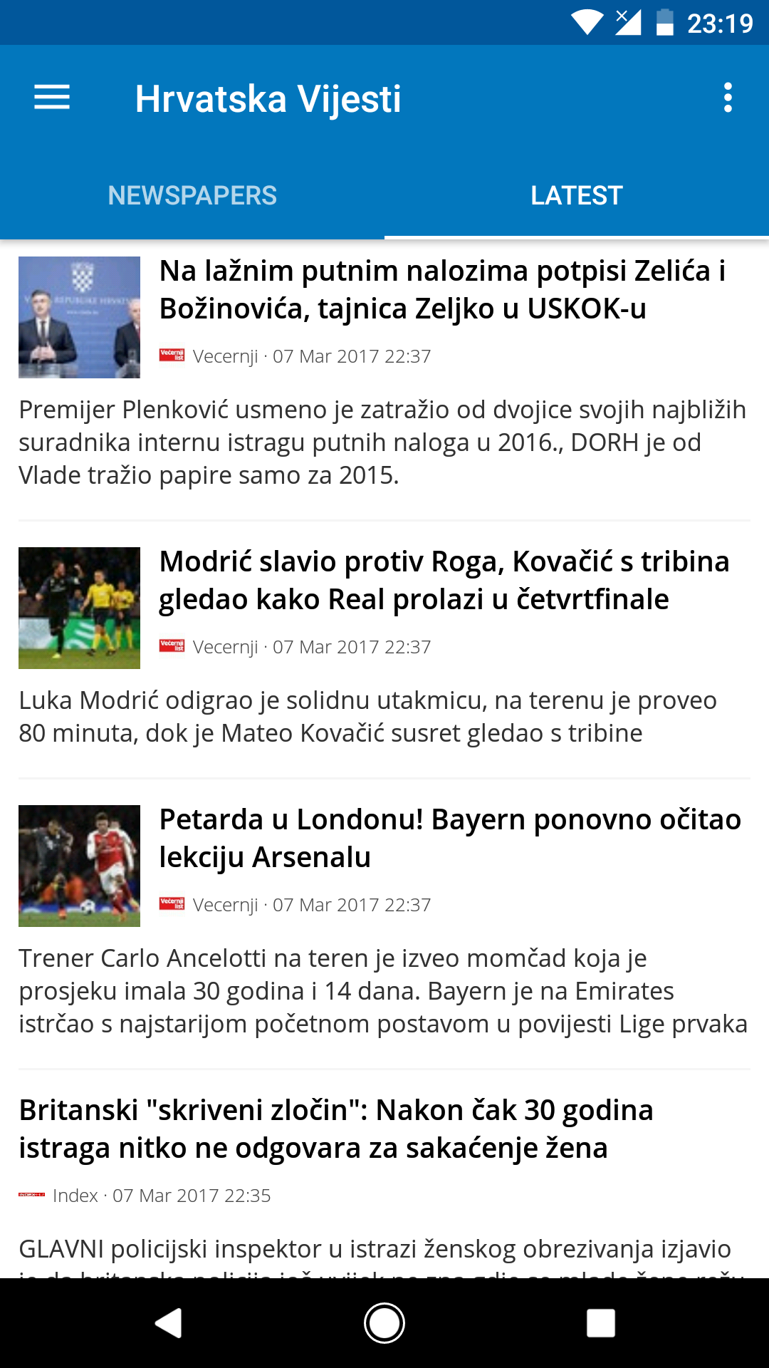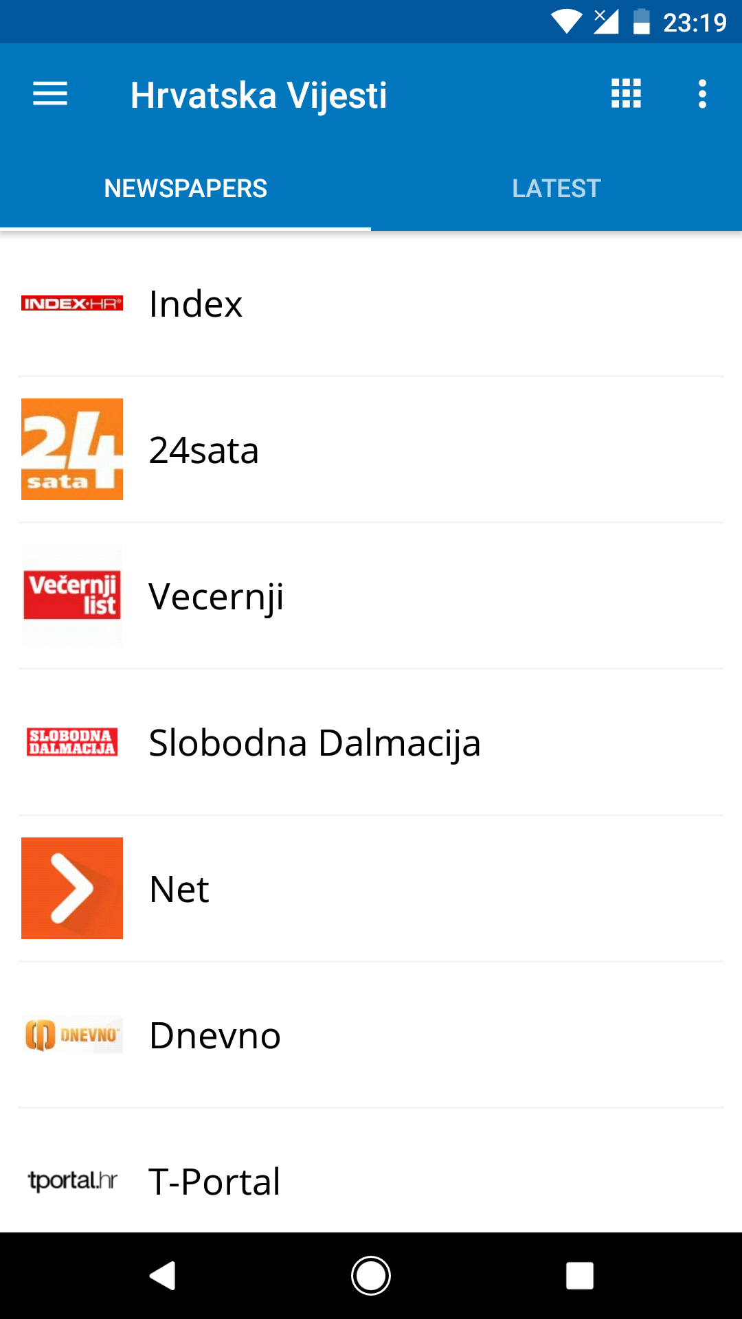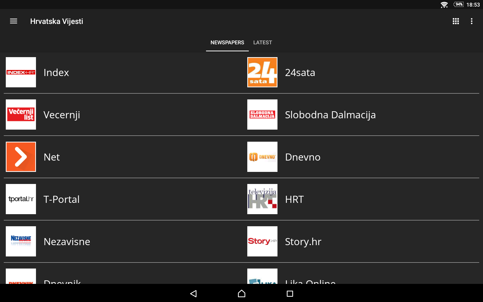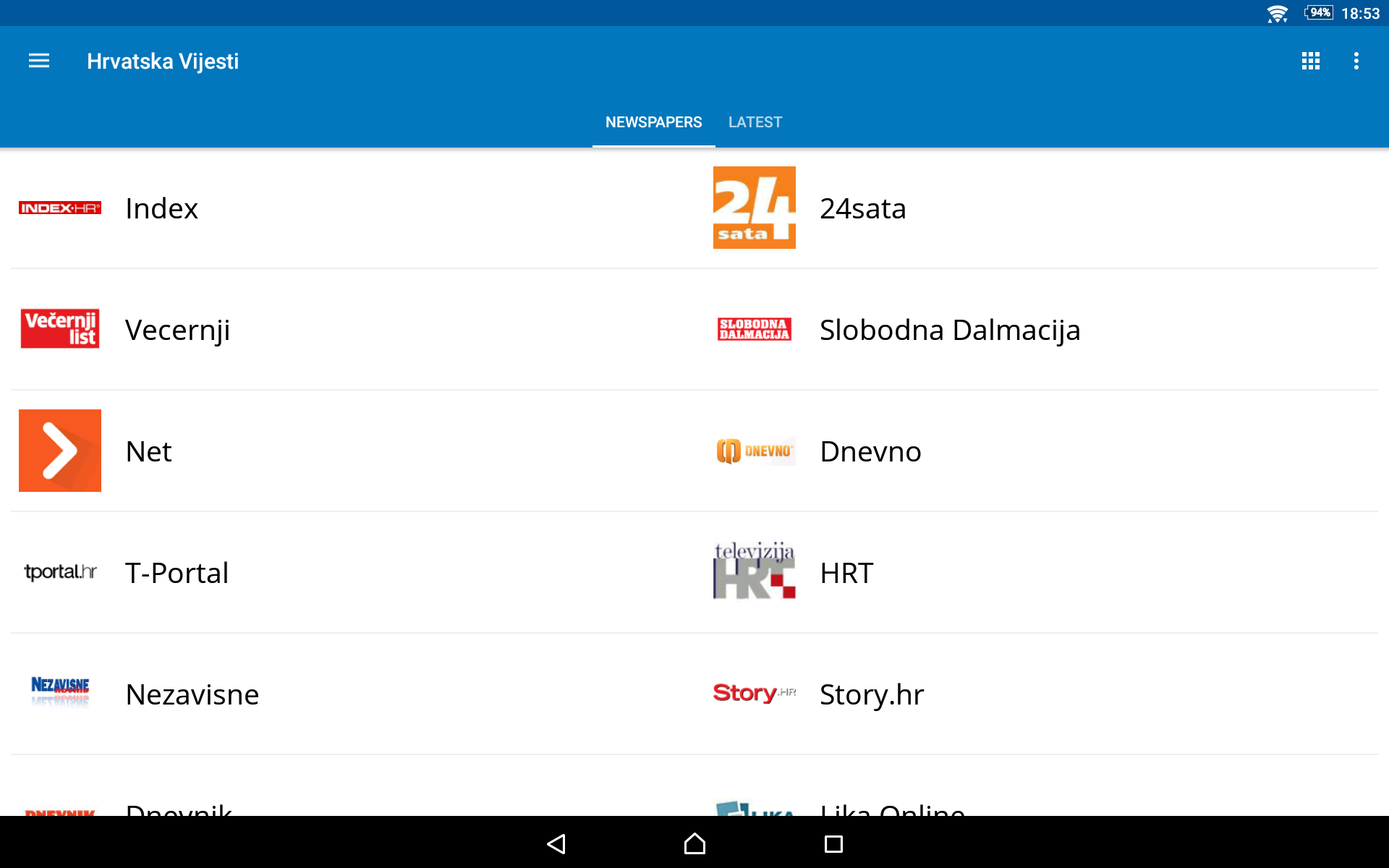 Hier sind die verfügbaren Zeitungen: 24sata, Jutarnji List, Index, Vecernji, Slobodna Dalmacija, Sportske Novosti, Net, Dnevno, T-Portal, NoviList, Direktno.hr, Nacional.hr, Dalmacija News, Dalmatinski Portal, HRT, Dnevnik, Story.hr, Glas Istre, N1, Zadarski list, Narod, Telegram, RTL Televizija, Nezavisne, Express, Glas Slavonije, 057info, Zagreb.inf, Sportnet, Glas Koncila, Bug Online, KAportal, Lika Online, Poslovni, Dubrovački Vjesnik, eMedjimurje, Sprdex, Dubrovački dnevnik, Portal Novosti, Narodni List, DuList, Dubrovniknet, Regional Express, ...