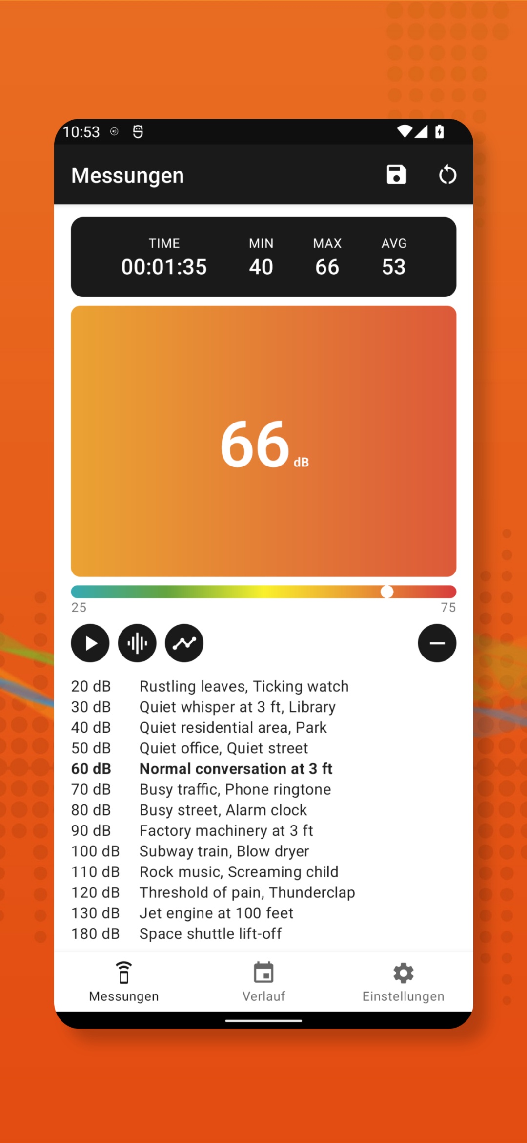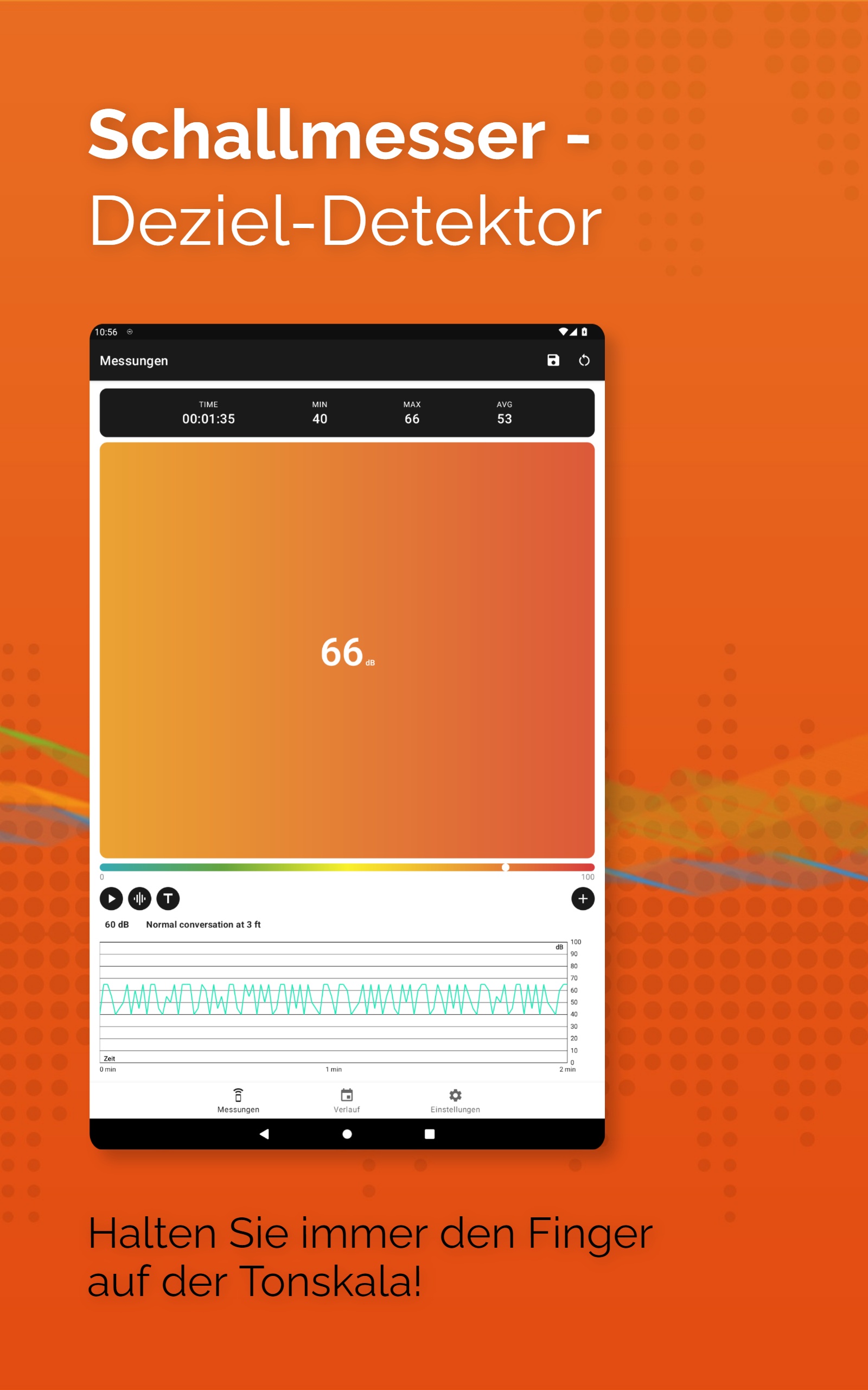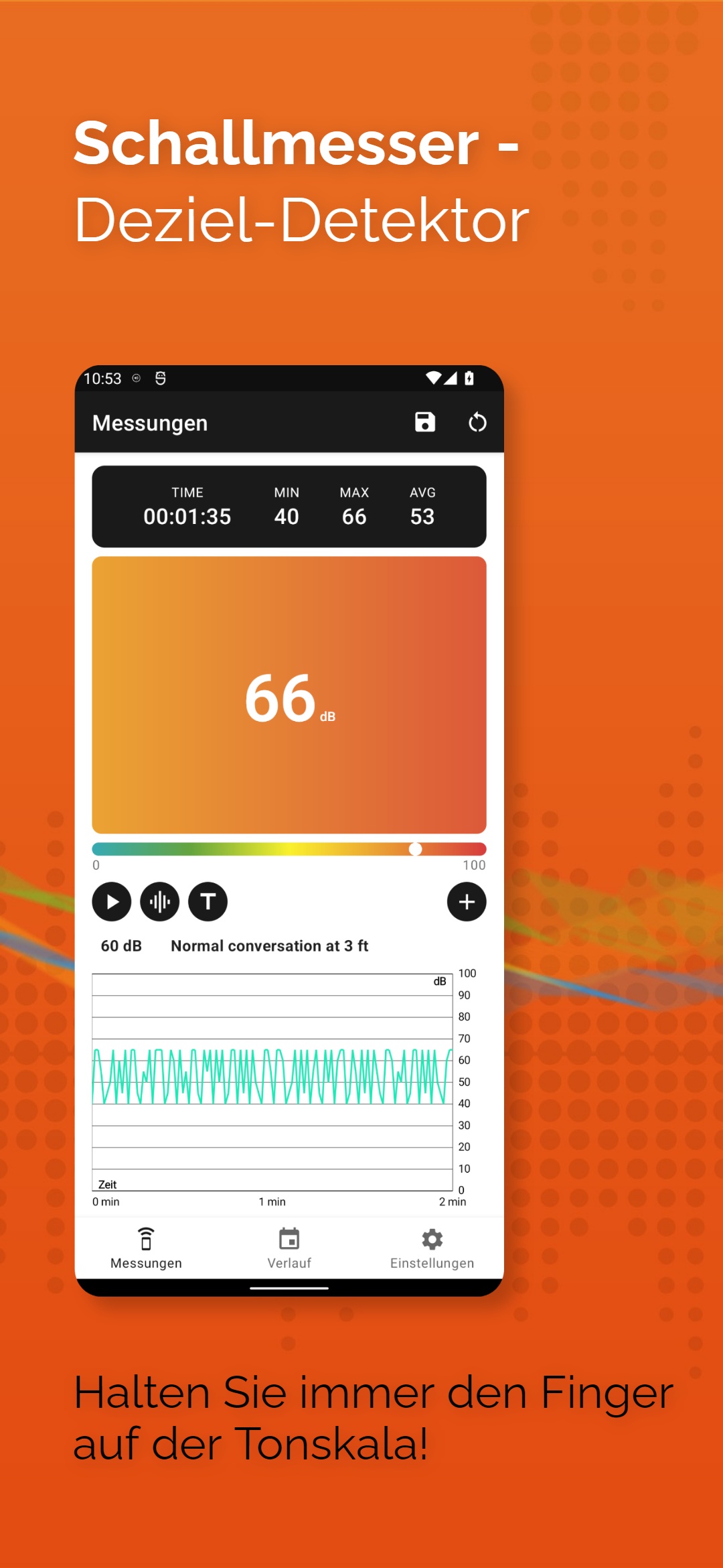 Verwandeln Sie Ihr Smartphone in ein Schallmessgerät. Unsere App nutzt das integrierte Mikrofon, um die aktuellen Dezibelwerte anzuzeigen, begleitet von einer leicht lesbaren Textbeschreibung. Starten und stoppen Sie eine Messung, um Durchschnitts-, Minimal- und Maximalwerte für einen bestimmten Zeitraum zu erhalten. 🎤 Präzise Schallmessung: Verwandeln Sie Ihr Smartphone in ein hochpräzises Schallmessgerät! Zeigt Dezibelwerte in Echtzeit mit klaren Textbeschreibungen an. 📊 Umfassende Datenanalyse: Erfassen Sie minimale, durchschnittliche und maximale Schallpegel. Ideal zur Analyse spezifischer Zeiträume und Umgebungen. ⌚ Nahtlose Uhr-Integration (Wear OS): Steuern Sie Messungen mühelos vom Handgelenk aus mit unserer Wear OS-App. Freihändig und störungsfrei! 🔧 Anpassbare Kalibrierung: Passen Sie die Dezibeleingabewerte manuell oder automatisch an Ihre Bedürfnisse an. Perfekt für personalisierte Schallmessungen. 🚀 Einfache Datenfreigabe: Teilen Sie Schallpegelmessungen sofort. Exportieren Sie als CSV-Datei oder teilen Sie ansprechende Screenshots mit Freunden oder Kollegen. 📅 Historische Datenerfassung: Sehen Sie sich Ihre Schallmessungen auf unserem intuitiven Verlaufsbildschirm erneut an. Zeigt alle Ihre vergangenen Daten mit detaillierten Statistiken an. ☁️ Cloud-Datensicherheit: Halten Sie Ihre Daten sicher und überall zugänglich mit unseren Cloud-Diensten. Melden Sie sich mit sozialen Medien oder E-Mail auf jedem Gerät an. 👀 Adaptive Anzeigeeinstellungen: Passen Sie die Anzeige für kurz- oder langfristige Überwachung an. Halten Sie den Bildschirm eingeschaltet, um Ihre Aufnahmen jederzeit im Blick zu behalten. ⌚ Exklusive Funktionen für Wear OS: 📱 Fernsteuerung der Messungen: Verwalten Sie die Schallmessungen Ihres Telefons direkt von Ihrer Wear OS-Uhr aus. Vereinfachen Sie Ihr Erlebnis! 👁️ Echtzeitüberwachung am Handgelenk: Überwachen Sie aktuelle Schallpegel bequem auf Ihrem Wear OS-Gerät. Bleiben Sie mühelos informiert! Mit der Kalibrierungsoption können Sie die Dezibeleingabewerte nach Bedarf anpassen. Außerdem können Sie die gesamte Ansicht als Screenshot speichern und mit Freunden teilen. Der Verlaufsbildschirm ermöglicht es Ihnen, Ihre gespeicherten Daten mit Datum, Uhrzeit, Durchschnitts- und Maximalwerten sowie der CSV-Datei des gesamten Messzeitraums anzuzeigen, die Sie ebenfalls teilen können. Schützen Sie Ihre Daten mit unseren Cloud-Diensten, mit denen Sie Konten erstellen und Ihre Daten speichern können. Melden Sie sich mit Ihren Social-Media-Konten oder Ihrer E-Mail-Adresse auf einem anderen Gerät an, um Ihre Daten einzusehen und zu teilen. In den Einstellungen können Sie die Diagrammlänge anpassen, je nachdem, ob Sie einen kurzen oder längeren Zeitraum betrachten möchten. Außerdem können Sie die Einstellungen so ändern, dass der Bildschirm eingeschaltet bleibt, um Ihre Aufnahmen jederzeit im Blick zu behalten. Unsere App bietet eine brandneue Anwendung für Wear OS-Geräte. Sie können Ihre Messungen bequem mit Ihrer Uhr steuern, ohne Ihr Telefon zu berühren. Die Steuerung der Messungen mit der Uhr vermeidet Interferenzen! Viel Spaß! Privacy policy: https://mysticmobileapps.com/legal/privacy/decibelmeter Terms and conditions: https://mysticmobileapps.com/legal/terms/decibelmeter