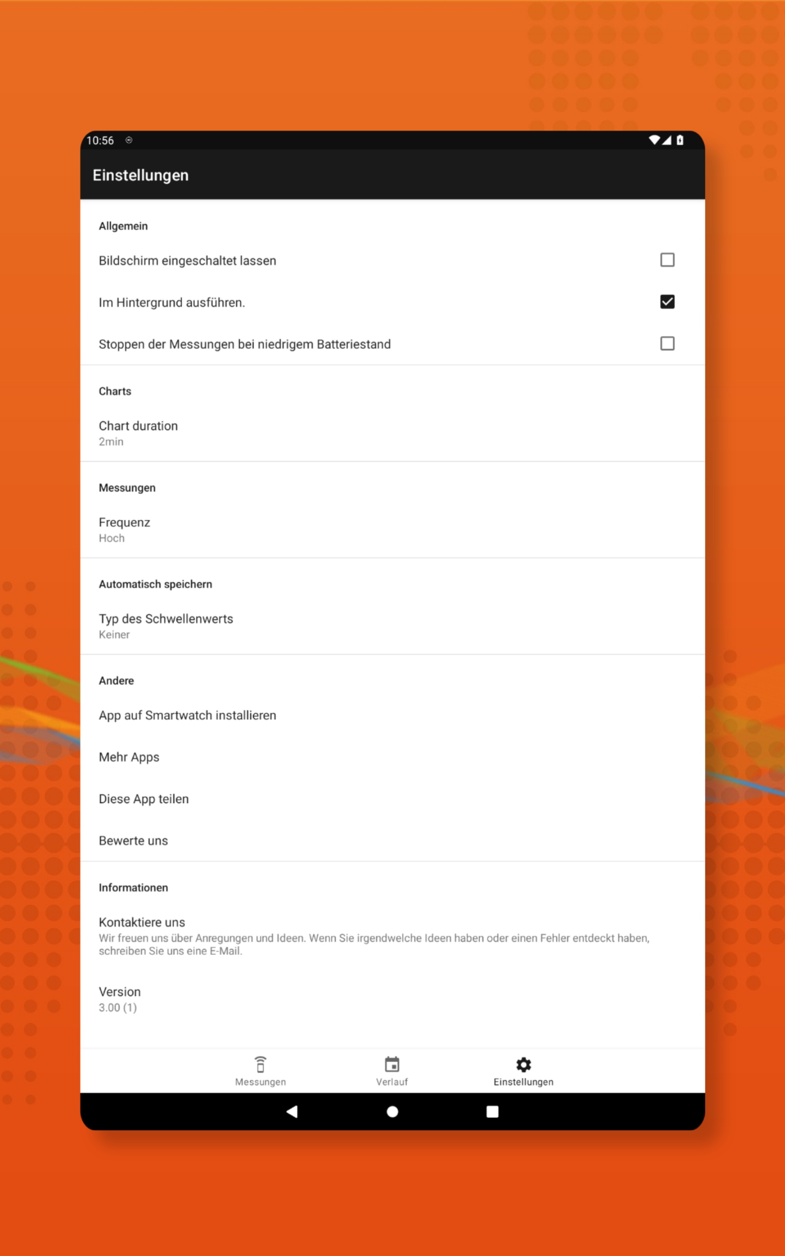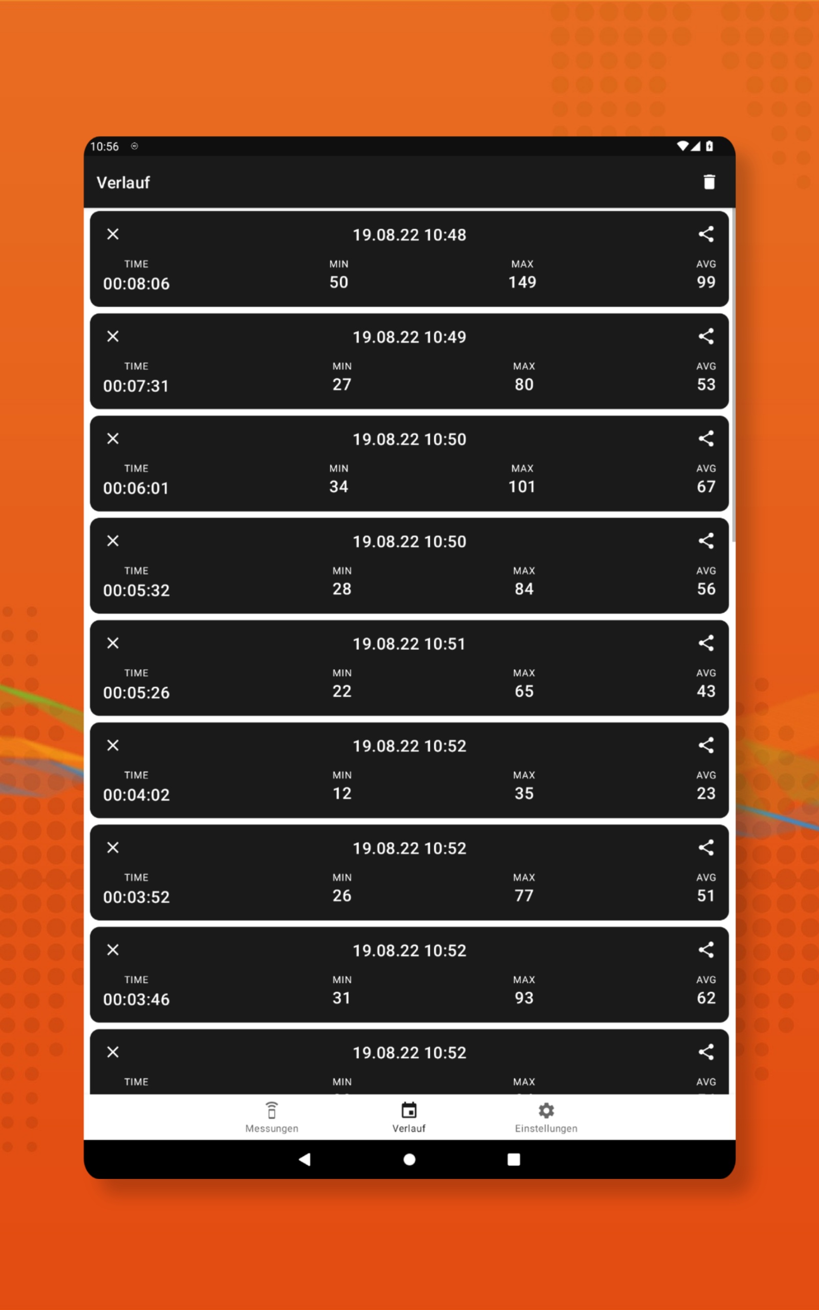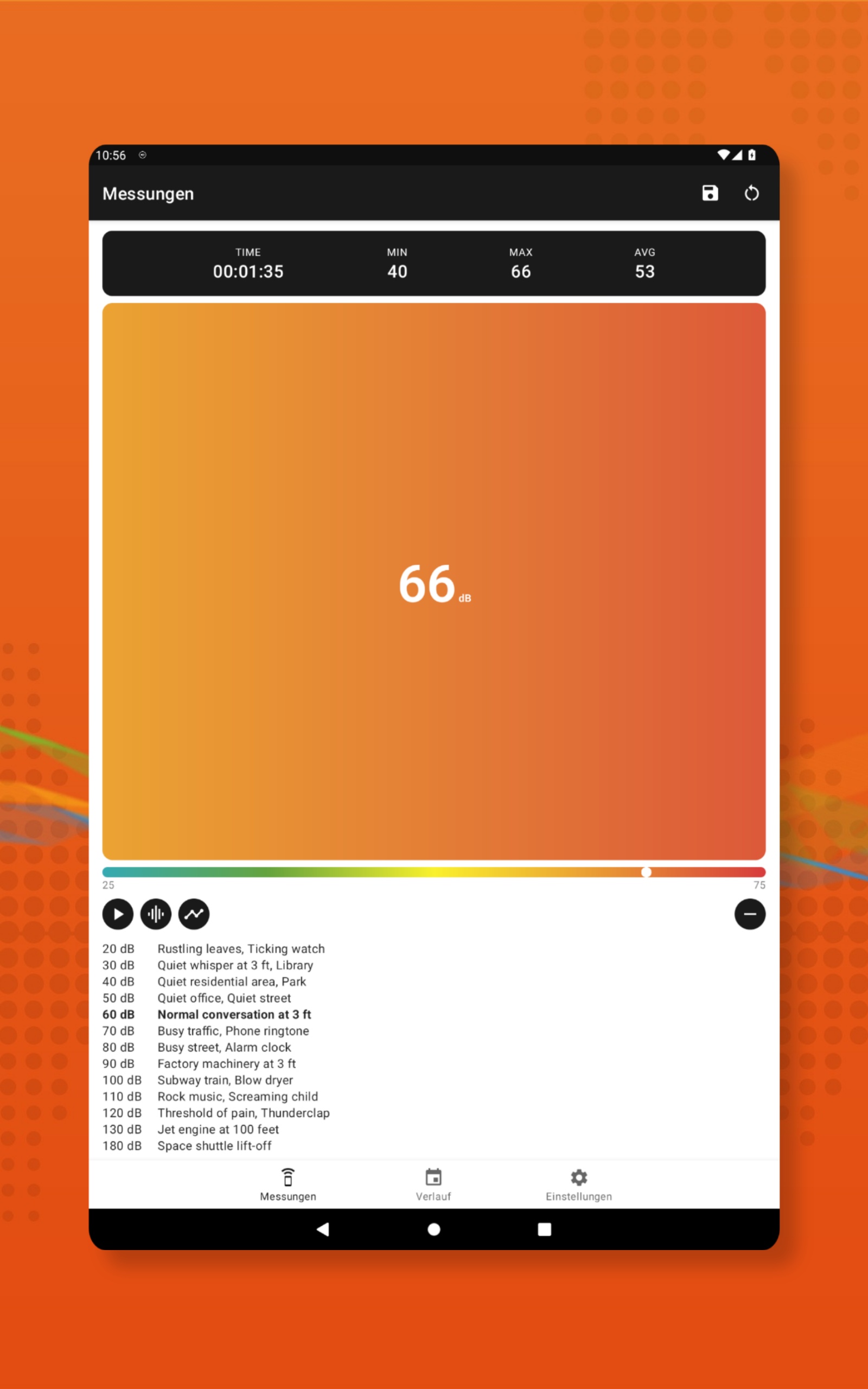 Verwandeln Sie Ihr Smartphone in ein Schallmessgerät. Unsere App nutzt das integrierte Mikrofon, um die aktuellen Dezibelwerte anzuzeigen, begleitet von einer leicht lesbaren Textbeschreibung. Starten und stoppen Sie eine Messung, um Durchschnitts-, Minimal- und Maximalwerte für einen bestimmten Zeitraum zu erhalten. 🎤 Präzise Schallmessung: Verwandeln Sie Ihr Smartphone in ein hochpräzises Schallmessgerät! Zeigt Dezibelwerte in Echtzeit mit klaren Textbeschreibungen an. 📊 Umfassende Datenanalyse: Erfassen Sie minimale, durchschnittliche und maximale Schallpegel. Ideal zur Analyse spezifischer Zeiträume und Umgebungen. ⌚ Nahtlose Uhr-Integration (Wear OS): Steuern Sie Messungen mühelos vom Handgelenk aus mit unserer Wear OS-App. Freihändig und störungsfrei! 🔧 Anpassbare Kalibrierung: Passen Sie die Dezibeleingabewerte manuell oder automatisch an Ihre Bedürfnisse an. Perfekt für personalisierte Schallmessungen. 🚀 Einfache Datenfreigabe: Teilen Sie Schallpegelmessungen sofort. Exportieren Sie als CSV-Datei oder teilen Sie ansprechende Screenshots mit Freunden oder Kollegen. 📅 Historische Datenerfassung: Sehen Sie sich Ihre Schallmessungen auf unserem intuitiven Verlaufsbildschirm erneut an. Zeigt alle Ihre vergangenen Daten mit detaillierten Statistiken an. ☁️ Cloud-Datensicherheit: Halten Sie Ihre Daten sicher und überall zugänglich mit unseren Cloud-Diensten. Melden Sie sich mit sozialen Medien oder E-Mail auf jedem Gerät an. 👀 Adaptive Anzeigeeinstellungen: Passen Sie die Anzeige für kurz- oder langfristige Überwachung an. Halten Sie den Bildschirm eingeschaltet, um Ihre Aufnahmen jederzeit im Blick zu behalten. ⌚ Exklusive Funktionen für Wear OS: 📱 Fernsteuerung der Messungen: Verwalten Sie die Schallmessungen Ihres Telefons direkt von Ihrer Wear OS-Uhr aus. Vereinfachen Sie Ihr Erlebnis! 👁️ Echtzeitüberwachung am Handgelenk: Überwachen Sie aktuelle Schallpegel bequem auf Ihrem Wear OS-Gerät. Bleiben Sie mühelos informiert! Mit der Kalibrierungsoption können Sie die Dezibeleingabewerte nach Bedarf anpassen. Außerdem können Sie die gesamte Ansicht als Screenshot speichern und mit Freunden teilen. Der Verlaufsbildschirm ermöglicht es Ihnen, Ihre gespeicherten Daten mit Datum, Uhrzeit, Durchschnitts- und Maximalwerten sowie der CSV-Datei des gesamten Messzeitraums anzuzeigen, die Sie ebenfalls teilen können. Schützen Sie Ihre Daten mit unseren Cloud-Diensten, mit denen Sie Konten erstellen und Ihre Daten speichern können. Melden Sie sich mit Ihren Social-Media-Konten oder Ihrer E-Mail-Adresse auf einem anderen Gerät an, um Ihre Daten einzusehen und zu teilen. In den Einstellungen können Sie die Diagrammlänge anpassen, je nachdem, ob Sie einen kurzen oder längeren Zeitraum betrachten möchten. Außerdem können Sie die Einstellungen so ändern, dass der Bildschirm eingeschaltet bleibt, um Ihre Aufnahmen jederzeit im Blick zu behalten. Unsere App bietet eine brandneue Anwendung für Wear OS-Geräte. Sie können Ihre Messungen bequem mit Ihrer Uhr steuern, ohne Ihr Telefon zu berühren. Die Steuerung der Messungen mit der Uhr vermeidet Interferenzen! Viel Spaß! Privacy policy: https://mysticmobileapps.com/legal/privacy/decibelmeter Terms and conditions: https://mysticmobileapps.com/legal/terms/decibelmeter