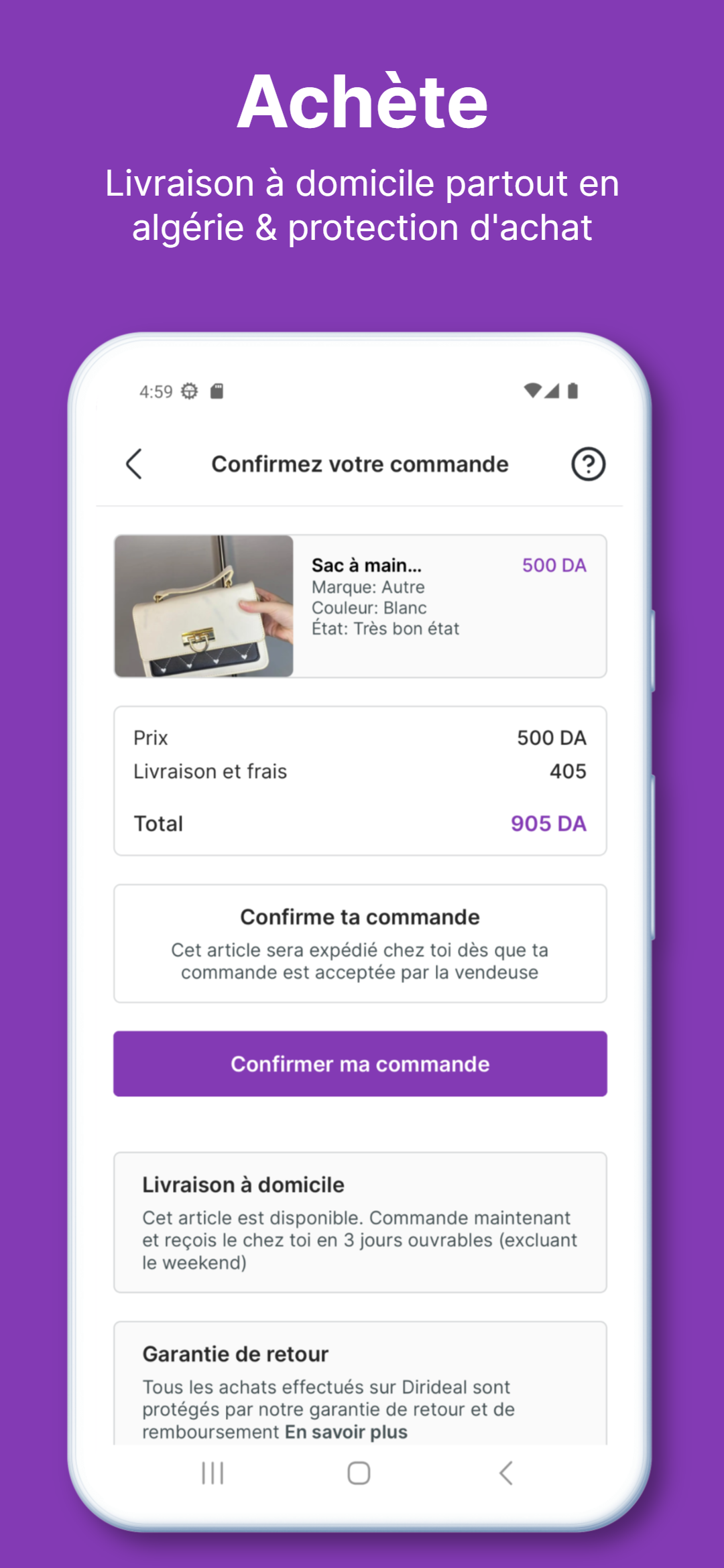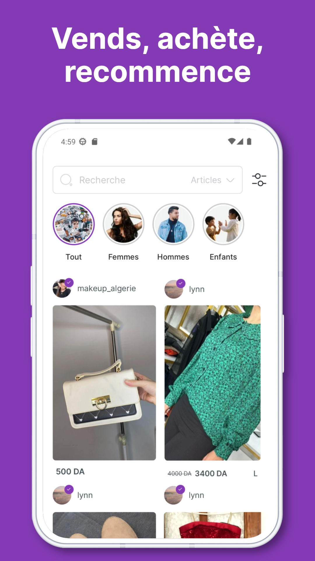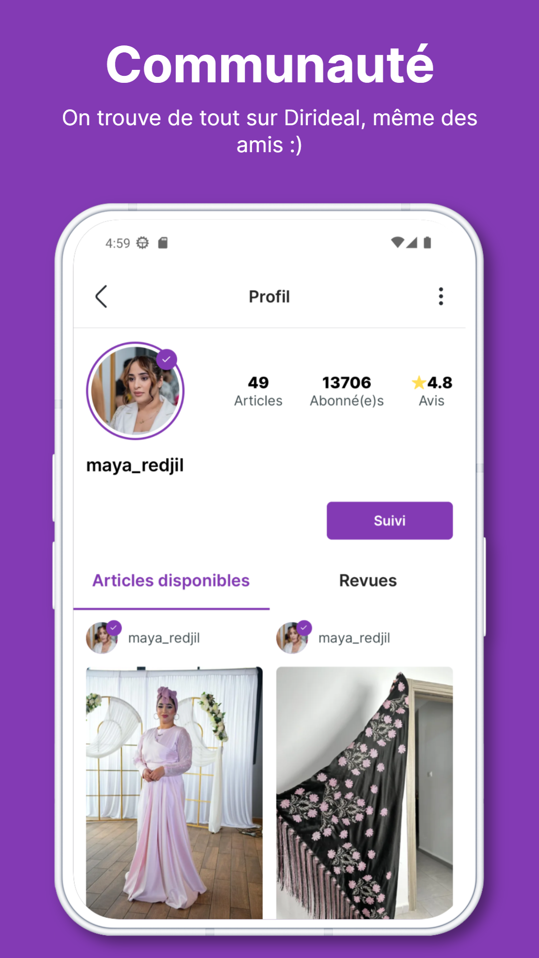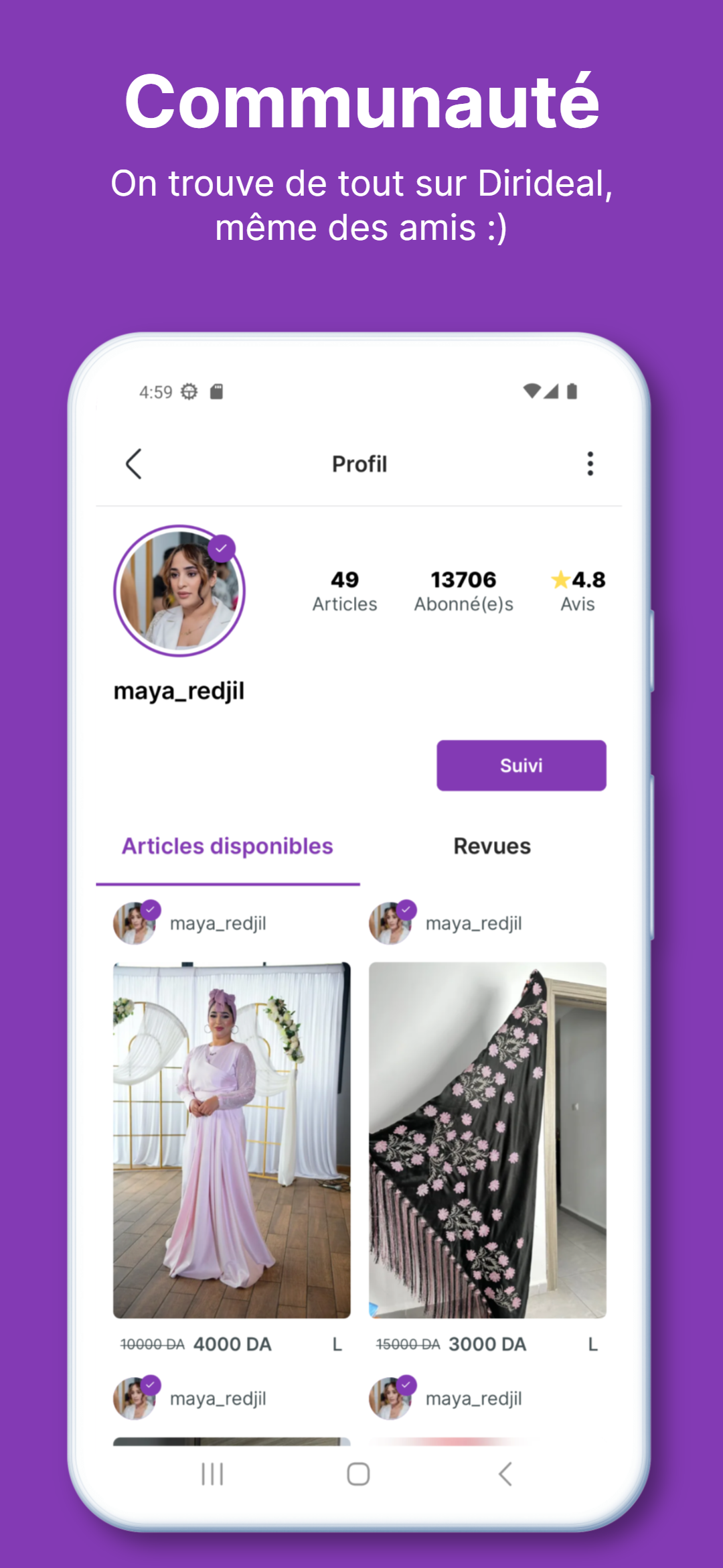 Verkaufen. Gekauft. Fang nochmal an. Wir sammeln, liefern und zahlen Ihr Geld direkt über die App auf Ihr Konto ein. Dirideal ist mehr als eine App zum Leeren von Schränken. Es ist eine Gemeinschaft von Modeliebhabern, die die Welt Stück für Stück verändern. Verkaufen Sie, was Sie nicht mehr tragen: Geben Sie dem, was Sie nicht mehr tragen, ein zweites Leben und machen Sie jemandem in der Gemeinschaft eine Freude. Sie müssen nicht einmal reisen, um zu verkaufen. Wir holen und liefern überall in Algerien und bezahlen Sie schnell direkt über die App. Kaufen Sie sicher: Finden Sie Ihr Angebot und erhalten Sie Ihr Paket zu Hause, überall in Algerien (58 Wilayas). Bezahlen Sie per Nachnahme und profitieren Sie von unserer Geld-zurück-Garantie bei Problemen mit Ihrer Bestellung. Fangen Sie noch einmal von vorne an: Wechseln Sie Ihre Kleidung, verdienen Sie Geld und aktualisieren Sie Ihre Garderobe, ohne Ihr Budget zu sprengen. Indem Sie Dirideal beitreten, werden Sie einer Gemeinschaft beitreten, die die Zukunft der Mode in Algerien Stück für Stück verändert, für eine Kreislaufwirtschaft, die gut für den Geldbeutel und den Planeten ist. Eine engagierte Gemeinschaft: Was uns zum Marktplatz Nummer 1 in Algerien macht, ist eine Gemeinschaft engagierter Öko-Modeliebhaber, die uns jeden Tag dazu drängen, unsere Grenzen zu überschreiten, für umweltfreundlichere, nachhaltigere und ethischere Mode. Wie verkauft man? Fügen Sie Ihren Artikel mit nur wenigen Klicks über die App hinzu: Laden Sie die App herunter, machen Sie schöne Fotos, fügen Sie die Details Ihres Artikels hinzu, legen Sie einen attraktiven Preis fest und fertig. Machen Sie Verkäufe, wir liefern: Machen Sie Verkäufe, bereiten Sie Ihr Paket vor, wir holen Ihren Artikel bei Ihnen zu Hause ab und liefern ihn an die Türen Ihrer Kunden, überall in Algerien. Erhalten Sie Ihr Geld schnell, direkt über die App: Sobald die Lieferung bestätigt ist, wird Ihr Geld in Ihrem Dirideal-Wallet hinterlegt. Sie können es mit wenigen Klicks auf ein Bank- oder CCP-Konto überweisen. Worauf warten Sie noch, um sich der Bewegung anzuschließen? Laden Sie die App herunter und schließen Sie sich jetzt Ihren Freunden an!