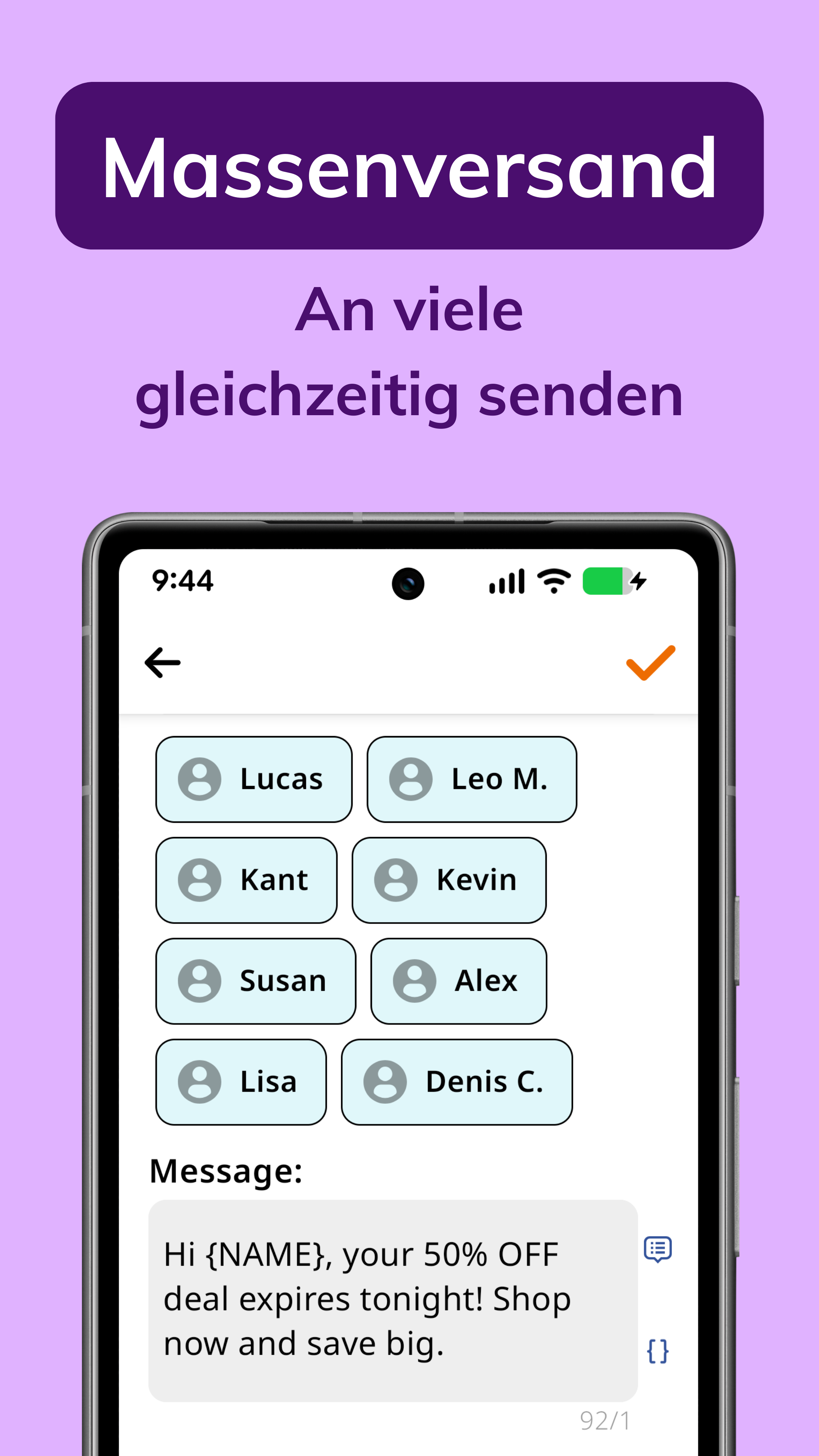 - Intelligente Personalisierung: Fügen Sie Kontaktnamen mit Platzhaltern wie {NAME}, {VORNAME} oder {NACHNAME} ein.