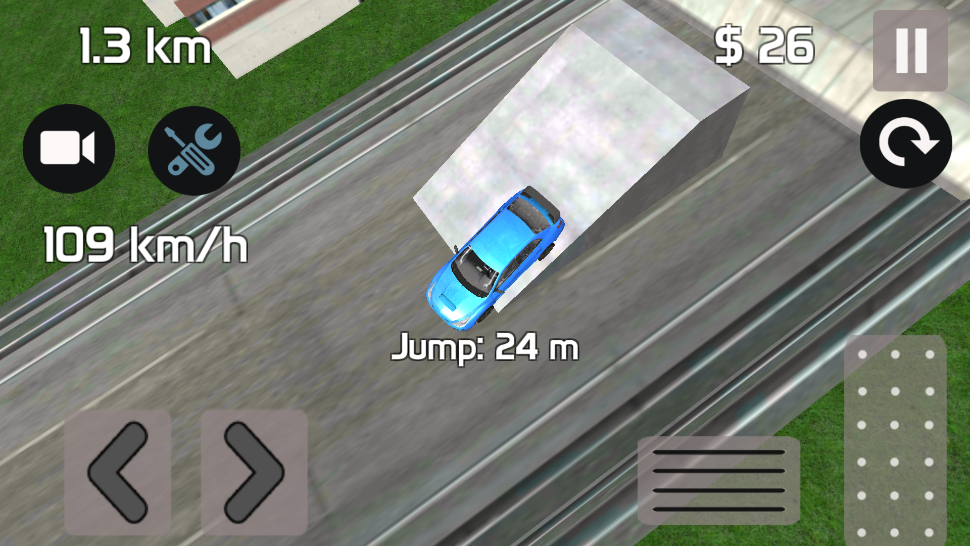 Overhead camera view so you can see watch your jumps and crashes. Easy controls. Exceptional car driving physics. Realistic crashes, with realistic damage.