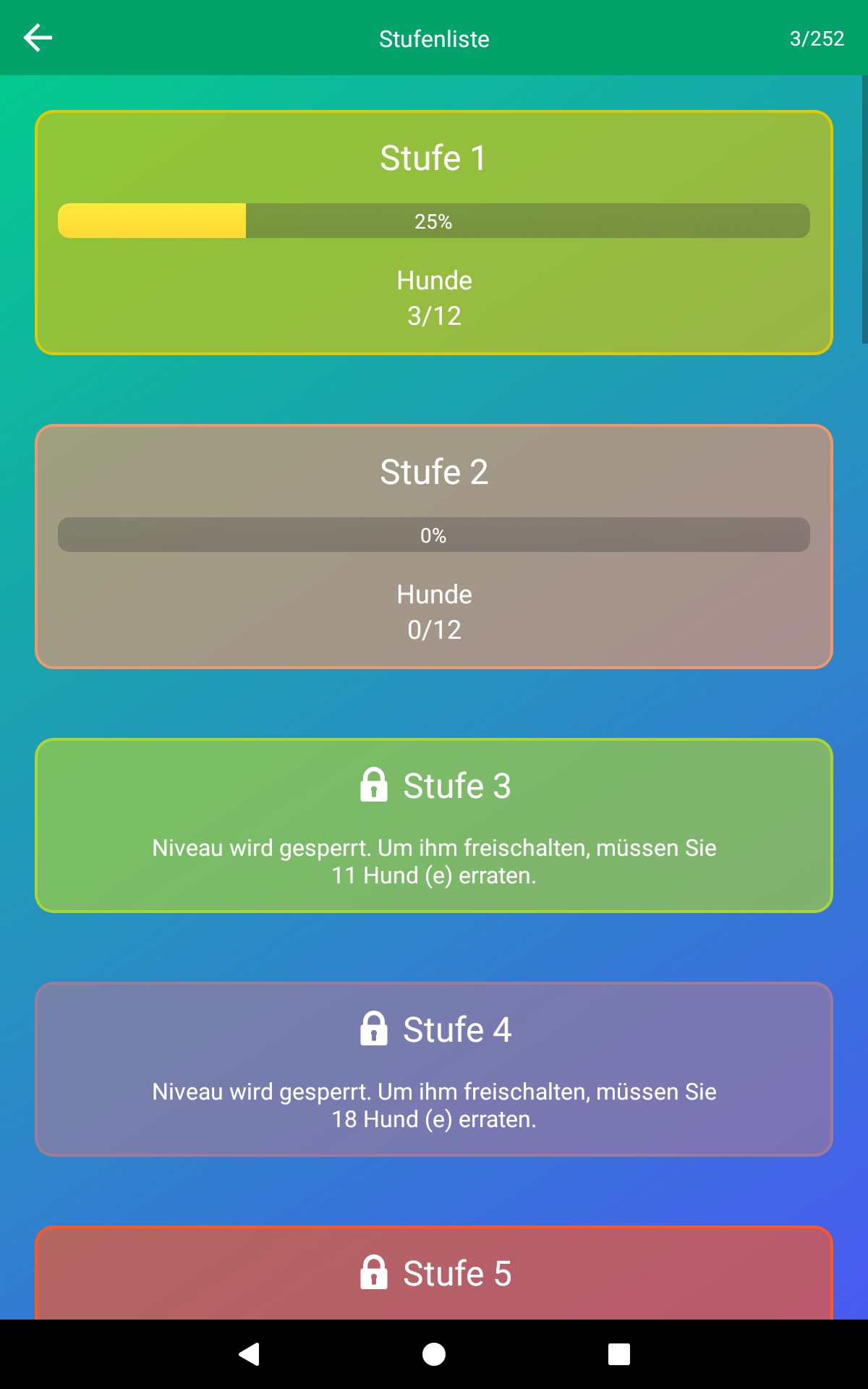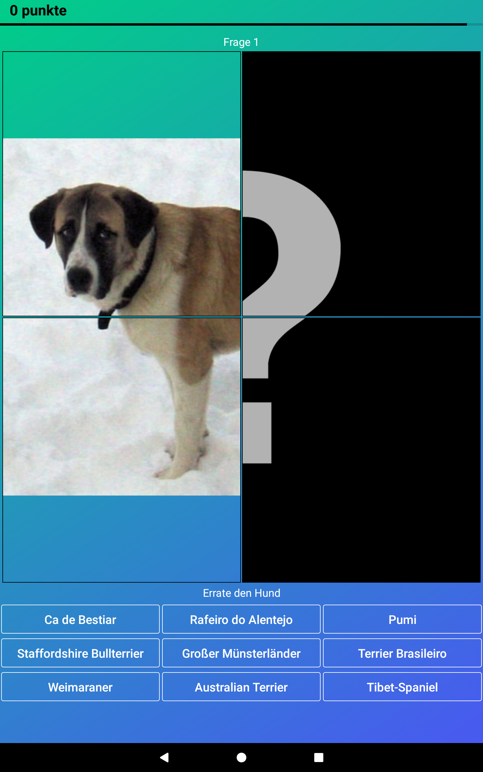 Mögen Sie Hunde? Glaubst du, du weißt alles über sie? Fordern Sie sich selbst heraus und erraten Sie alle berühmten Hunderassen in dieser Anwendung! Das Spiel hat mehr als 20 Levels und mehr als 250 Fragen. Wissen Sie, wie der Yorkshire Terrier aussieht? Können Sie den Border Collie auf dem Foto erraten? Kannst du den Unterschied zwischen Siberian Husky und Akita erkennen? Kennen Sie den Unterschied zwischen dem Airedale Terrier und dem Welsh Terrier? Sie sind sehr ähnlich! Dieses Quiz wird Ihnen helfen, diese Details zu verstehen, Ihr Wissen über verschiedene Hunde zu erweitern und viel zu lernen! 🐶 SPIELMODI 🐶 Das Quiz hat einen Hauptmodus und 3 zusätzliche. Sie werden immer finden, was zu tun ist. ★ DER HAUPTMODUS. Hier musst du mehr als 20 Level durchgehen und auf dem Foto alle Hunderassen erraten, die im Spiel vertreten sind. Von den bekanntesten zu den selteneren. Sie müssen die Rasse des Hundes durch Buchstaben schätzen, wenn es schwierig ist, dann können Sie Hinweise nehmen. Fordere dich selbst heraus und schließe das Spiel zu 100% ab! ☆ DER MODUS «Arcade». Dies ist ein zusätzlicher Modus. Darin müssen Sie die Rasse des Hundes erraten und so wenige Teile des Bildes wie möglich öffnen. Je weniger Teile Sie öffnen, desto mehr Punkte erhalten Sie! ☆ DER MODUS «Rate den Hund». Dies ist auch ein zusätzlicher Spielmodus. Hier müssen Sie so viele Hunde wie möglich in einer Minute von den Fotos erraten und die geringste Anzahl von Fehlern machen. ☆ DER MODUS «Richtig oder falsch». Der letzte zusätzliche Modus. Darin müssen Sie das Bild mit dem Namen der Rasse vergleichen und mit wahr oder falsch antworten. Sie können sich auch in zusätzlichen Spielmodi mit anderen Spielern messen. Sammle in jedem Modus so viele Punkte wie möglich und nimm die erste Position ein! Wenn Sie nur Hunderassen studieren und nicht mit anderen konkurrieren möchten, wählen Sie den "Free Mode" und spielen Sie ohne Eile und zu Ihrem Vergnügen! 🐶 ANWENDUNGSMERKMALE 🐶 ☆ Die Anwendung hat eine große Anzahl von Hunderassen mit Fotos. ☆ Viele Levels und Spielmodi. ☆ Tägliche Boni für den Eintritt ins Spiel und das Abschließen neuer Levels. ☆ Es gibt Statistiken für jedes Level und das Spiel als Ganzes. Vervollständige alles zu 100% und werde ein echter Experte für Hunde! ☆ Es gibt nützliche Hinweise, die Ihnen in schwierigen Situationen helfen. ☆ Möchten Sie mehr über die Hunderasse erfahren? Klicken Sie einfach auf die Schaltfläche unter dem Foto und Sie sehen die eingebaute Wikipedia, in der Sie Antworten auf alle Ihre Fragen finden. ☆ Wettbewerbsfähige Spielmodi! Gewinne und sei der Erste in der Rangliste! ☆ Möchten Sie das Foto besser betrachten? Einfach drauf klicken! ☆ Einfache und intuitive Benutzeroberfläche. ☆ Sie können das Spiel sowohl auf dem Telefon als auch auf dem Tablet spielen. ☆ Zum Spielen benötigen Sie kein Internet. Es ist möglicherweise nur erforderlich, um auf Wikipedia zuzugreifen und die Bilder zu vergrößern. ☆ Die Anwendung wurde in 13 Sprachen übersetzt! Sie können die Sprache der Fragen in den Einstellungen ändern. Lernen Sie mit dieser Anwendung neue Hunderassen und wiederholen Sie spielerisch das Wissen! 🐶 Background psd created by rawpixel.com - www.freepik.com Dog vector created by rawpixel.com - www.freepik.com
