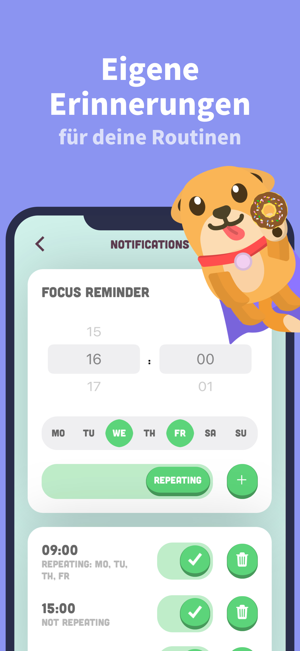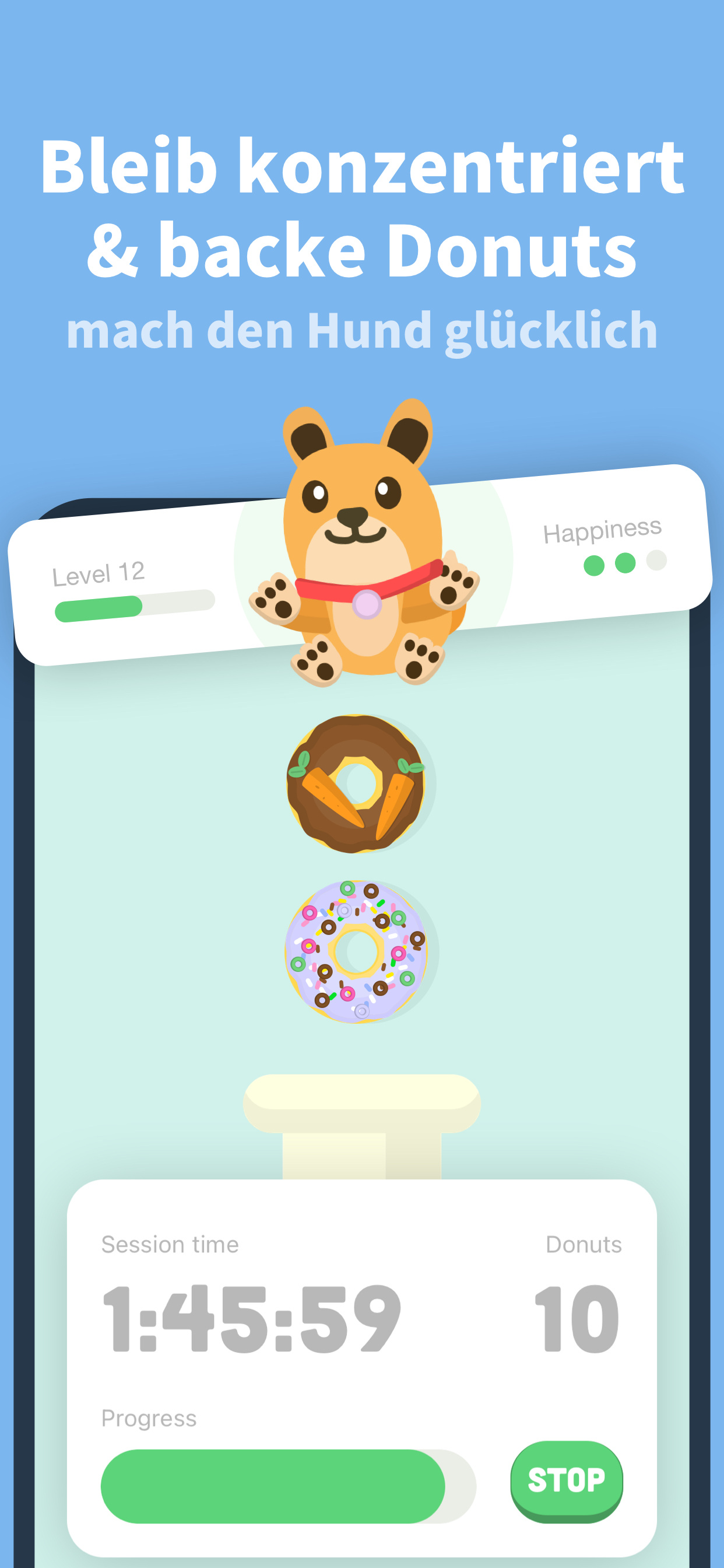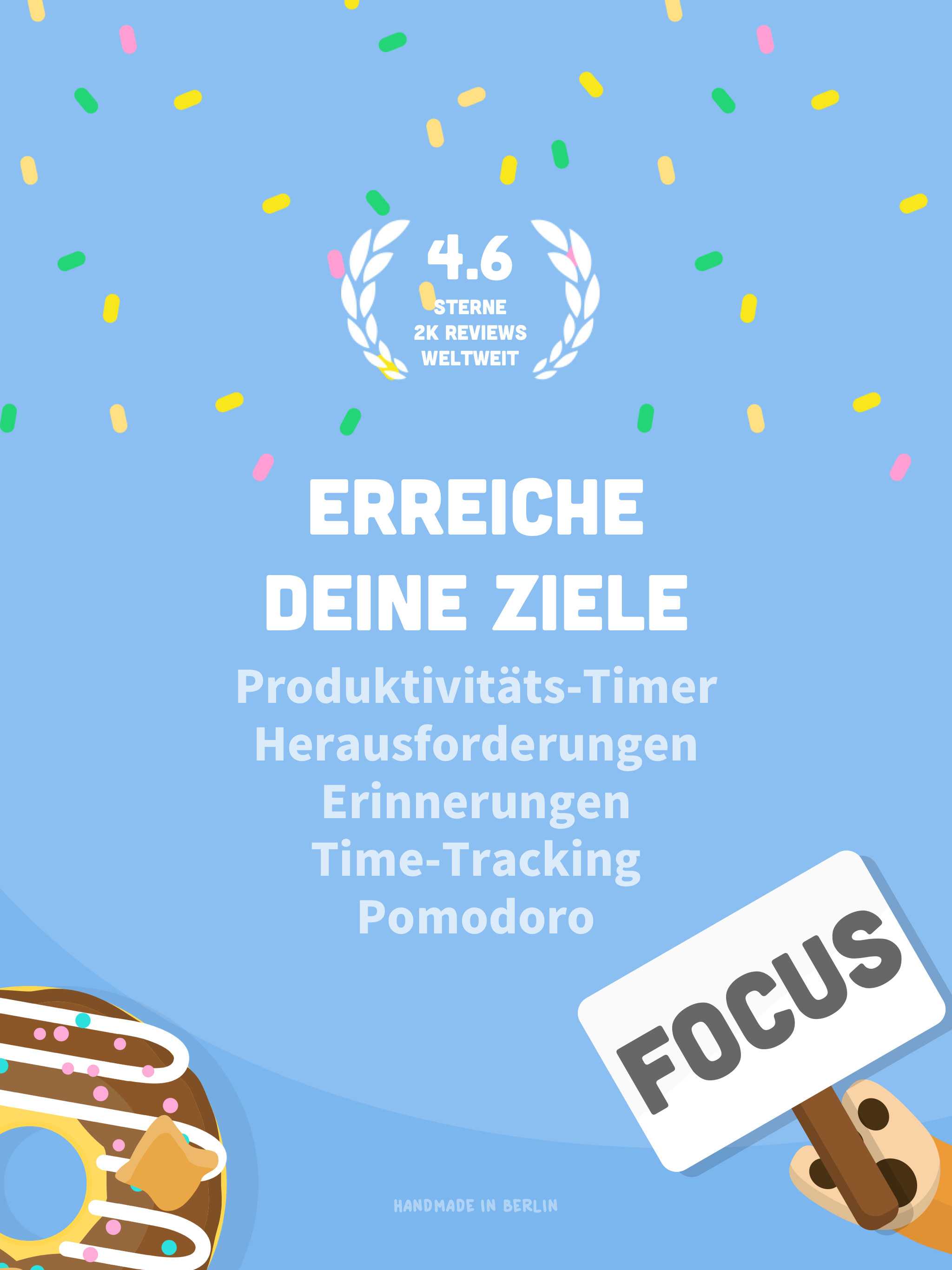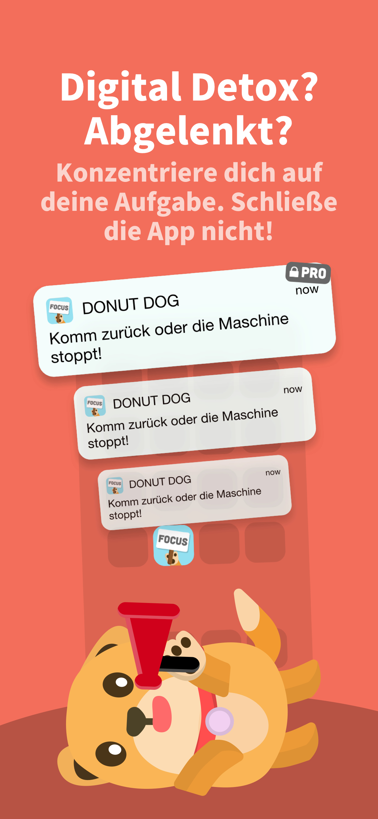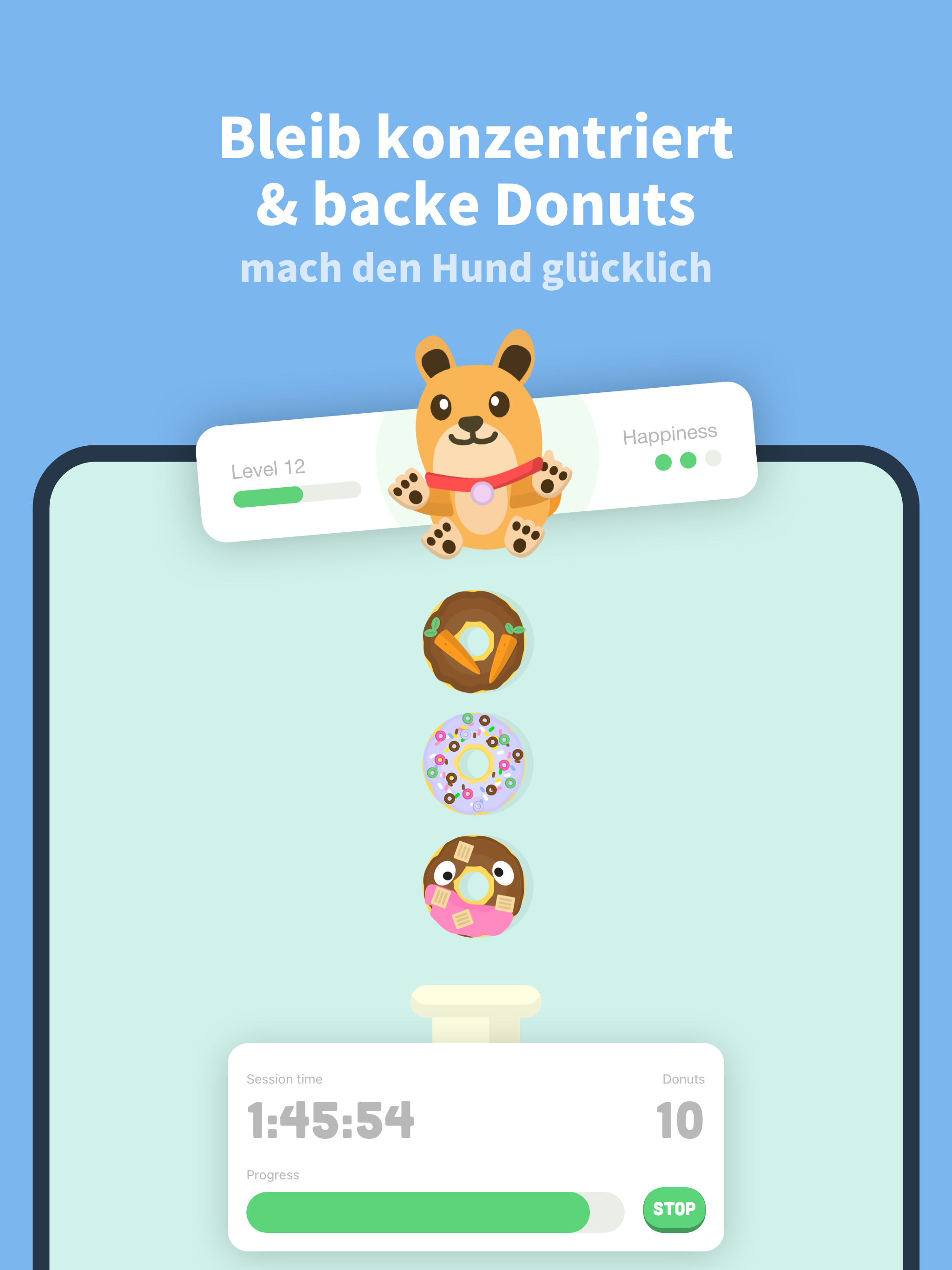 1) Starten eine Fokus-Herausforderung mit unserer spielerischen Produktivitäts-App und verdiene Belohnungen wie Donuts, Edelsteine und Münzen. 2) Mache eine verantwortungsvolle Telefonnutzung zur Gewohnheit, indem du deinen virtuellen Hund namens Focus mit Donuts fütterst. Verdiene Münzen und XP für jede Fütterung. 3) Verfolgen deine Zeit und Fortschritt mit schönen Statistiken, um beim Zeitmanagement zu helfen und die Bildschirmzeit zu reduzieren. 4) Schalte neue Donut-Rezepte, Donut-Maschinen und App-Hintergründe frei, indem du aufsteigst und mit Freunden konkurrierst. 5) Verschenke deine Edelsteine als Spende, um echten Hunden aus Tierheimen zu helfen. 6) Steigere deinen Fokus und besiege die Telefonsucht, während du den Pomodoro-Timer verwendest. Hast du Probleme mit Handyabhängigkeit und Ablenkungen? Unsere Produktivitäts-App kann dir helfen! Mit unserem Pomodoro-Timer kannst du dich auf deine wichtigen Aufgaben konzentrieren und gleichzeitig gesunde Gewohnheiten entwickeln. Die Donut-Maschine in der App ermöglicht es dir, Donuts für deinen virtuellen Hund namens Focus zu produzieren, der regelmäßig gefüttert werden muss. Aber Vorsicht - nutze keine anderen Apps! Wenn du die App verlässt, wird deine Donut-Maschine aufhören zu arbeiten. Das Gefühl von Verantwortung für Focus wird dich motivieren, dich vom Handy fernzuhalten und mehr Dinge zu erledigen. Dein Fortschritt wird mit detaillierten Statistiken angezeigt, die dir bei der Zeitplanung und Reduzierung der Bildschirmzeit helfen. Focus Dog ist sehr spielerisch gestaltet und daher stark motivierend! Du kannst die App anpassen, neue Donut-Rezepte freizuschalten, deine Donut-Maschine verbessern und mit Freunden zu konkurrieren. Das Design ist super süß und voller Details, um dich zu begeistern. Focus Dog App ist perfekt für diejenigen, die in verschiedenen Situationen wie im Büro, in der Schule, während der Meditation oder vor dem Schlafengehen konzentriert bleiben müssen. Aber überzeuge dich selbst - Benutzer lieben unsere App! Ein zufriedener Kunde sagte: "Diese Produktivitäts-/Spiel-App ist etwas wirklich Einzigartiges. Sie hilft dir, dich auf die wichtigen Dinge in deinem Leben zu konzentrieren & bekämpft deine Handyabhängigkeit!" Starte noch heute deine Produktivitätsreise! BLEIB FOKUSSIERT • Besiege die Handyabhängigkeit & überwinde Ablenkungen auf eine lustige Art! • Während du dich konzentrierst, verdienst du Belohnungen & schaltest neue Funktionen frei. WERDE MOTIVIERT • Schalte über 120 Donut-Rezepte, Maschinen, Hundeskins und Hintergründe frei, während du im Spiel voranschreitest. • Teile deinen Fortschritt und konkurriere mit Freunden & Nutzern auf der ganzen Welt. • Schließe Herausforderungen ab und verdiene zusätzliche Belohnungen, um motiviert zu bleiben. • Hilf echten Hunden in Not & mache einen Unterschied. Du kannst deine Edelsteine als Spende nutzen, um echte Hunde in Tierheimen zu füttern. STATISTIKEN • Verwalte deine eigenen Tags und sieh dir detaillierte Statistiken deiner Zeitverteilung an. Sieh, wie viel Zeit du mit Arbeit, Studium oder Entspannung verbracht hast. • Habe eine Übersicht über deine wöchentliche, monatliche und sogar jährliche Fokuszeit. FOCUS DOG PRO Focus Dog Pro ist als monatliches Abonnement & als einmaliger Kauf verfügbar. Focus Dog belastet dein App Store Konto automatisch am Ende deines Abonnements, sofern die automatische Verlängerung nicht mindestens 24 Stunden vor dem Ende des aktuellen Zeitraums deaktiviert ist. Du kannst die automatische Verlängerung in deinen App Store Account Einstellungen deaktivieren und erhältst bis zum Ende der aktuellen Laufzeit weiterhin die volle Funktionalität. Nicht genutzte Teile des Abonnements können nicht zurückerstatten werden. Nutzungsbedingungen: https://focusdog.app/terms/ Datenschutzerklärung: https://focusdog.app/privacy/ Support: https://donutdog.freshdesk.com