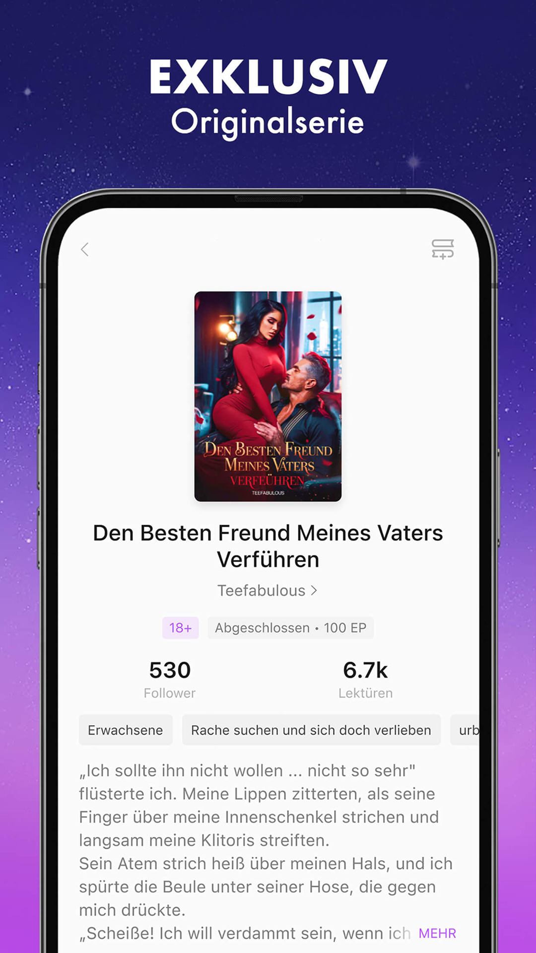 Entfliehen Sie mit Dreame in eine Welt voller Romantik! Mit unserer riesigen Sammlung von über 500.000 Romanen von Bestsellerautoren können Sie in eine Welt endloser Geschichten eintauchen. Von Romantik bis Fantasy, von Mystery bis Jugendliteratur, von Abenteuer bis Fanfic – wir haben alles! Verschlingen Sie Werwolf-Bestseller, spüren Sie die Leidenschaft von Alpha und treffen Sie Milliardärsbosse, die möglicherweise auch Mafia-Mitglieder sind. Was auch immer Ihr Geschmack ist, wir haben das perfekte Buch für Sie. Machen Sie sich bereit, Ihr nächstes Lieblingsbuch zu lesen – laden Sie Dreame jetzt herunter! Fesselnde Romane für unterwegs Es war noch nie einfacher, Ihre nächste Lieblingsgeschichte zu finden. Mit unserer umfangreichen Romansammlung wird Ihnen nie der Lesestoff ausgehen. Egal, ob Sie auf der Suche nach Bad-Boy-Romanzen, verbotener Liebe, Zwangsverheiratung, Beziehungen mit Altersunterschieden, Rachegefühlen oder Jungenliebe sind, bei Dreame finden Sie alles. Beginnen Sie noch heute mit der Erkundung unserer riesigen Web-Romanbibliothek. SCHNELLE UPDATES Mit den schnellen Updates von Dreame verpassen Sie nie wieder etwas. Erhalten Sie personalisierte Empfehlungen und entdecken Sie neue Bücher ganz nach Ihrem Geschmack. Behalten Sie außerdem den Überblick darüber, was Sie lesen möchten, und bleiben Sie über die neuesten Veröffentlichungen Ihrer Lieblingsautoren auf dem Laufenden. EINFACHES UND EINFACHES LESERLEBNIS Machen Sie das Lesen zu einem persönlichen Erlebnis mit den Anpassungsoptionen unserer App. Passen Sie Textgröße, Schriftart, Ränder und Textausrichtung nach Ihren Wünschen an. Wählen Sie außerdem zwischen Umblättern, Schieben oder Scrollen, um die Seiten auf eine für Sie natürliche Weise umzublättern. Und mit einstellbarer Helligkeit und Hintergrundfarben können Sie jederzeit und überall bequem lesen. VORTEILE FÜR DEN LESER Lassen Sie sich für Ihre Liebe zum Lesen mit dem Leservorteilsprogramm unserer App belohnen. Schalten Sie kostenlose Lesevorteile frei, indem Sie jeden Tag einchecken und Leseaufgaben erledigen. Treten Sie einer Community von über 100 Millionen Nutzern bei, die Ihre Leidenschaft für emotionales, immersives Storytelling teilen und am Ende jeder Episode Ihre Kommentare hinterlassen. FOLGEN SIE UNS Folgen Sie uns auf Instagram, Facebook und Twitter, um über Ihre Lieblingsgeschichten, Autoren, Wettbewerbe und mehr auf dem Laufenden zu bleiben! 1. Offizielle Website --->> http://www.dreame.com 2. FB--->> Dreameofficial 3. INS/Twitter--->> dreamestory
