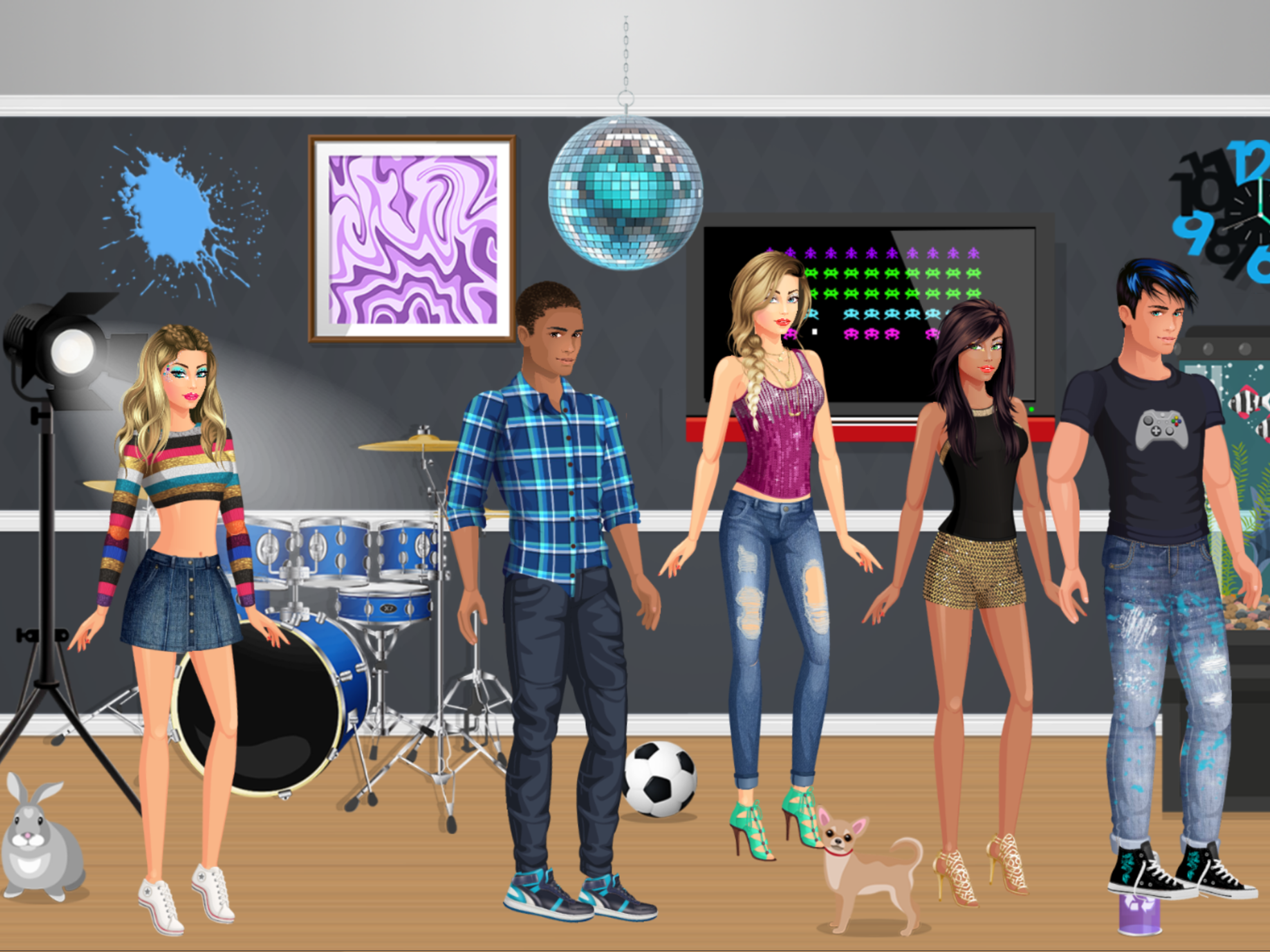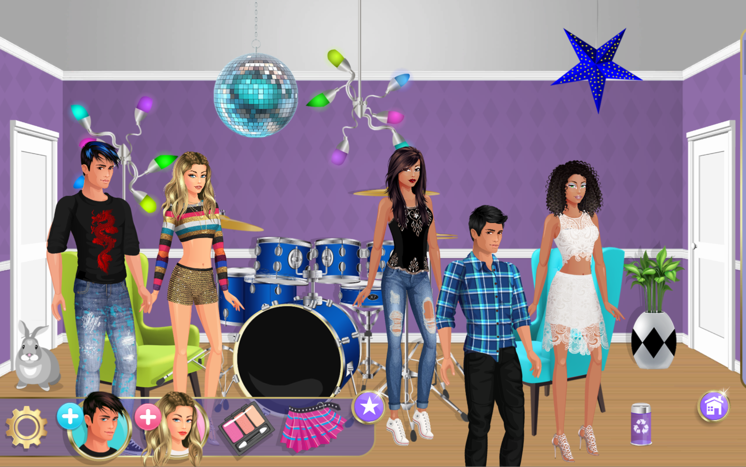 Then move into your dreamy bedroom, gorgeous bling living room and cool kitchen, where you get to choose from trendy paint colors and wallpaper, and decorate with windows, curtains, lamps, beds, sofas, cushions, tables, dressing tables, flowers, artwork, clocks, candles, food (yes, even pizza and sushi), gaming and electronics (cool guitars and stereos), and MUCH MUCH MUCH MUCH more.