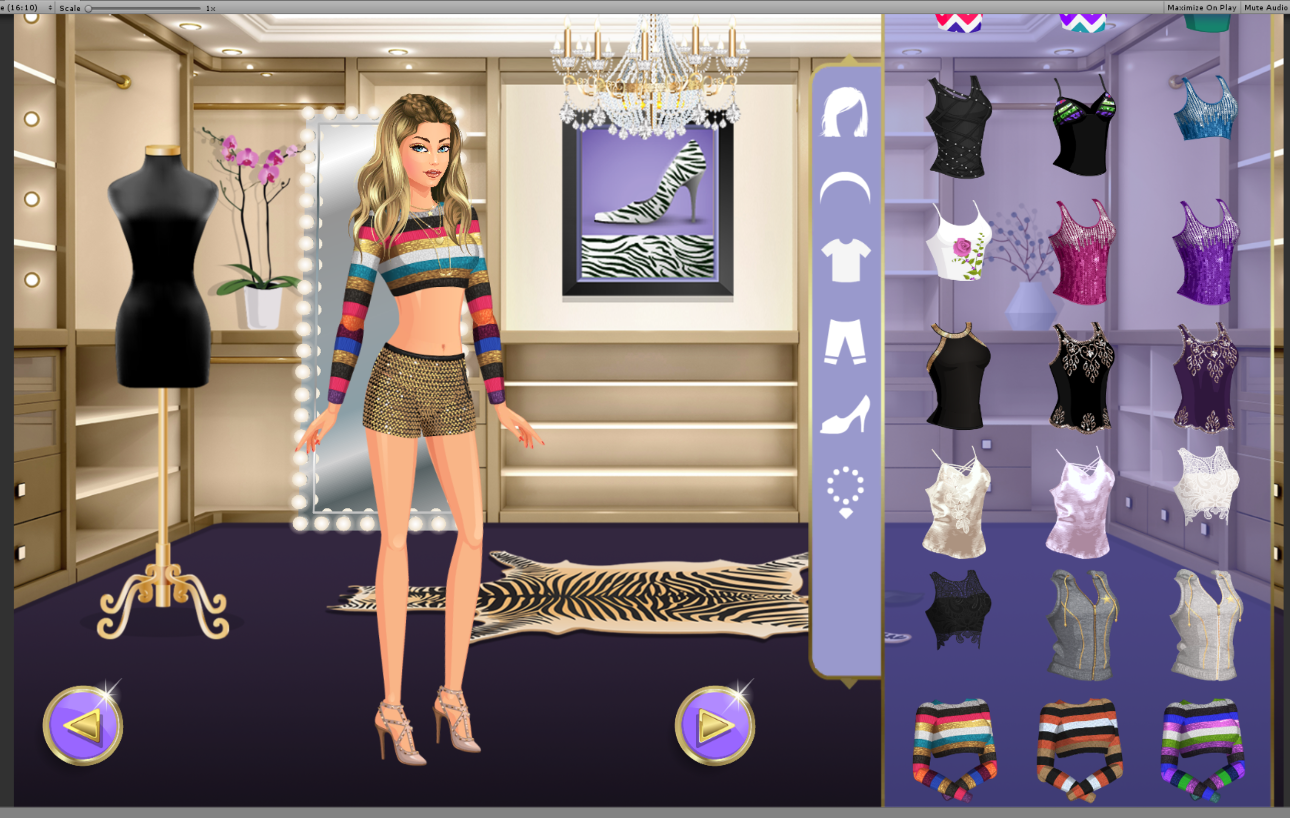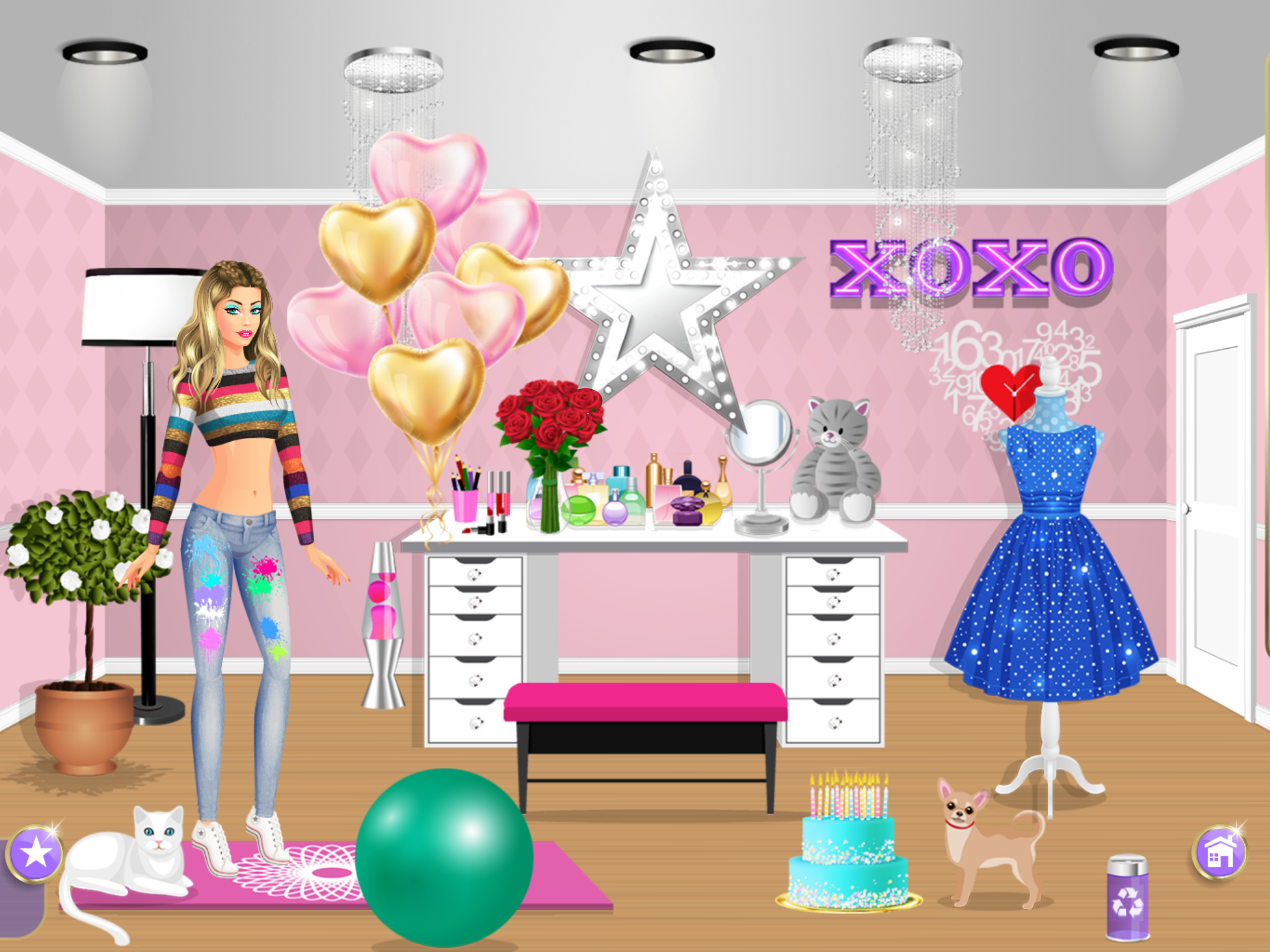 Once your rooms are decorated, head over to your dressing room and pick today's outfit to dressup in from cute tops, pants, shoes dresses earrings necklaces and glasses. Don't forget your makeup to complete your stunning fashion makeover. Make up with thousands of make-up combinations!!! Glittery eyeshadow, shiny lip gloss, hair make overs and more!!