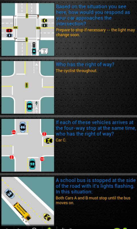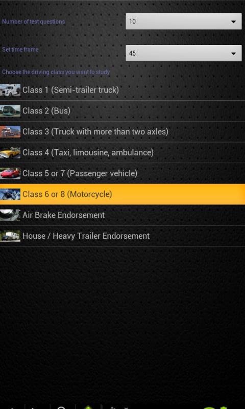 First time driving? Moving to Canada - BC? Career as a driver? Want to drive again? Or a license for pleasure? This app will suit your needs. It helps you to prepare for the written part of the Learners license application. The app contains all the classes you need to obtain a driving license in BC, Canada. Record shows that most people using this app only need less than 15 minutes to finish the real test. The practice test consists of totally hundreds to thousands multiple choice questions derived from "Learn to Drive Smart" and other manuals, on which the test is based. Questions have been collected from multiple reliable resources such as Richmond Public Library, Rocky Mountain Pro Drivers Inc. (Cranbrook), CSTT Driver Training (Victoria), or Albion Driver Training (Victoria). You can use this application to practice answering the same multiple choice questions that may appear on the real driving exam, or simply test your knowledge about driving theories and be a smart driver. Keep practice makes perfect! * Please note the app doesn't mean to be a study guide for your theory test. We encourage users to review the books as well - Class 1 (Semi-trailer truck): Semi-trailer trucks and all other motor vehicles or combinations of vehicles except motorcycle. To get your commercial vehicle licence, you need to study Driving Commercial Vehicles, take the appropriate knowledge test, practice driving under a Learner’s licence, and take the commercial road test. - Class 2 (Bus): Buses, including school buses, special activity buses and special vehicles. Trailers or towed vehicles may not exceed 4,600 kilograms except if the bus and trailers or towed vehicles do not have air brakes. Any motor vehicle or combination of vehicles in Class 4. - Class 3 (Truck with more than two axles): Trucks with more than 2 axles, such as dump trucks and large tow trucks, but not including a bus that is being used to transport passengers. Trailers may not exceed 4,600 kilograms except if the truck and trailers do not have air brakes. A tow car towing a vehicle of any weight. A mobile truck crane. Any motor vehicle or combination of vehicles in Class 5. - Class 4 (Taxi, limousine, ambulance): (Restricted) Taxis and limousines (up to 10 persons including the driver), Ambulances. Special vehicles with a seating capacity of not more than 10 persons (including the driver) used to transport people with disabilities. Any motor vehicle or combination of vehicles in Class 5. - Class 5 or 7 (Passenger vehicle): Passing your Class 5 road test is the very last step in graduated licensing. You might also take the Class 5 road test if: (1) you\'ve moved to B.C. with a licence from another country, (2) your licence has been expired for more than three years, or (3) you\'re taking a re-examination requested by the Office of the Superintendent of Motor Vehicles. - Class 6 or 8 (Motorcycle): The Class 8 road test is the first of two road tests that less experienced drivers must take to qualify for a full-privilege, Class 6 motorcycle licence. - Air Brake Endorsement: There are two types of air brake endorsements: (1) On-highway — You need this endorsement if you have a B.C. driver\'s licence and want to drive air brake equipped vehicles on a highway. A highway includes all roadways that can be used by the general public. (2) Off-highway (industrial) — You need this endorsement if you want to operate air brake equipped vehicles on industrial roads. An industrial road is most often a road used for transporting natural resources. Example: a logging road. - House \ Heavy Trailer Endorsement: Recreational (house) trailers exceeding 4,600 kg, when the trailer or truck towing it does not have air brakes. Trailers or towed vehicles exceeding 4,600 kilograms provided neither the truck nor trailer has air brakes. Any motor vehicle or combination of vehicles in Class 5.
