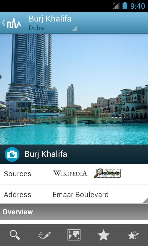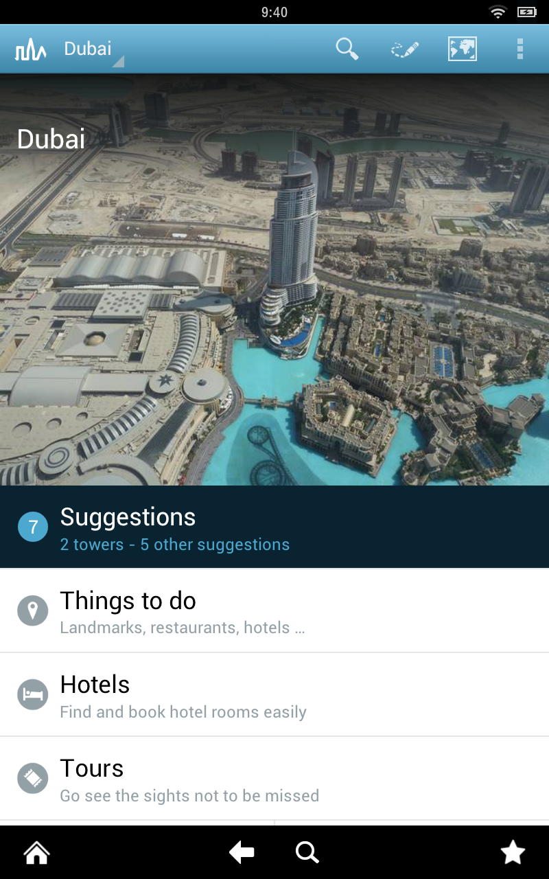 The Dubai travel guide is a complete and up to date city guide. It works offline, you don't need an internet connection.