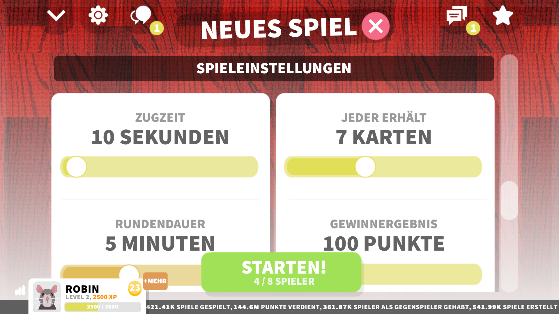 Das Online-Spiel „DUO mit Freunden“ ist ein herausforderndes Spiel mit unbegrenztem Spielspaß. Das DUO-Kartenspiel ist eine erweiterte Version des UNO-Spiels mit neuen Turnieren, Regeln, Spielmodi, Spezialkarten und vielem mehr. Es ist fast identisch mit dem UNO-Multiplayerspiel, aber es können bis zu 8 Spieler spielen. Du kannst mit deiner Familie und deinen Freunden spielen, für doppelt so viel Spaß. ZIEL DES ONLINE-UNO-SPIELS: Der erste Spieler, der in jeder Runde alle Karten auf der Hand ausspielt, erhält die Punkte für die Karten, die seine Gegner noch auf der Hand haben. Der erste Spieler, der 100 Punkte erreicht, gewinnt das Spiel. WIE SPIELT MAN DAS DUO-KARTENSPIEL? Wenn man eine Karte ausspielen möchte, dann muss sie mit der Zahl, der Farbe oder der Art der obersten Karte des Ablagestapels übereinstimmen. Oder man kann eine Sonderkarte ausspielen. Wenn der Spieler keine passende Karte hat, dann muss er eine Karte vom Ziehstapel nehmen. Du kannst die gezogene Karte spielen, wenn sie mit der letzten Karte des Ablagestapels übereinstimmt. Ansonsten ist der nächste Spieler dran. Das Online-Kartenspiel kann vollständig angepasst werden. Du entscheidest in deiner eigenen Lobby, wie viele Punkte die Spieler benötigen, um zu gewinnen, wie viele Karten man am Anfang bekommt, welche speziellen Uno-Karten es im Kartenstapel gibt usw. Lege fest, wie viele Karten jeder Art es im Kartenstapel gibt! Mehr Sonderkarten oder mehr „Aussetzen“ Karten? Du hast die Wahl! Passe deinen Kartenstapel an und mache das Spiel noch unterhaltsamer! SPIELBEREICHE: Schnelles Spiel: Spiel gegen einen zufälligen Spieler in einem schnellen Online-Spiel, um eine Münze zu gewinnen. Shop: Wählen deine Karten-Skins, Spielerleiste, Soundeffekte und Konfetti-Effekte Spiel erstellen & Freunden anschließen: Suche nach Spielen oder lade Freunde zu deinem Multiplayerspiel mit eigenen Regeln ein! DUO-SPIELMODI: Das sind spannende Modi, die ein Interesse aufrechterhalten. „Ziehen bis es passt“ Spielmodus: Wenn du am Zug bist und eine Karte ziehst, dann musst du so lange ziehen, bis du eine spielbare Karte ziehst. Zahlendurcheinander: Alle Zahlenkarten ändern ihre Zahlen, wenn „Retour" oder „Aussetzen" gespielt wird. 7-0 Spielmodus: Wenn du eine „7“ spielst, dann kannst du alle Karten in deiner Hand mit einem anderen Spieler tauschen und wenn du eine „0“ spielst, dann müssen alle Spieler die Karten in ihrer Hand an den nächsten Spieler weitergeben Duo-Spielmodus: In diesem Modus gibt es doppelseitige Karten mit einer „hellen" Seite und einer „dunklen" Seite. Zu Beginn spielt man mit der hellen Seite, aber wenn jemand eine Flip-Karte ausspielt, dann muss man mit der dunklen Seite spielen, mit härtere Strafen. Team Play-Modus: Hier kannst du mit einem Team spielen. Die Punkte der Teammitglieder werden zusammengezählt. Die Runde endet, wenn nur noch ein Team Karten hat. SONDERKARTEN: Das DUO-Spiel enthält genauso wie die UNO-Kartenspiele einige besondere Karten. „Finde 0“ Sonderkarte: Der nächste Spieler muss so lange ziehen, bis er eine Karte mit der Nummer „0“ zieht. „Karten tauschen“ Sonderkarte: Der Spieler tauscht alle seine Karten mit dem nächsten Spieler. „Doppelt“ Sonderkarte: Der nächste Spieler muss so viele Karten ziehen, wie er auf der Hand hat. „Zahlendurcheinander“ Sonderkarte: Die Zahlen aller Zahlenkarten werden zufällig festgelegt. „Beobachter“ Sonderkarte: Die Karten aller Spieler werden für 5 Runden aufgedeckt DUO KARTENSPIEL FUNKTIONEN: 🃏 Interessantes und kompetitives Spiel 🃏 Strategie-basiertes Online-Multiplayerspiel 🃏 Verschiedene Modi und Aktionskarten 🃏 Ermöglicht die Erstellung eines privaten Raums für Freunde oder Familie 🃏 Die Spielgegenstände sind anpassbar 🃏 Spiele mit Spielern aus der ganzen Welt und mit Facebook-Freunden 🃏 Sonderkarten und Bestenlisten 🃏 Entspannendes Spieldesign mit niedlichen Avataren 🃏 Kostenloses Kartenspiel mit unbegrenztem Spaß DUO Online: https://duowfriends.eu/