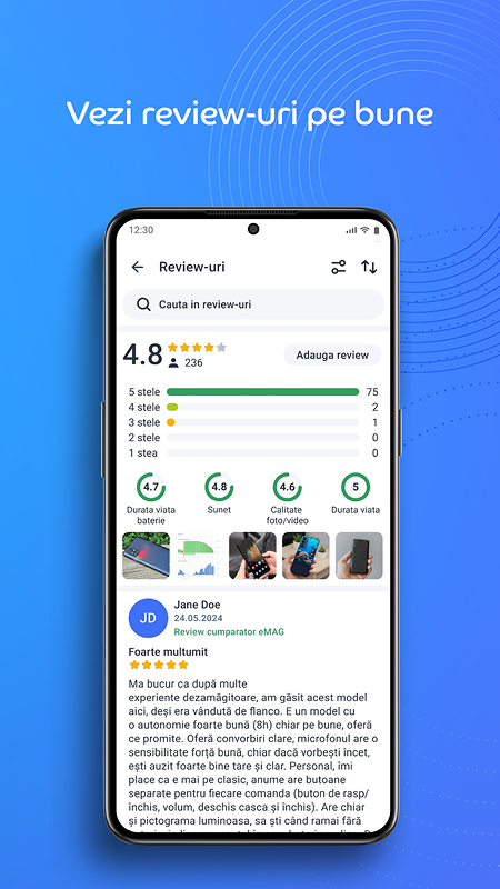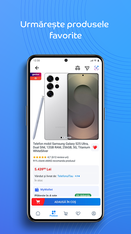 Mit der eMAG-App hört die Suche nie auf! Wo immer Sie sind, bestellen Sie schnell und sicher – von Gadgets und Haushaltsgeräten über Spielzeug, Kosmetik- und Schönheitsprodukte oder Nahrungsergänzungsmittel, Bücher, Modeartikel, Accessoires oder Tiernahrung bis hin zu RCA. Über 22 Millionen Produkte nur einen Klick entfernt! Warum die eMAG-App wählen? Einfacher, schneller und intelligenter einkaufen - Suchen Sie schnell mit eMAG Snap! Lade einfach ein Bild hoch! - Sie erhalten sofortige Benachrichtigungen, wenn Ihre Lieblingsprodukte Rabatte haben oder wieder auf Lager sind. - Sie haben schnellen Zugriff auf die größten Shopping-Events: Black Friday, Price Revolution, Crazy Season und viele weitere Angebote. - Problemlos einkaufen – speichern Sie Ihr Schließfach sowie Ihre Lieblingskarten und bezahlen Sie schnell für Ihre nächste Bestellung. Sorgenfreies Einkaufen - Kundenrezensionen – treffen Sie ohne Zweifel eine fundierte Entscheidung. - Kostenloser Versand, verlängerte Rückgabefrist von 30 bis 60 Tagen und Sonderangebote mit dem Genius-Abonnement. - Jetzt kaufen und später in festen Raten zahlen. - Zusätzliche Garantien und Nachkaufservices – Sicherheit bei jedem Schritt. Sie zahlen, wie Sie wollen und wann Sie wollen - Jetzt bestellen und später über My Wallet bezahlen: - In 4 oder 6 Raten mit 0 % Zinsen; - In 12, 24 oder 36 festen Monatsraten – Sie haben die Wahl! Alles an einem Ort Rechnungen, Bestellungen, Garantien und Lieblingsprodukte – immer zur Hand, direkt in Ihrem Konto. Laden Sie die eMAG-App herunter und genießen Sie unbegrenztes Einkaufen!