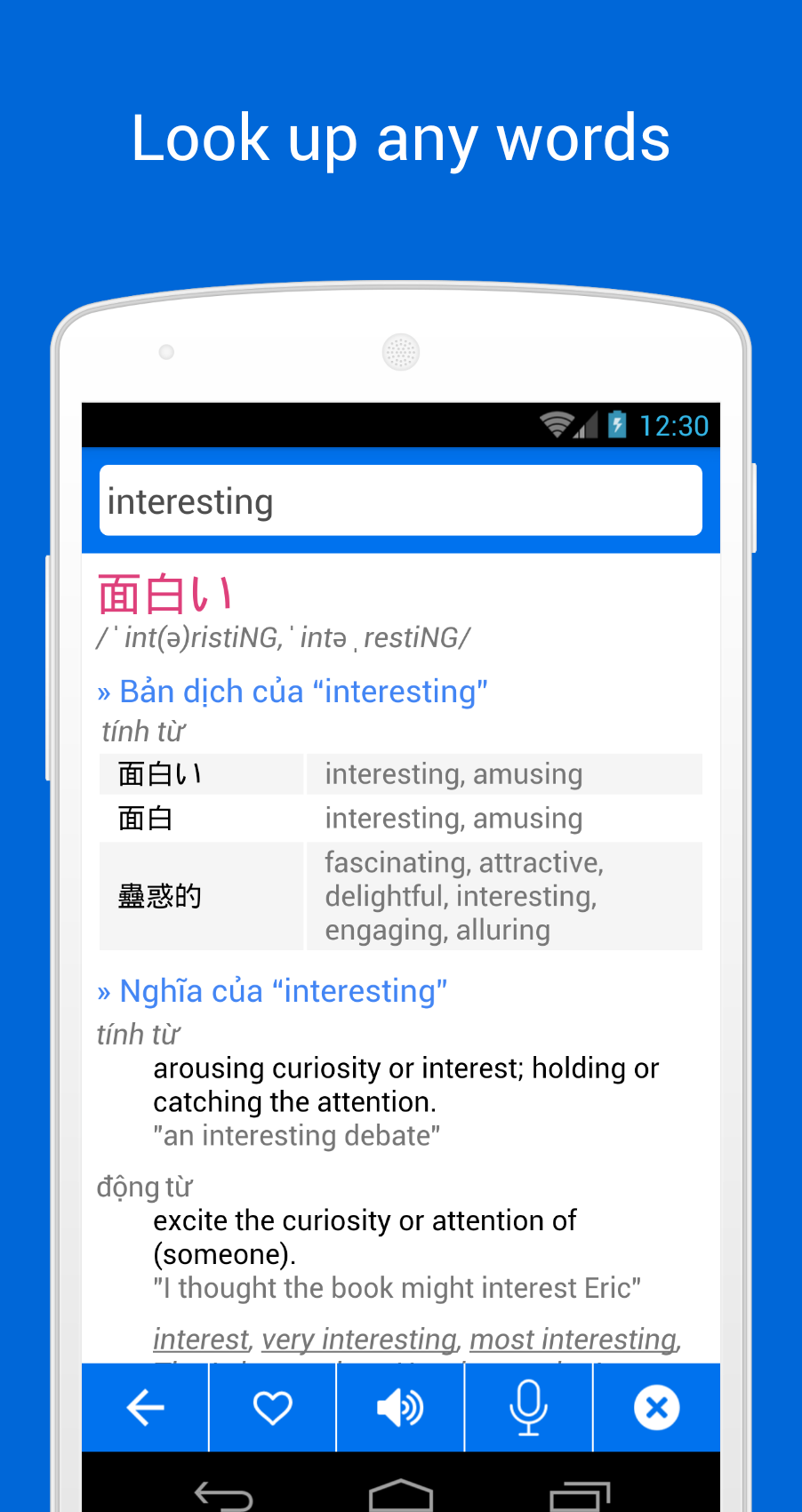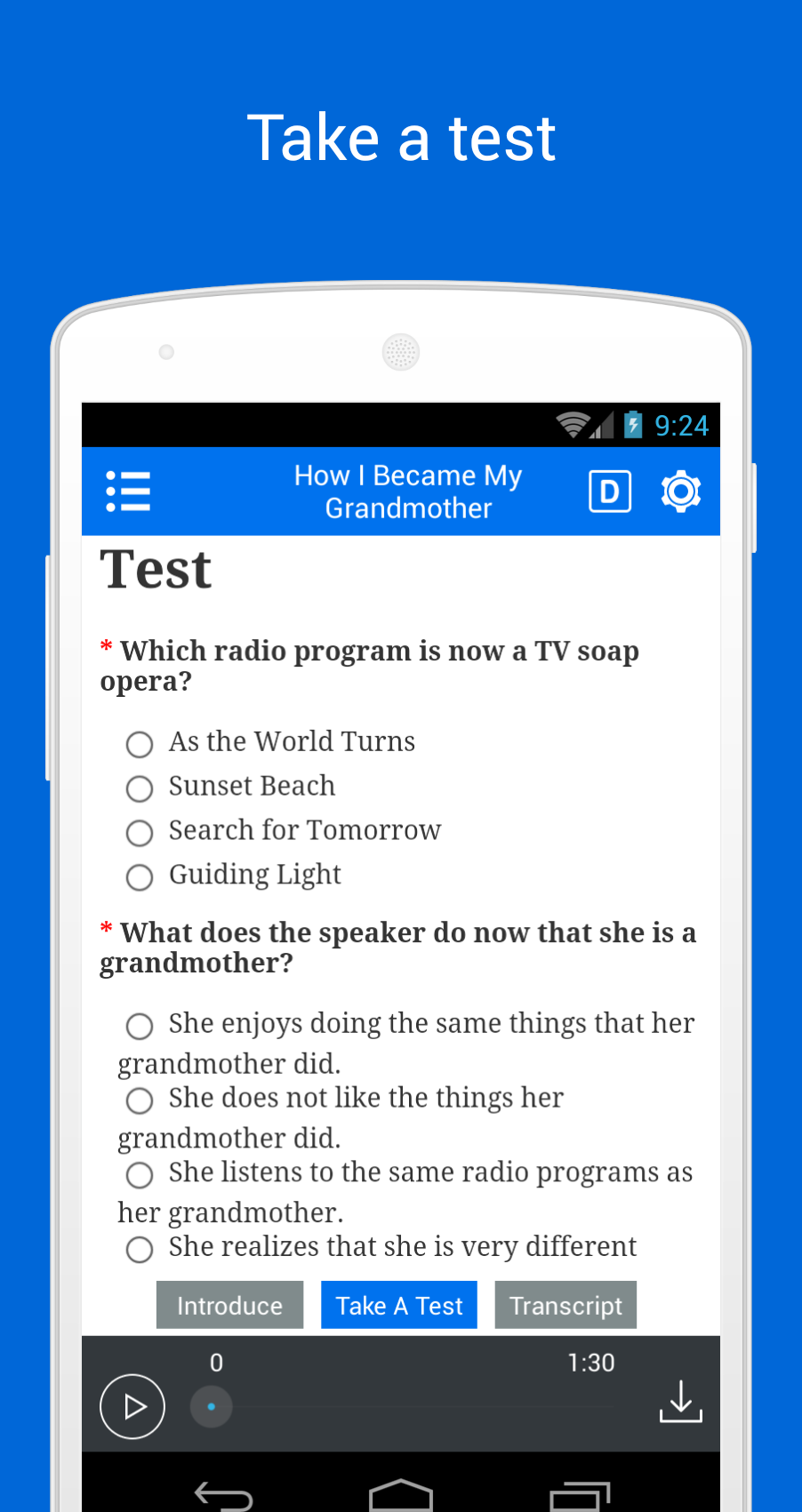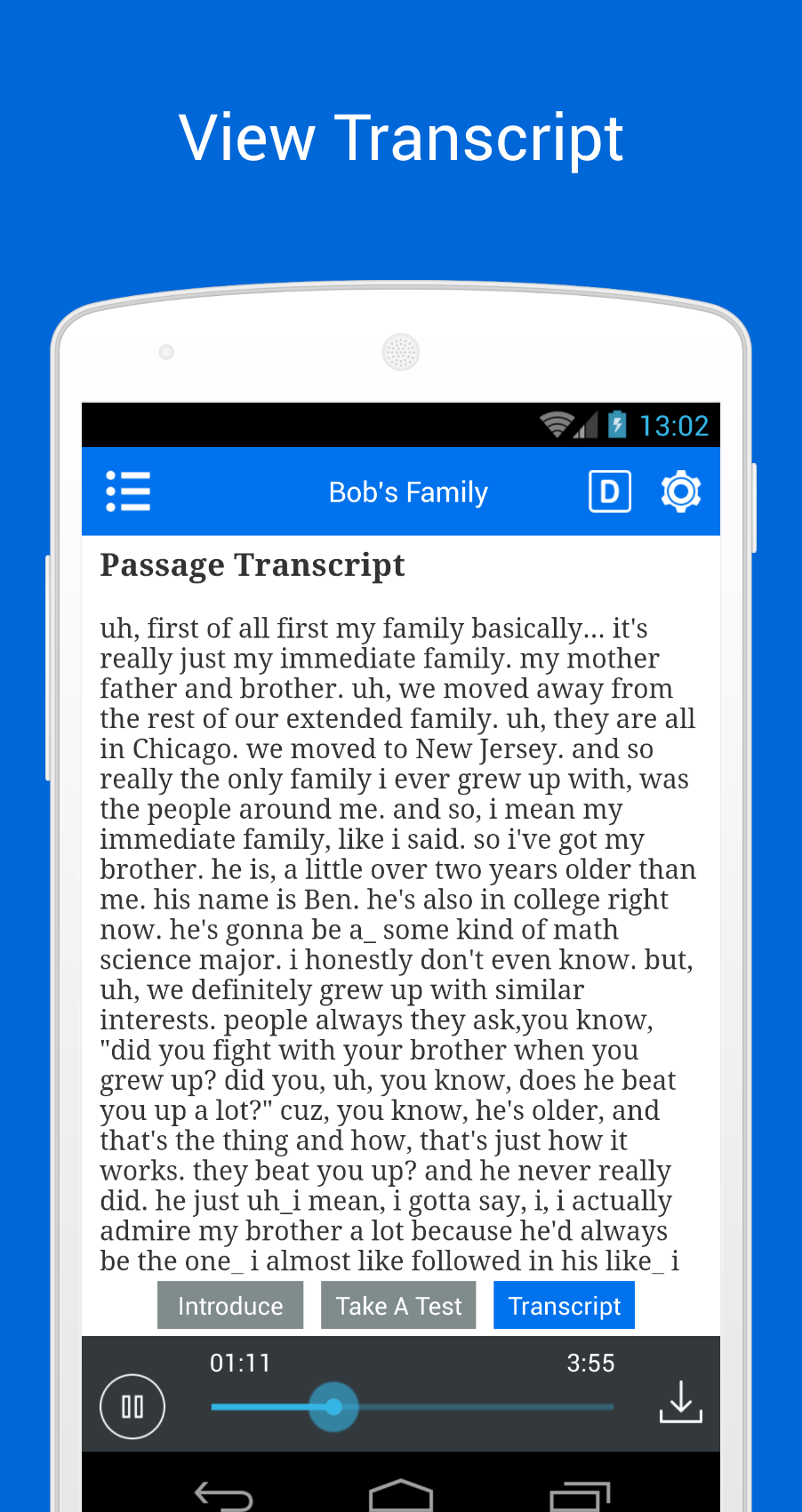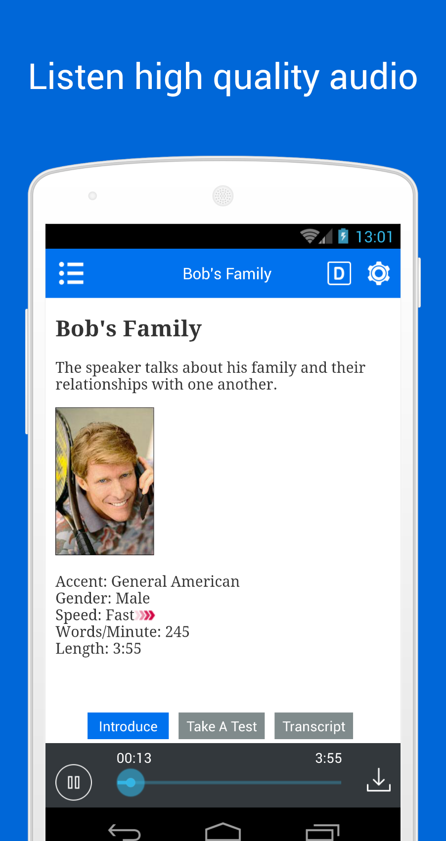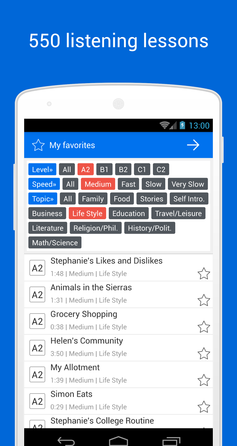 ✪ This app includes 550 listening lessons. Each lesson comes with high quality audio, transcript and quiz. These lessons are divided into: ✓ 5 levels of difficulties: A2,B1,B2,C1,C1 ✓ 4 speeds of reading: Medium, Fast, Slow, Very Slow ✓ 12 topics : Family, Food, Stories, Self Intro., Business, Life Style, Education, Travel/Leisure, Literature, Religion/Phil., History/Polit., Math/Science ✪ Advanced features: ✓ To know the meaning of any words, you just click on it. Immediately, the app will translate it into your native language. ✓ Add new words to your vocabulary. ✓ Support more than 100 languages. ✓ Free download to use when you're offline. ✓ Support English Dictionary. ✓ Simple and easy to use.